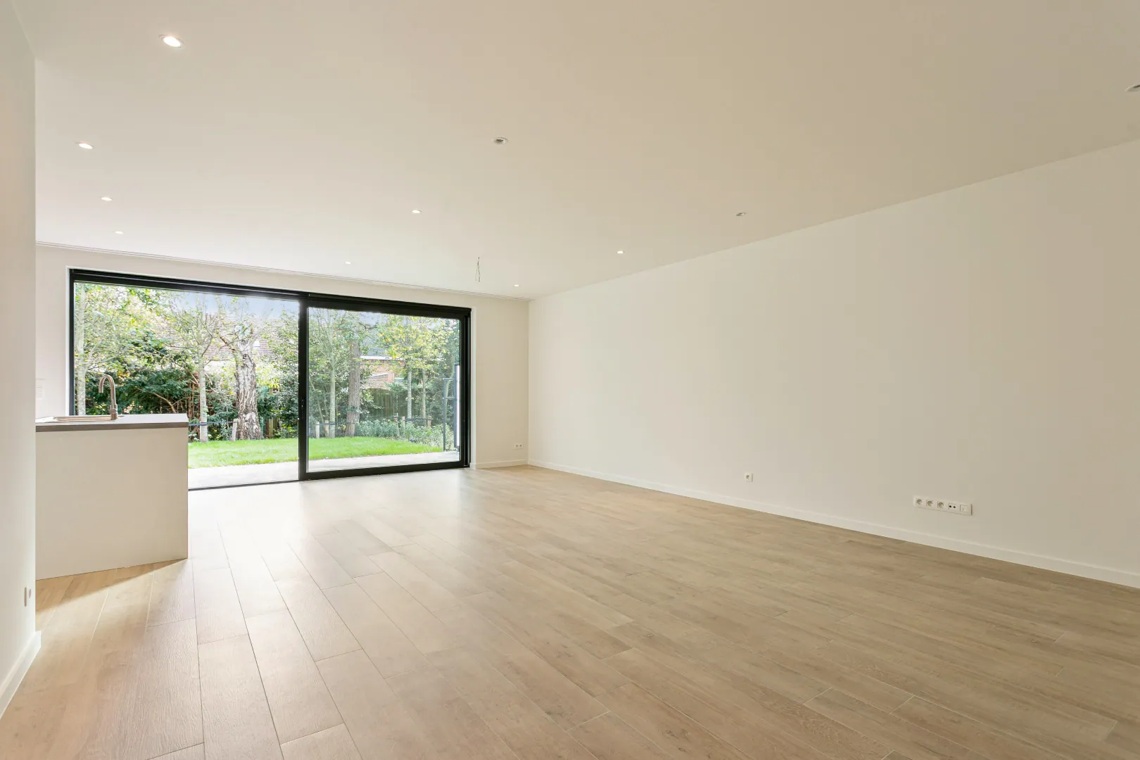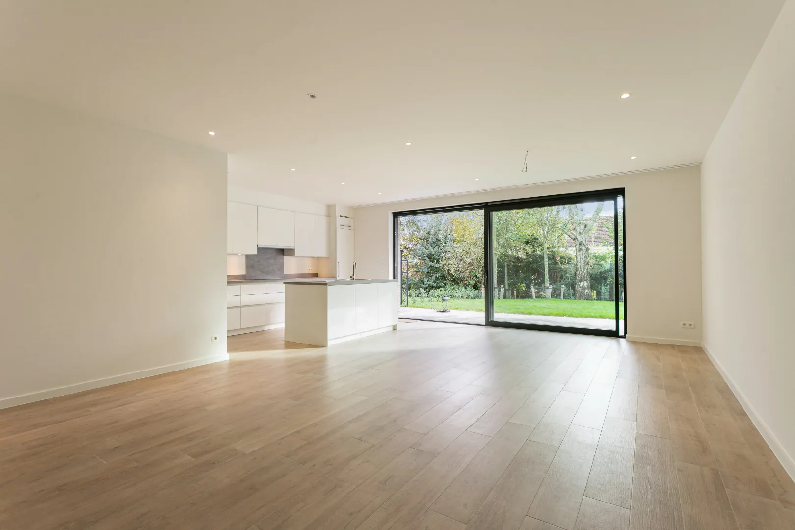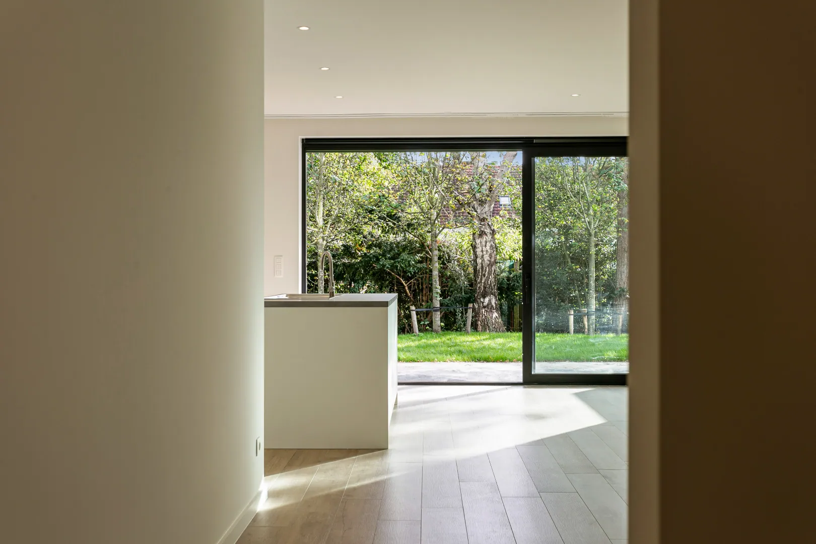 Via de inkomhal bereik je de ruime leefruimte met open keuken die toegang biedt tot de Zuid-Oost tuin.