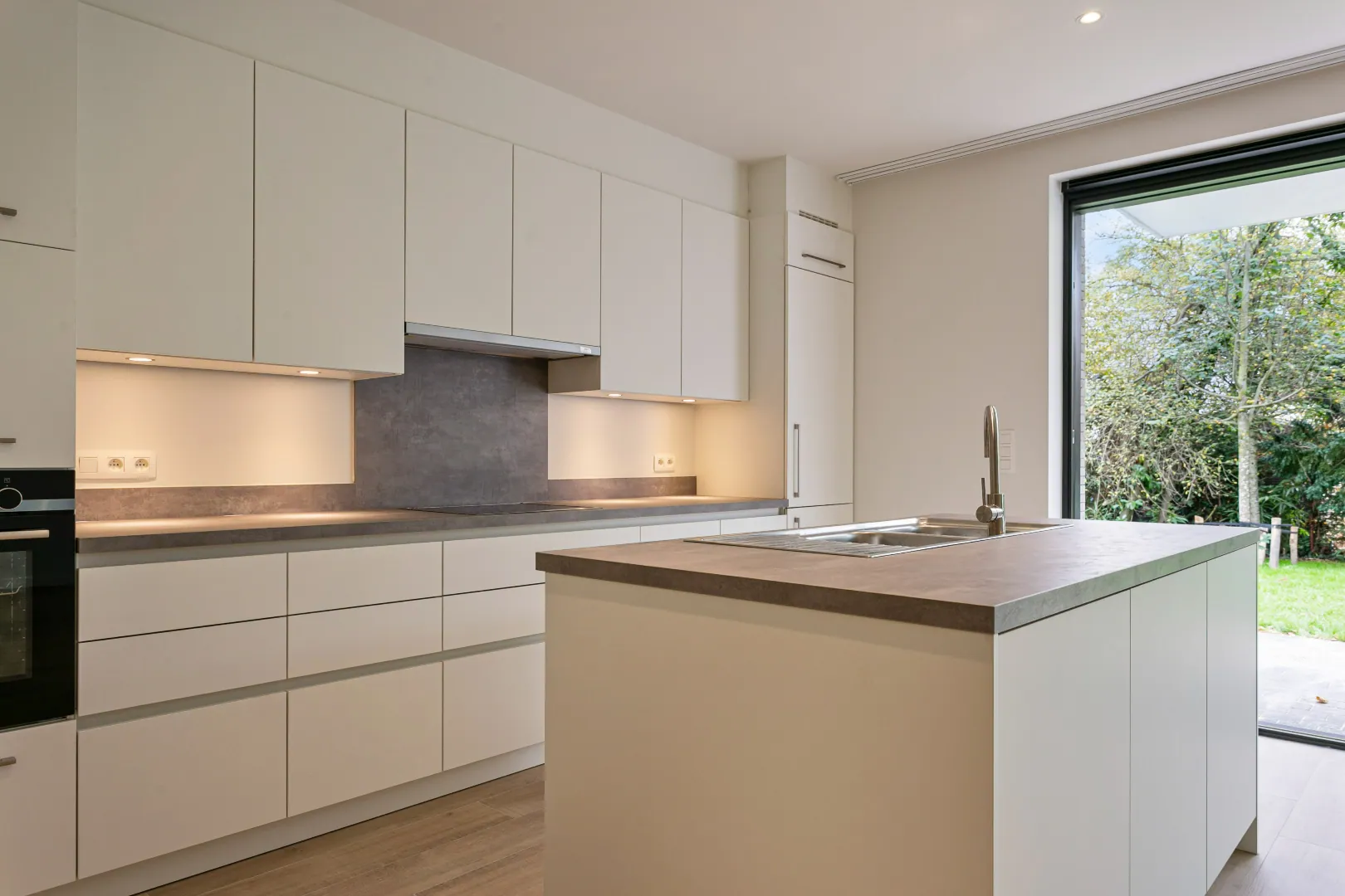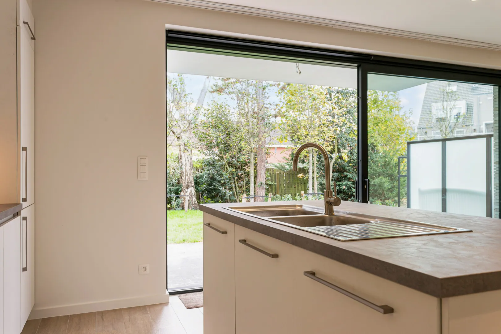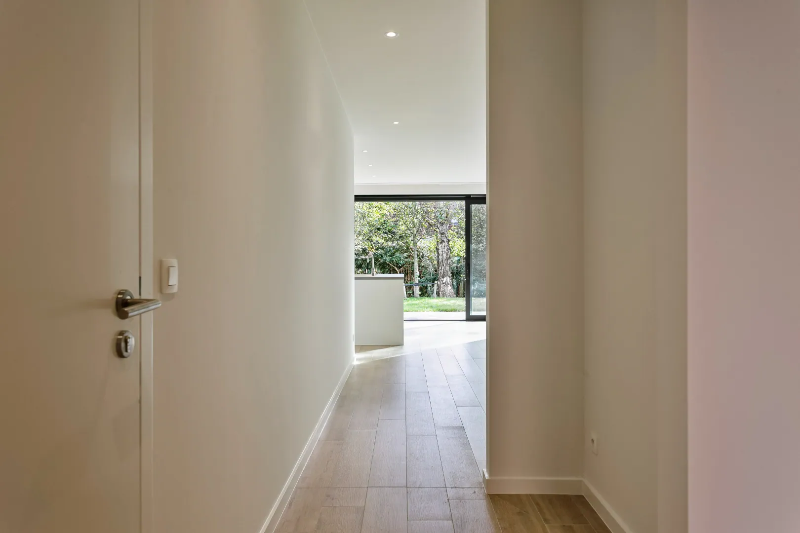 Via de inkomhal bereik je de ruime leefruimte met open keuken die toegang biedt tot de Zuid-Oost tuin.