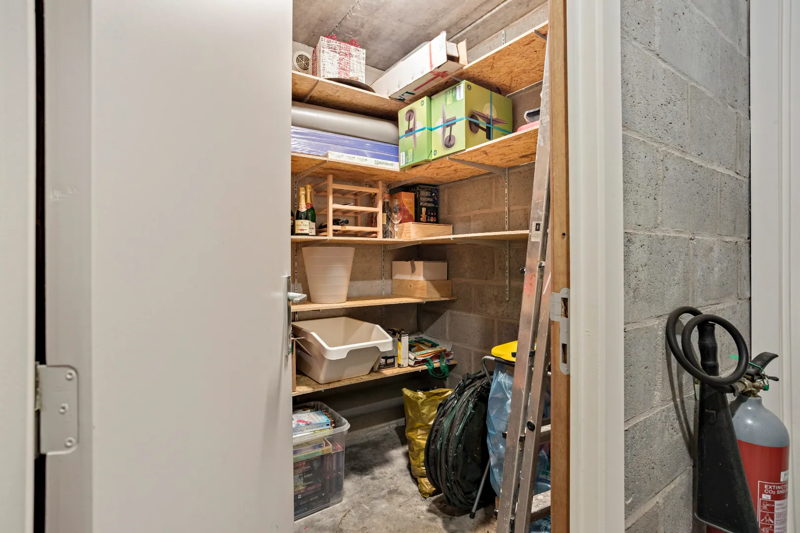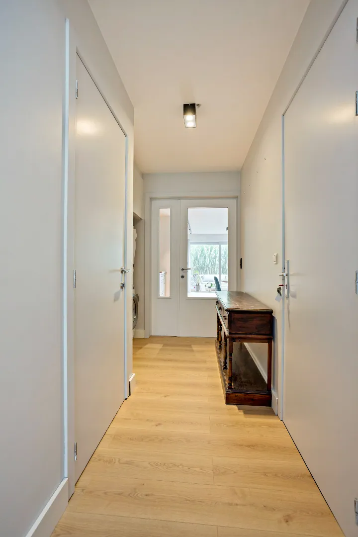 Dit appartement (met lift) betreedt u via de inkomhal met gastentoilet, inbouwkast en aparte bergplaats. Verder is er een lichtrijke woonkamer met open keuken en een ingemaakte kast/bureau dat ideaal is voor thuiswerk. Het grote schuifraam brengt ons naar het terras. Het appartement beschikt over één slaapkamer met open badkamer met douche en een extra aparte kelderberging.