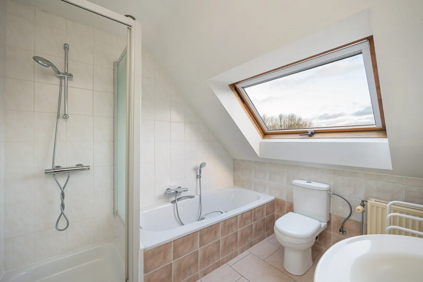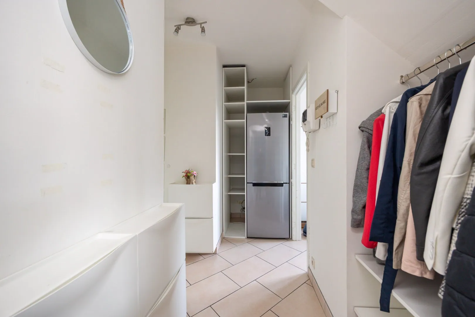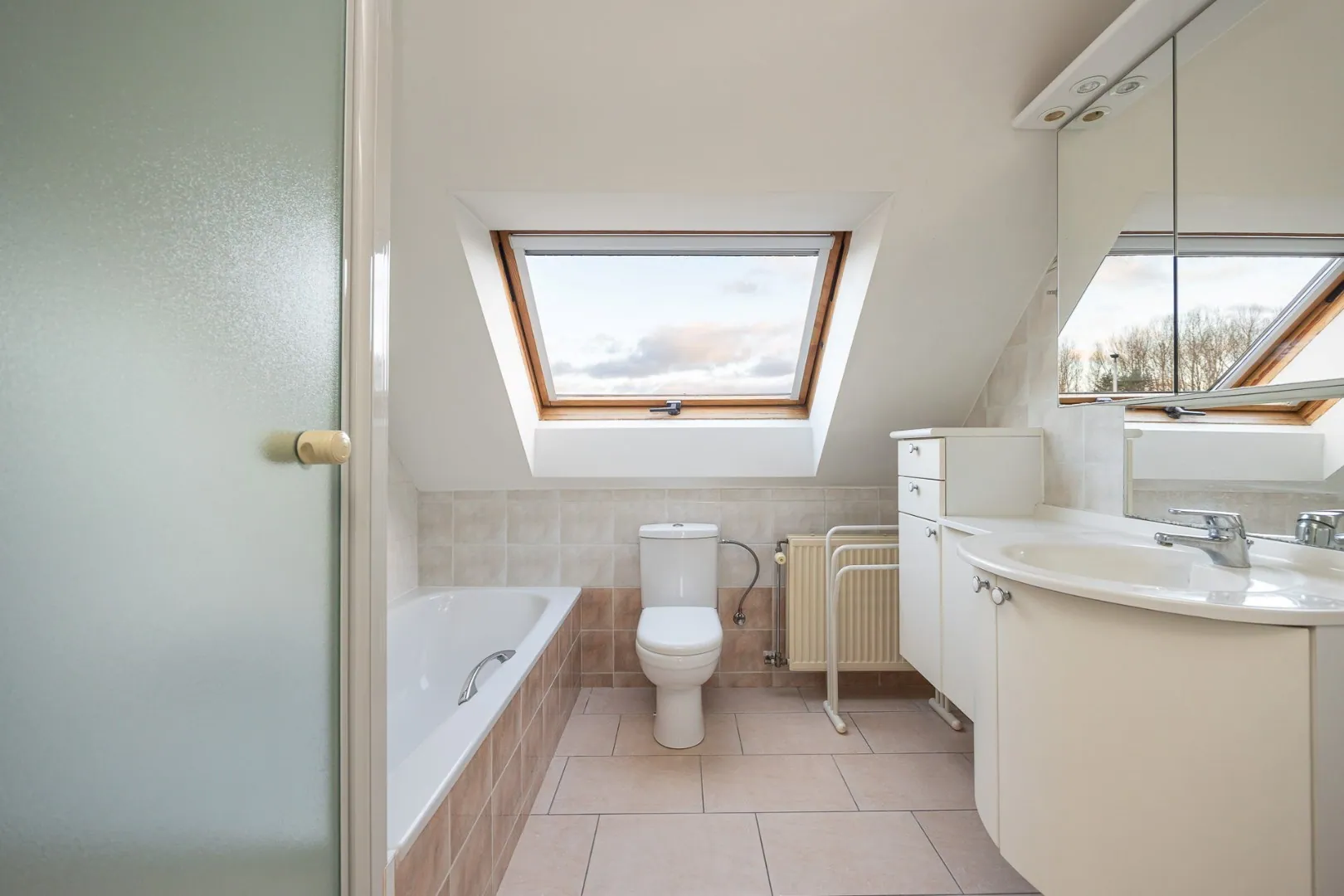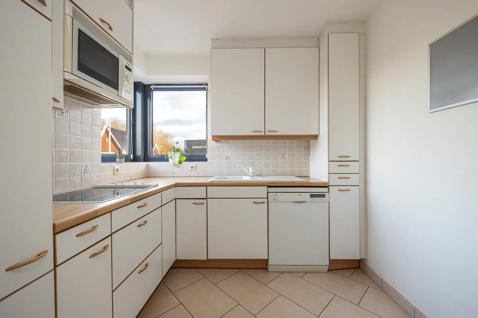 We betreden het appartement in de inkomhal met opbergruimte en vestiaire, ideaal voor het opbergen van schoenen en jassen. Aansluitend vinden we de keuken, leefruimte en eerste toilet. De keuken is voorzien van koelkast met diepvriesvak, microgolf en vaatwas. De lichtrijke leefruimte (25m²) heeft aansluitend een balkon. Vervolgens brengt de mooie houten trap ons naar het eerste verdiep met de slaapkamer en badkamer. De ruime badkamer is voorzien van zowel bad als douche en een tweede toilet. In de badkamer is een aansluiting voor wasmachine en droogkast.
