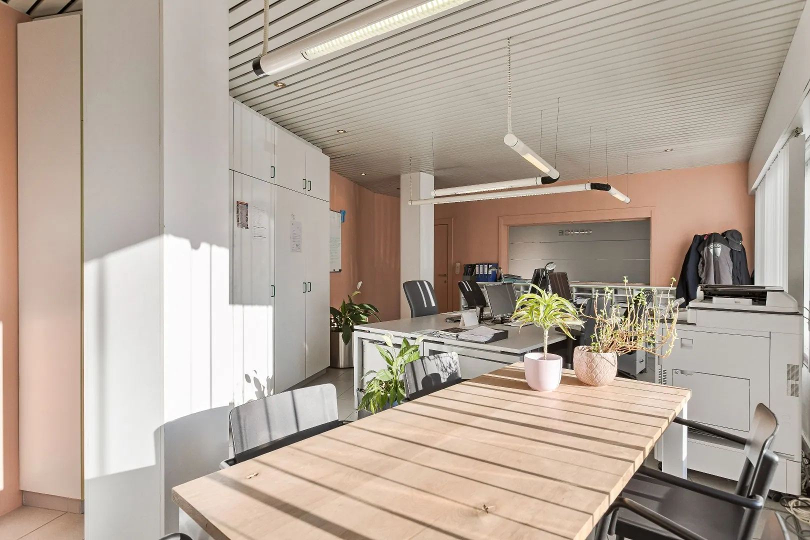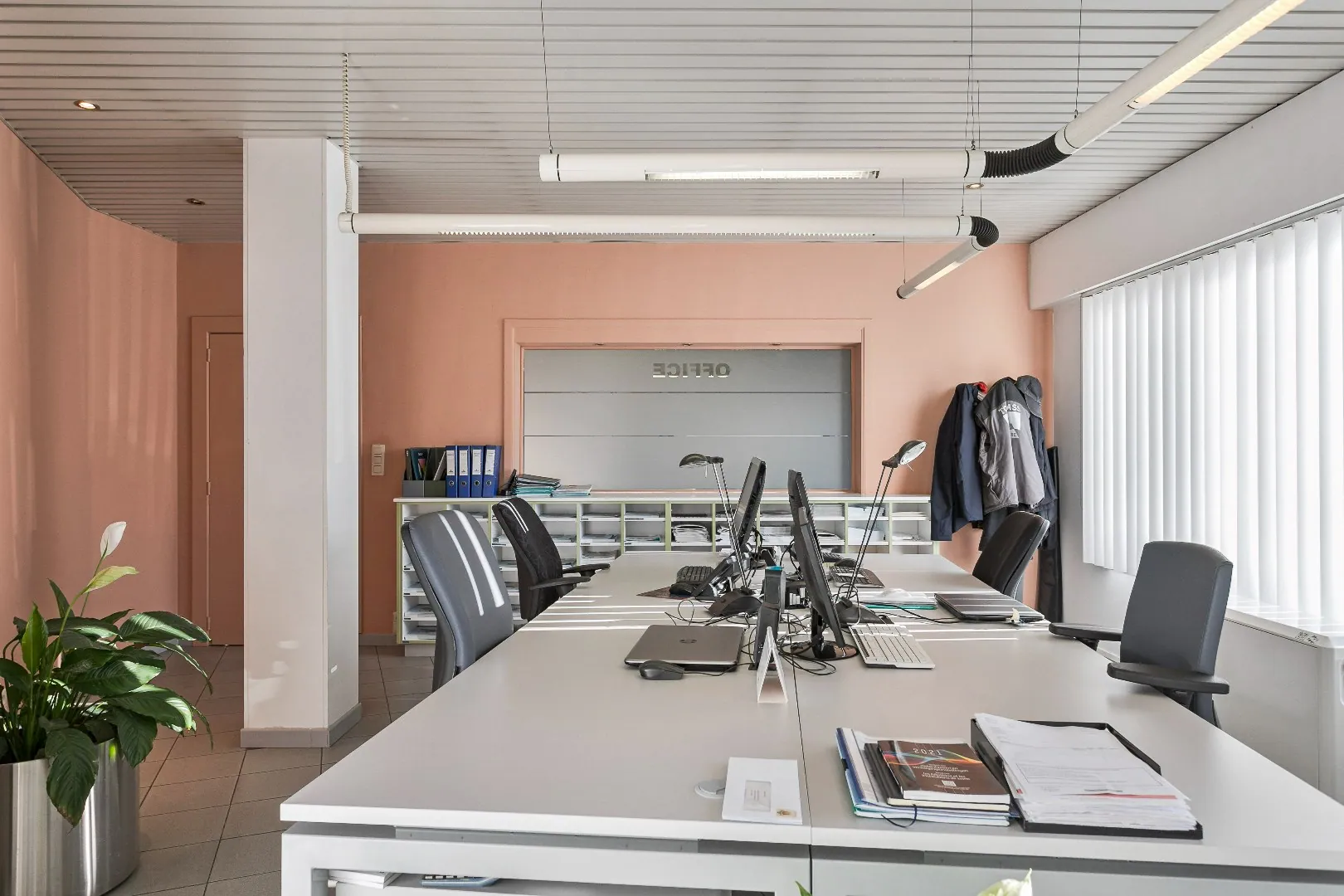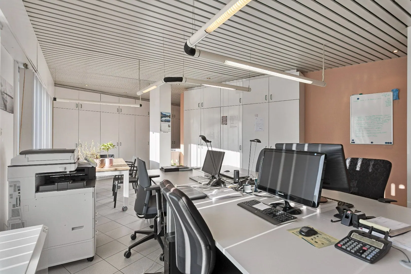Op het gelijkvloers vinden we de moderne inkomhal/wachtruimte, 2 burelen met luxueuze afwerking en een ruime magazijnruimte met gladde betonvloer, lichtstraten en sectionale poort.