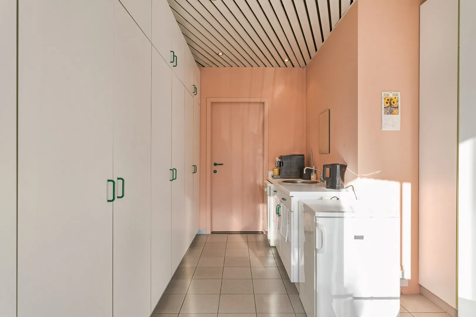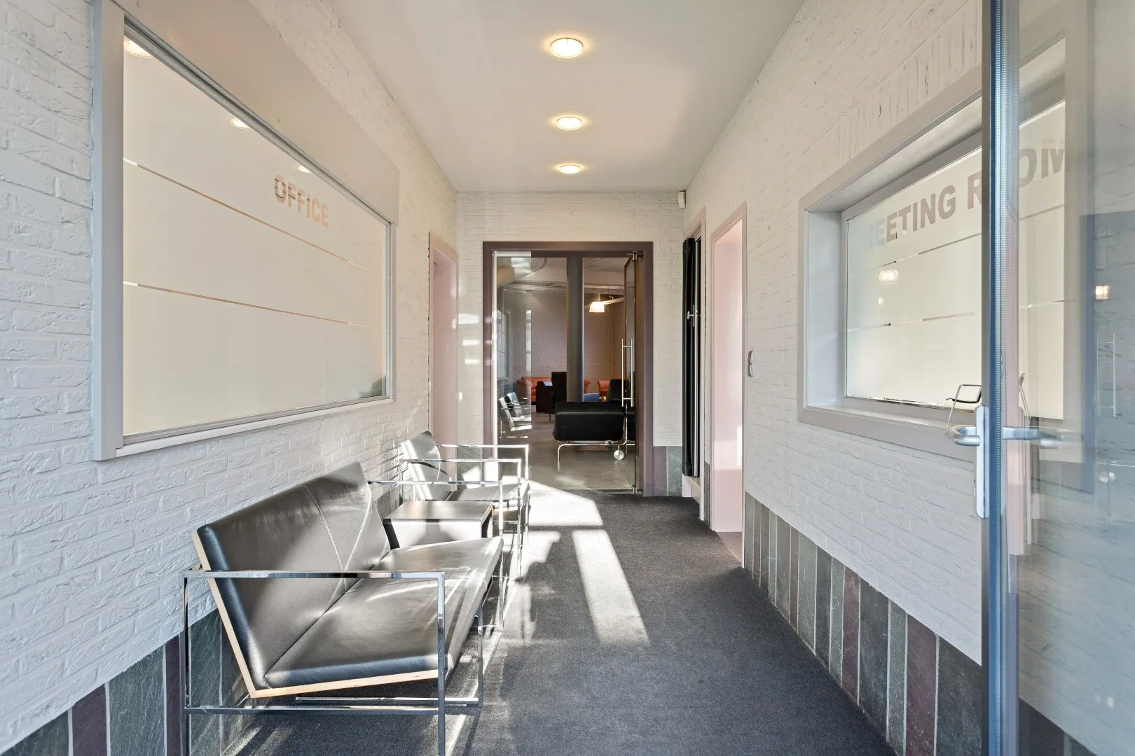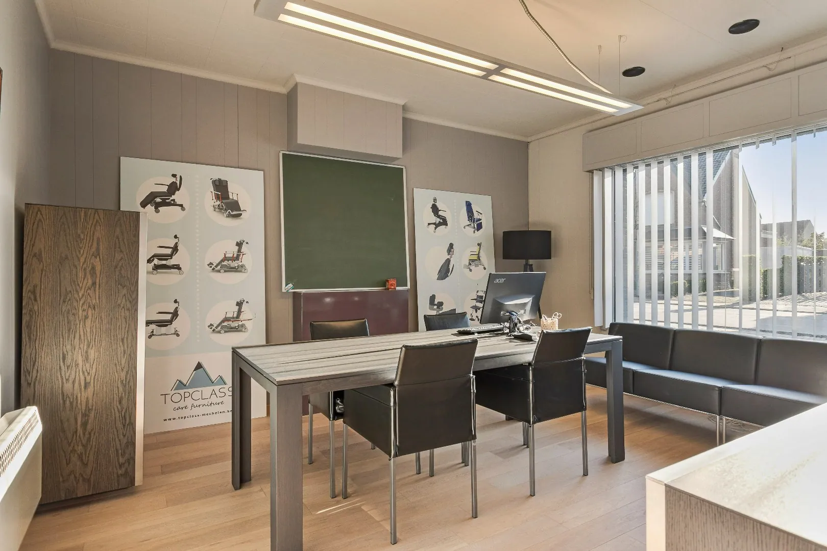 Op het gelijkvloers vinden we de moderne inkomhal/wachtruimte, 2 burelen met luxueuze afwerking en een ruime magazijnruimte met gladde betonvloer, lichtstraten en sectionale poort.