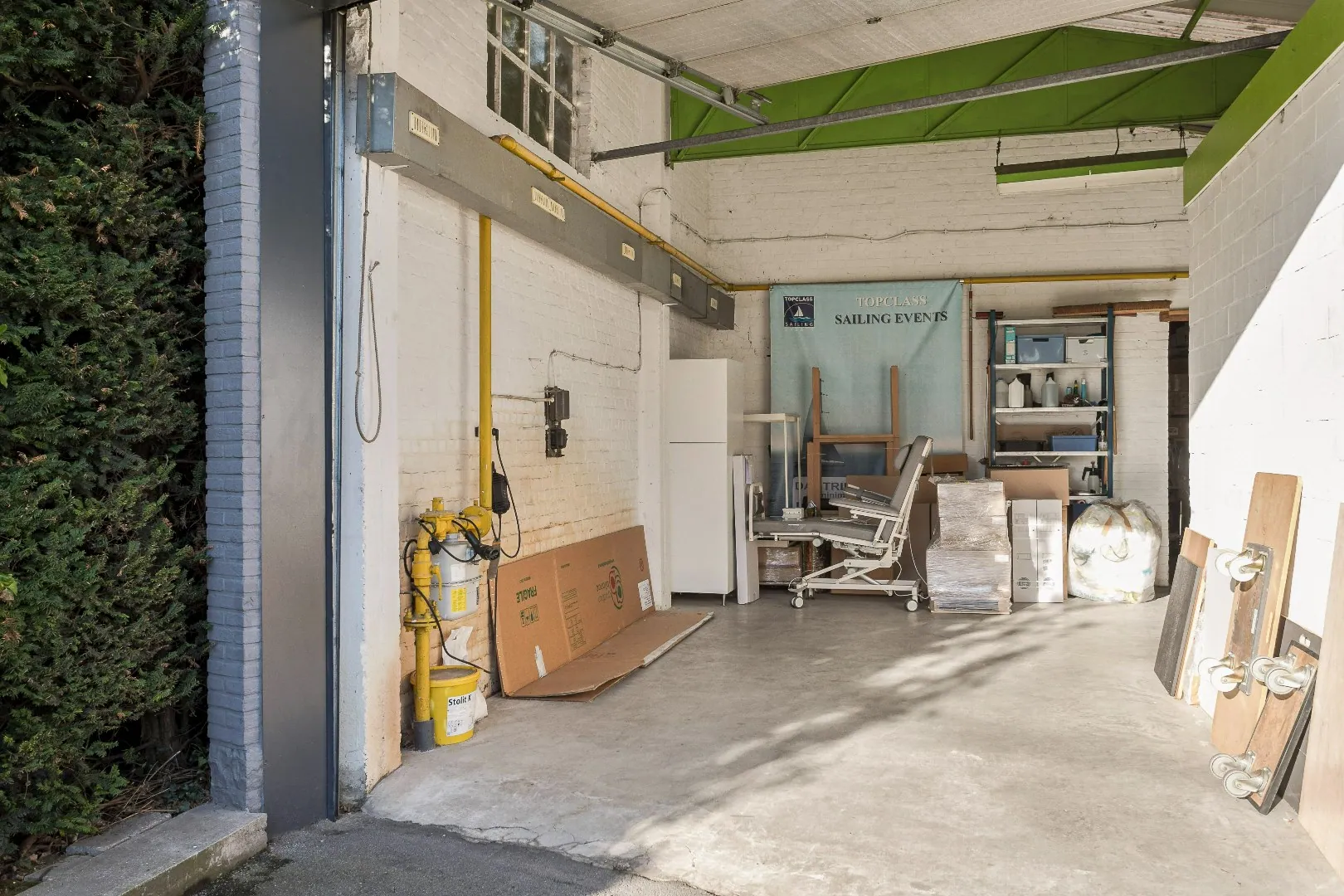 Magazijn met kantoorruimte, autostaanplaatsen en gerenoveerd appartement Verhuurd