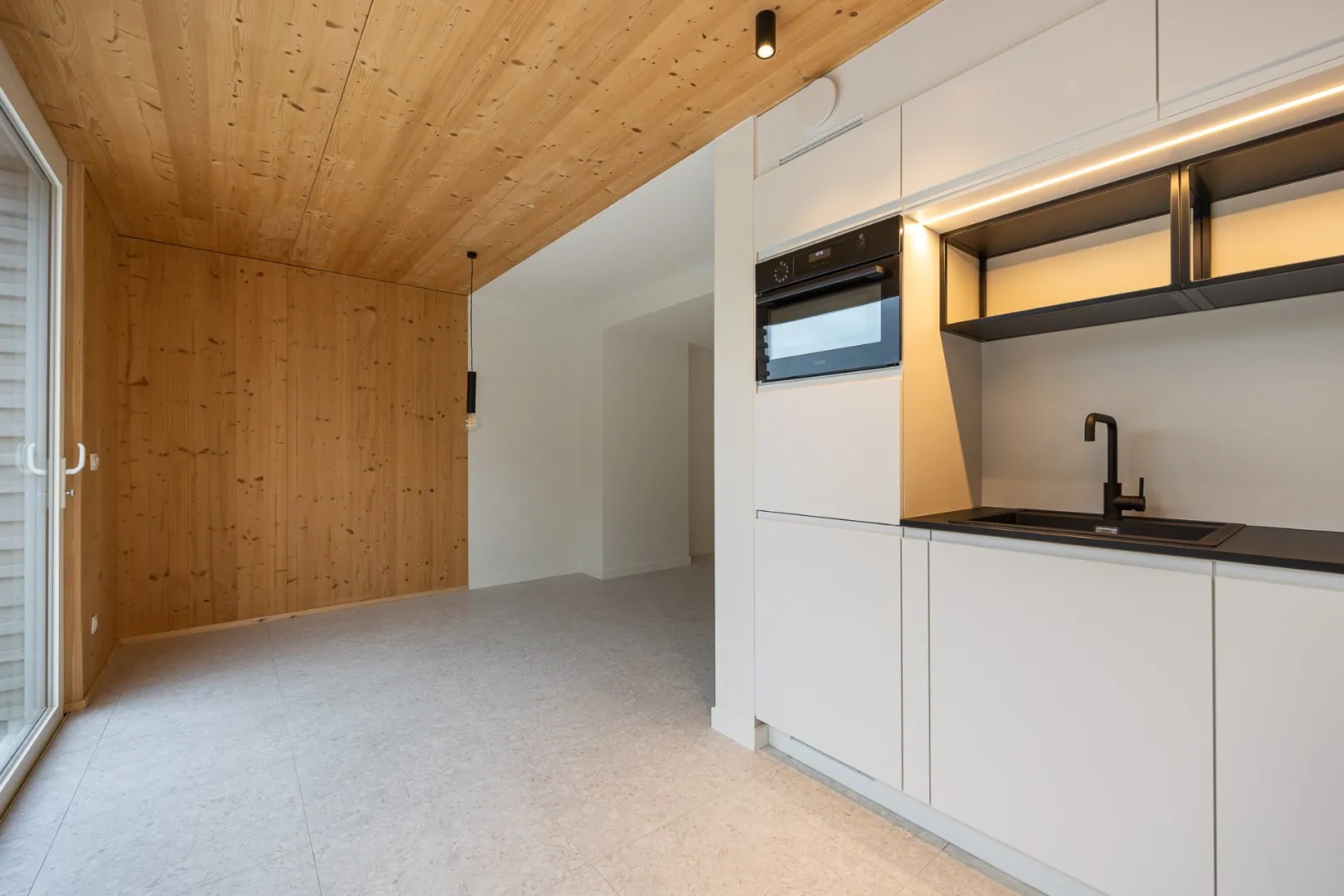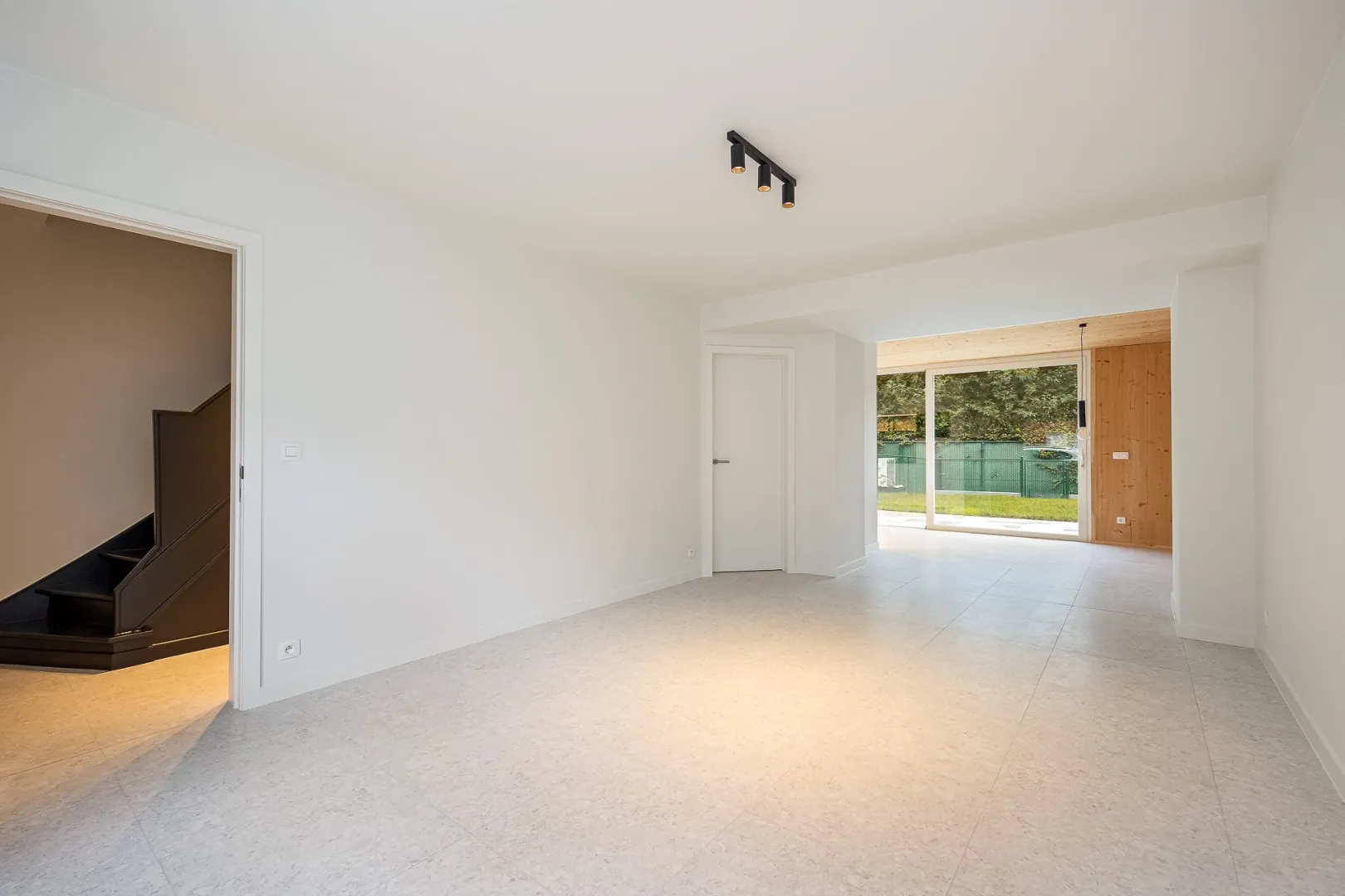 We betreden de woning in de inkomhal die ons naar de zeer lichtrijke leefruimte met nieuwe open keuken brengt. Zowel vanuit de leefruimte als de keuken heb je meteen zicht op de nieuw aangelegde tuin.