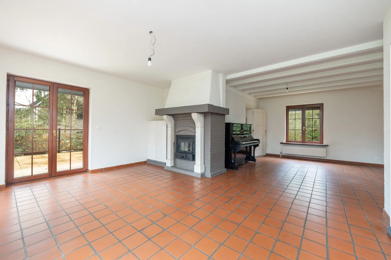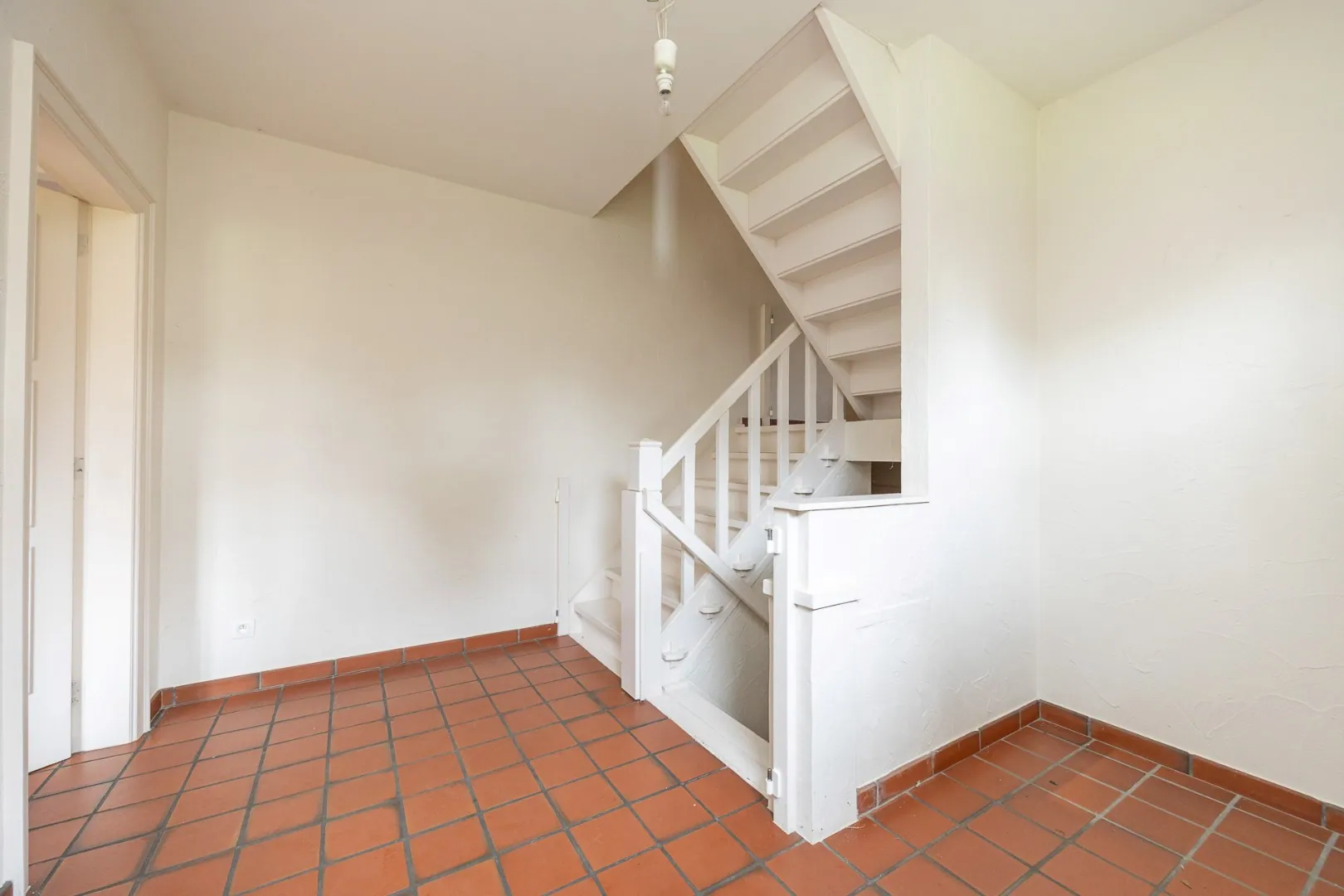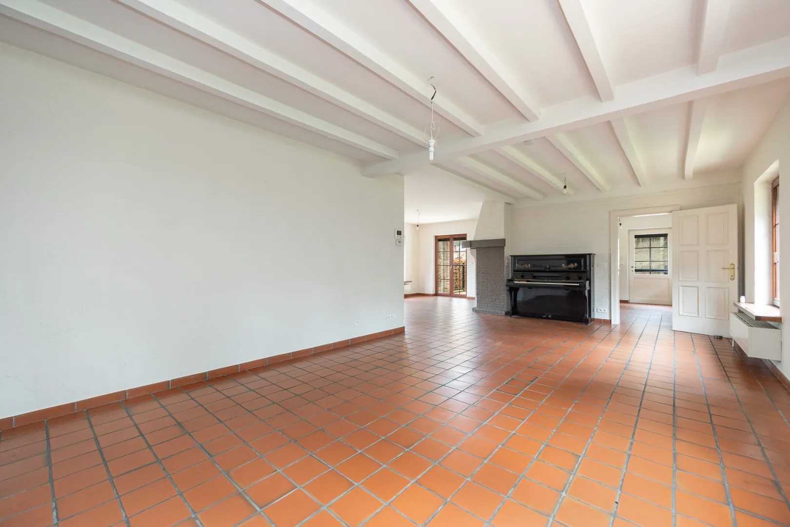 We betreden deze woning in de inkomhal die ons naar de ruime en lichtrijke leefruimte met aansluitende keuken brengt.