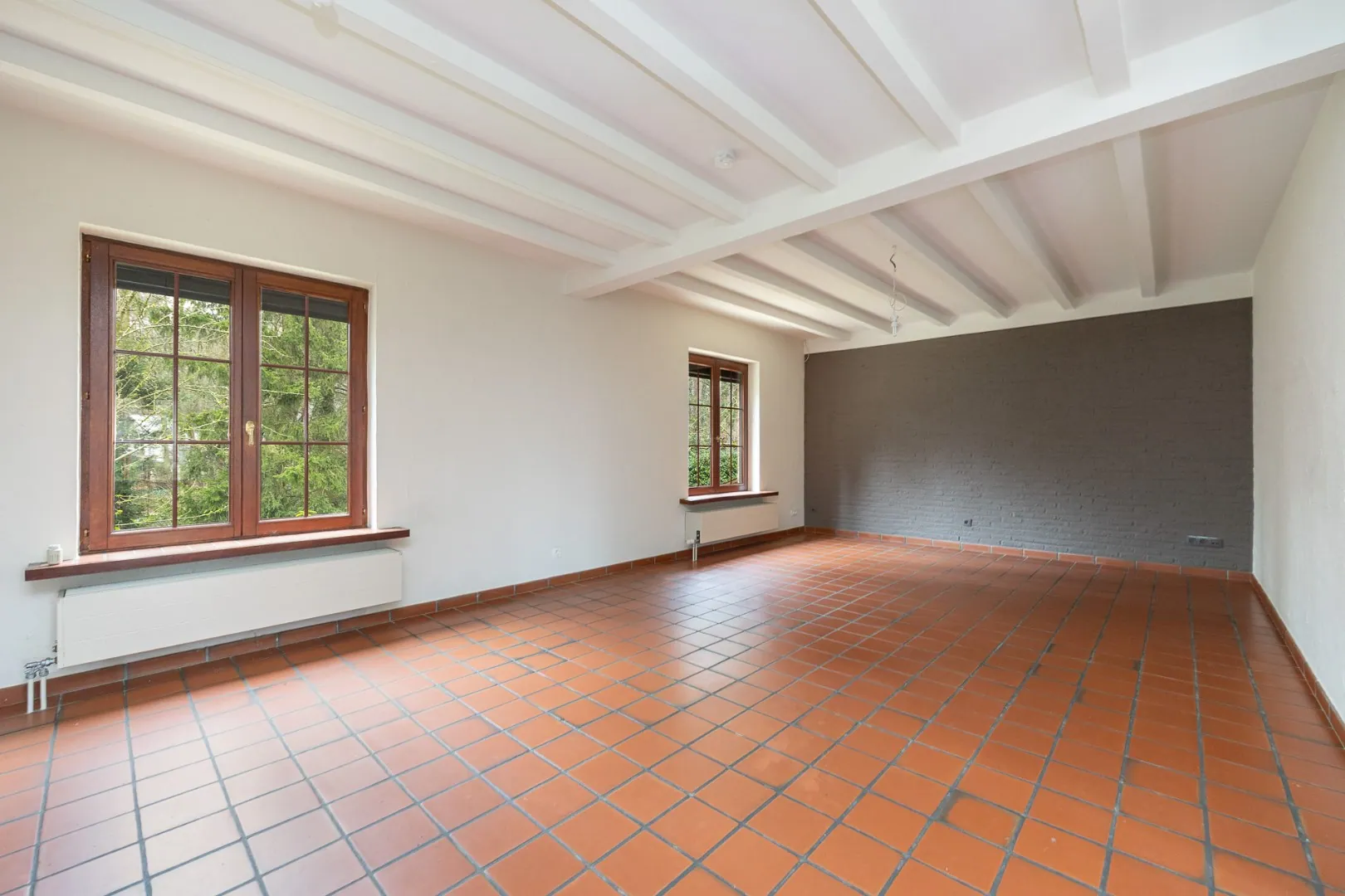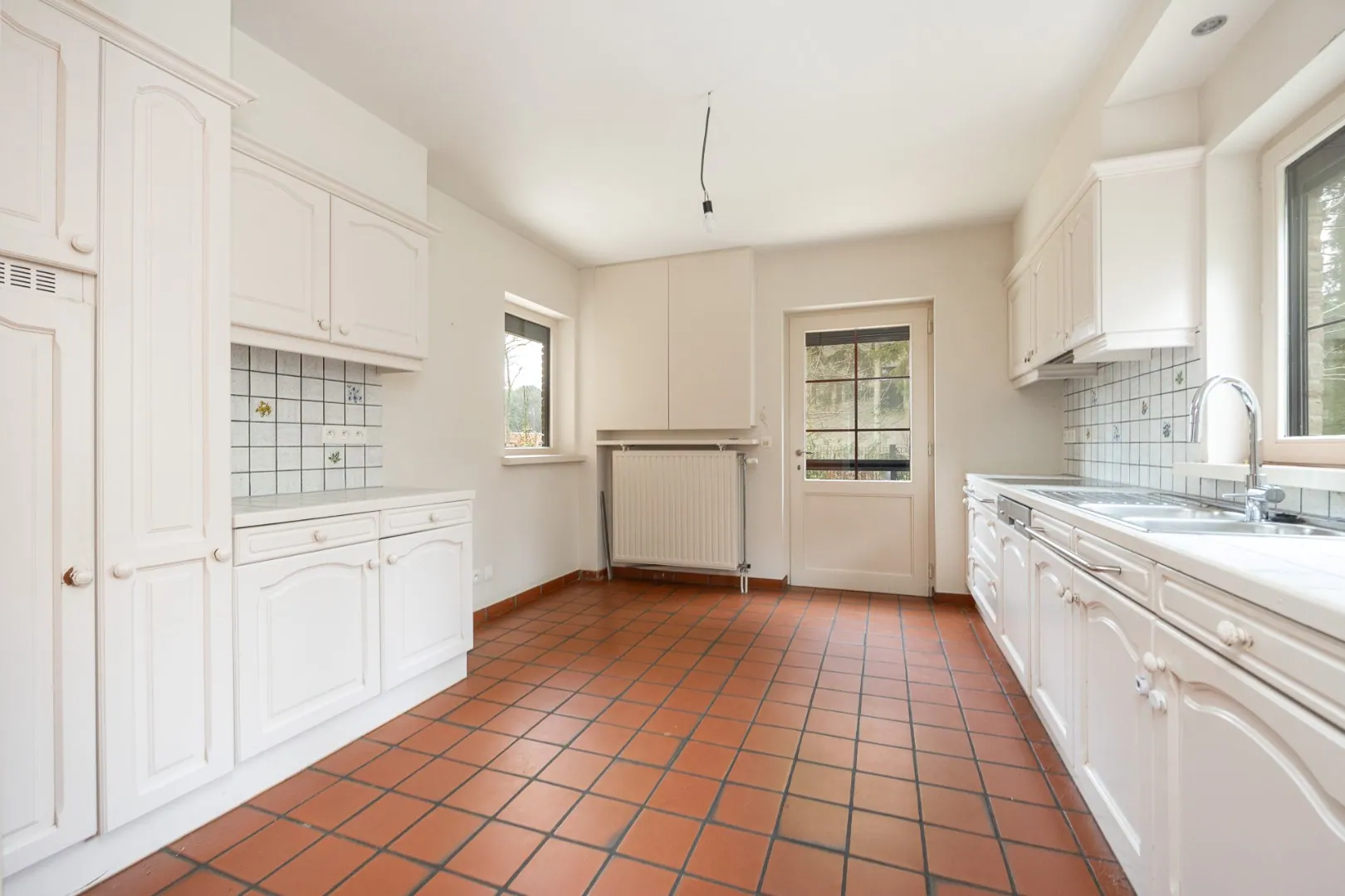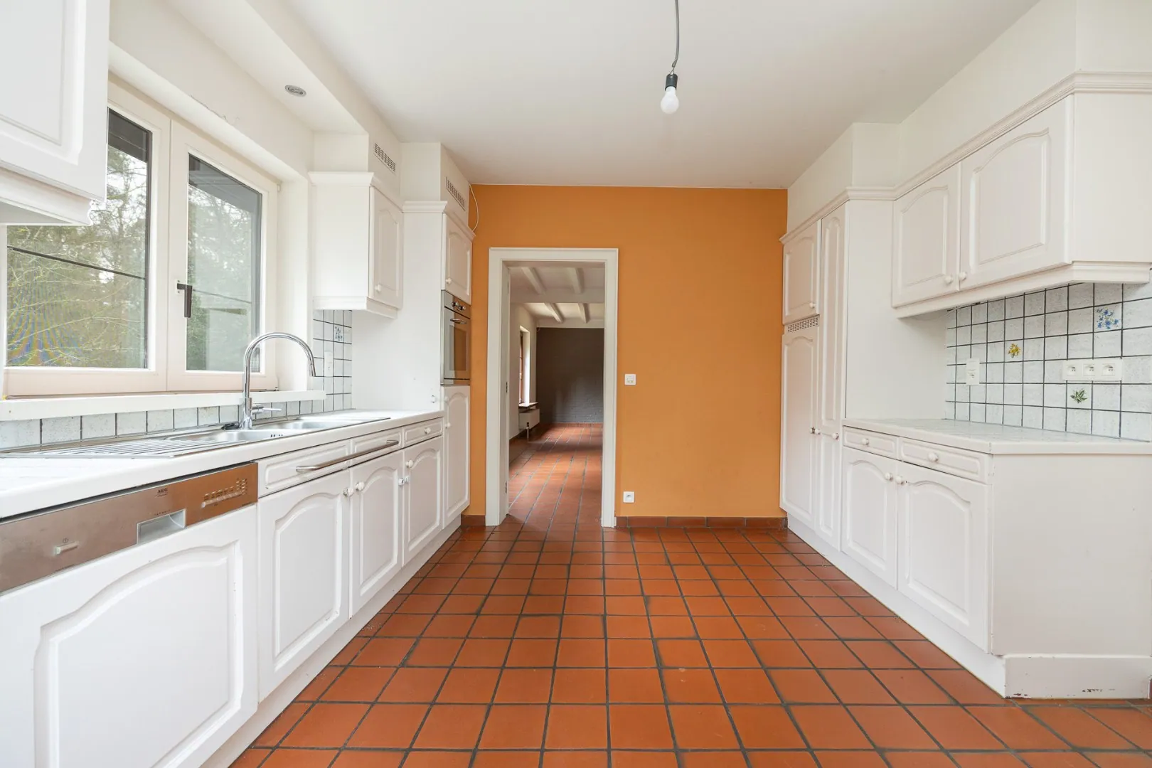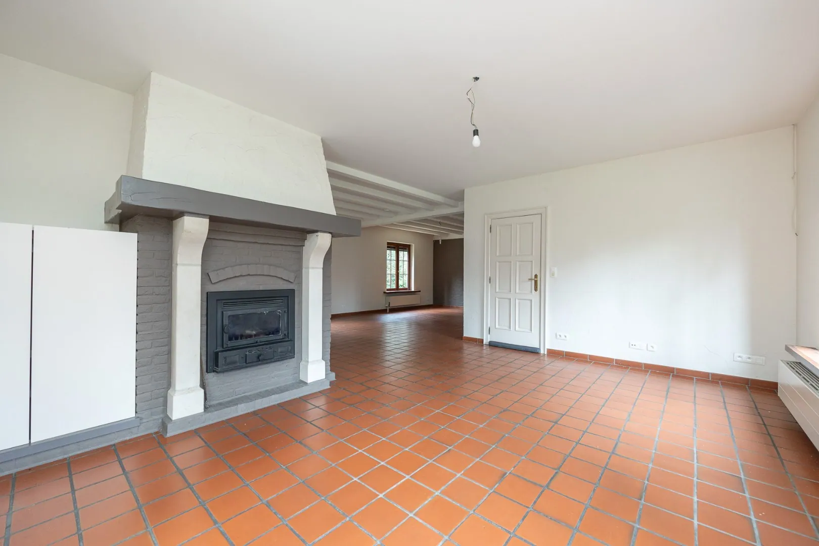 We betreden deze woning in de inkomhal die ons naar de ruime en lichtrijke leefruimte met aansluitende keuken brengt.