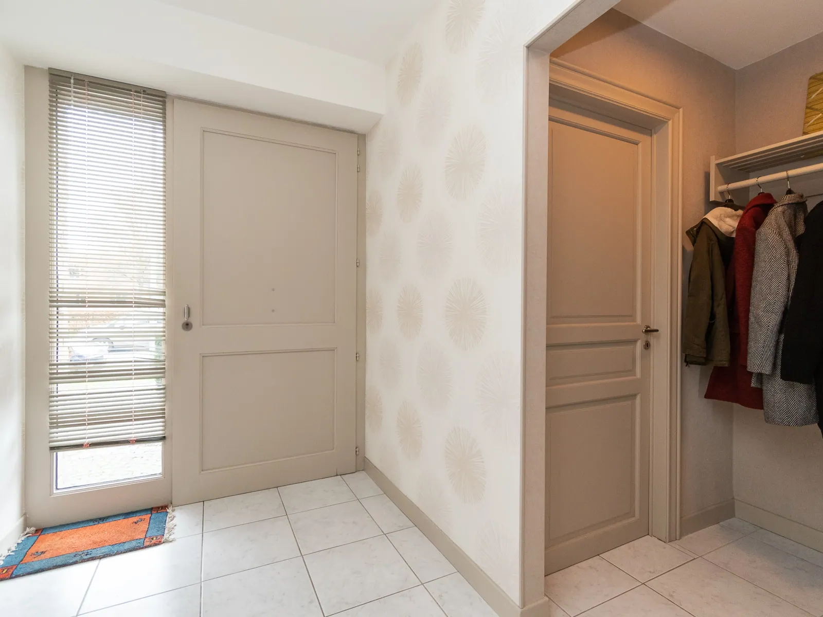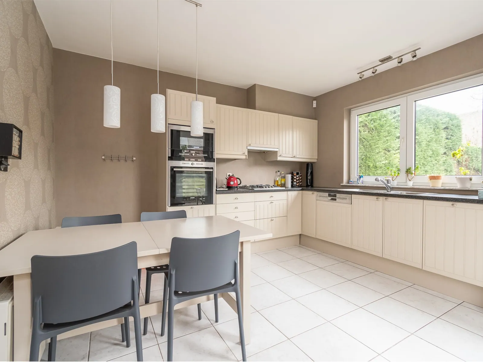 We betreden de woning in de ruime inkomhal met toilet en vestiare. Verder vinden we de ruime woonkamer met groot schuifraam en zicht op de grote tuin. Aansluitend de keuken voorzien van alle nodige toestellen en bijhorende berging.