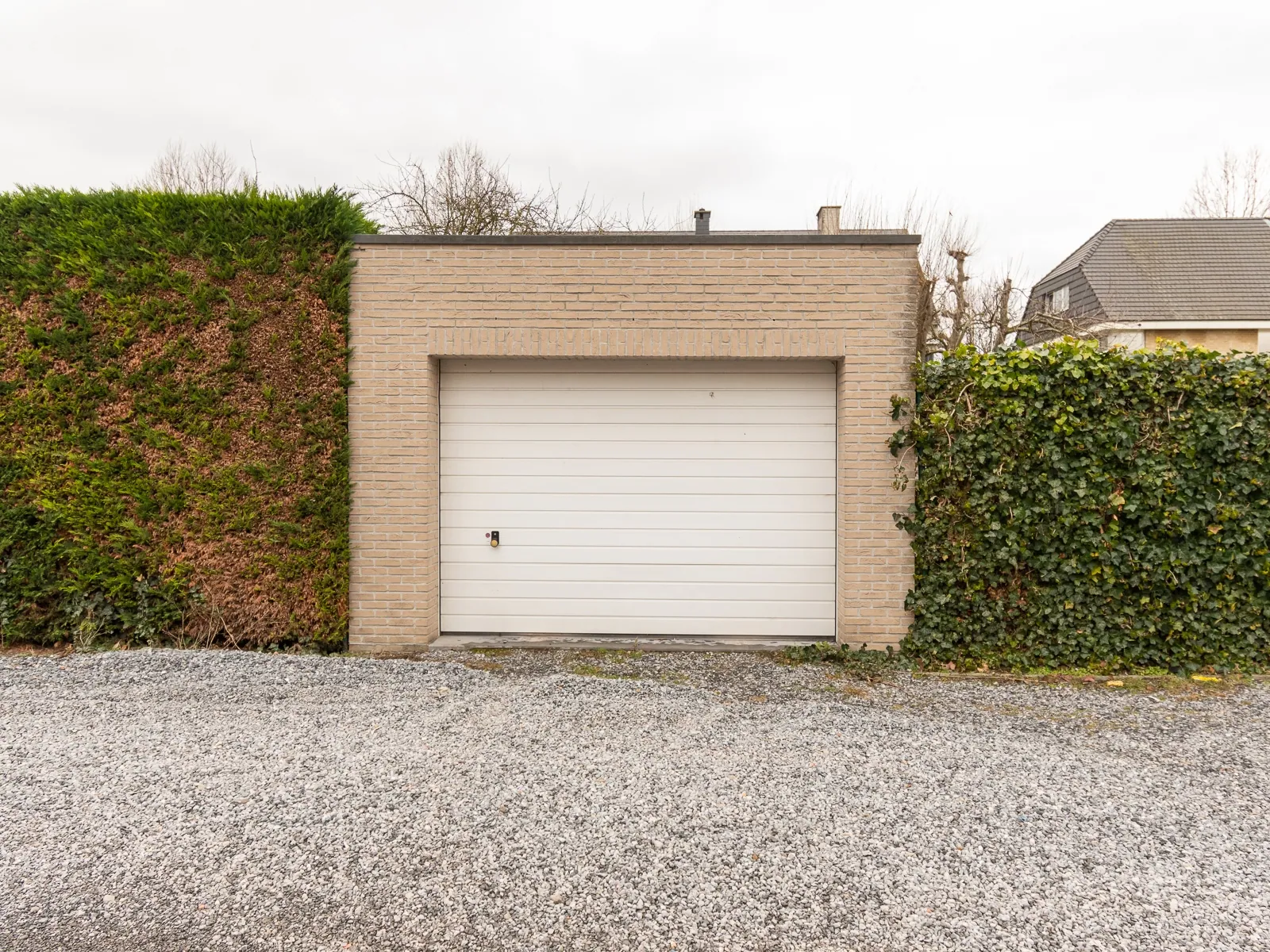Achteraan de tuin is een garage met elektrische poort.