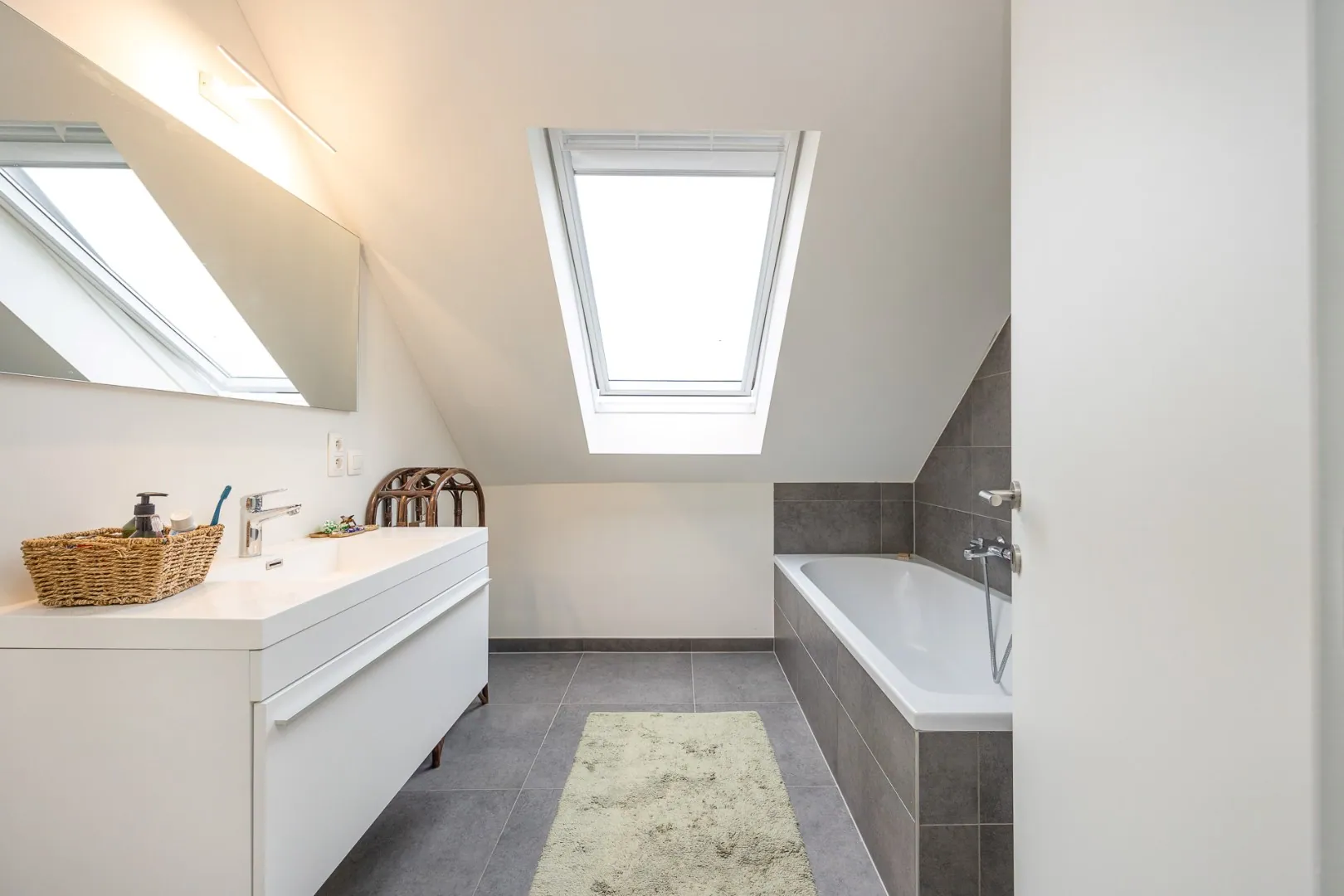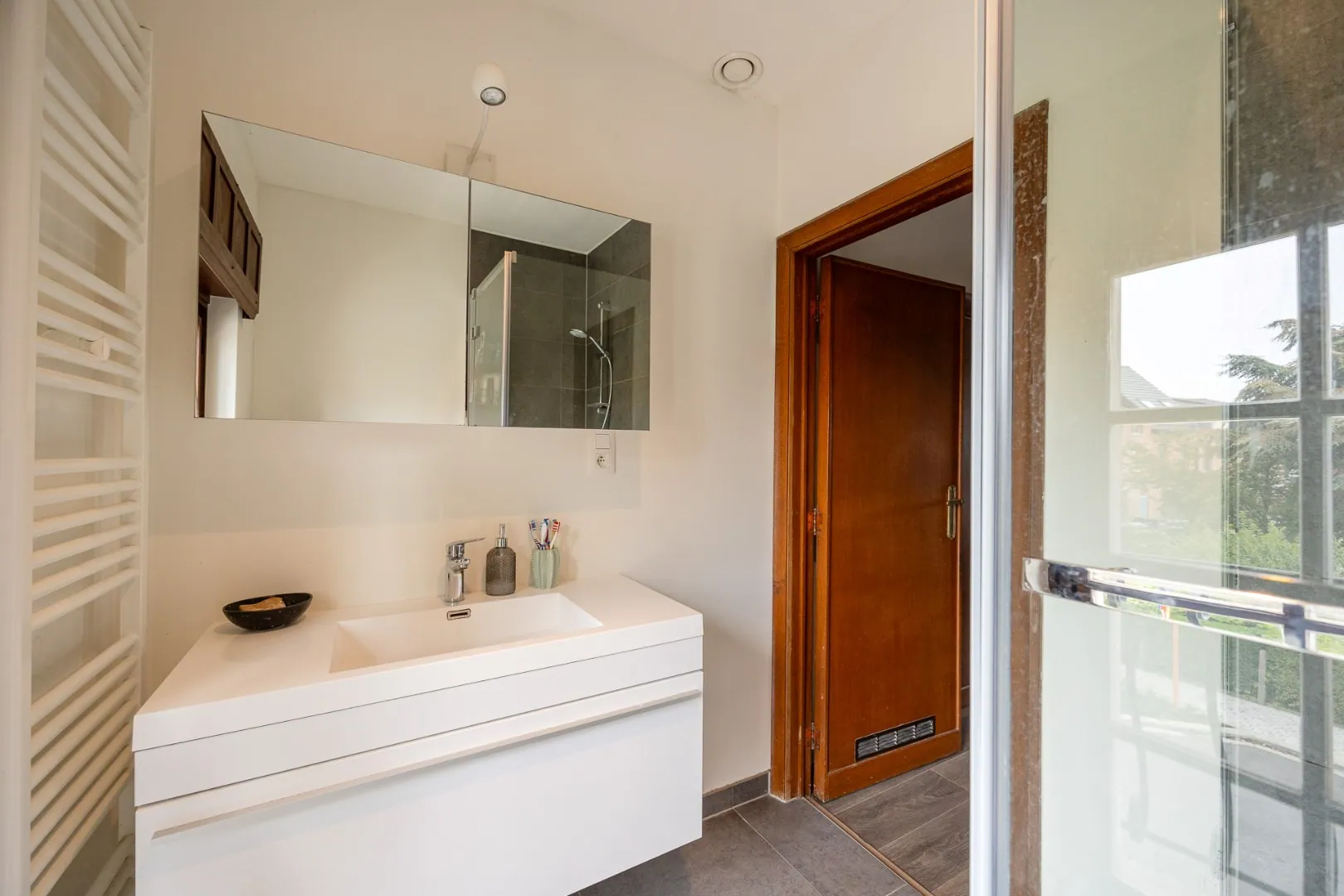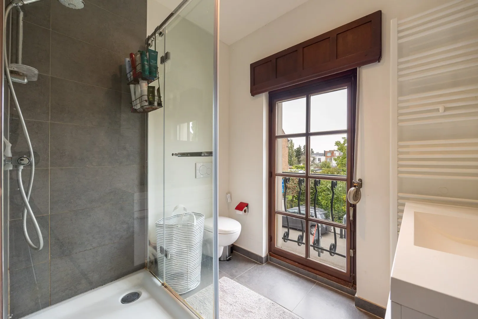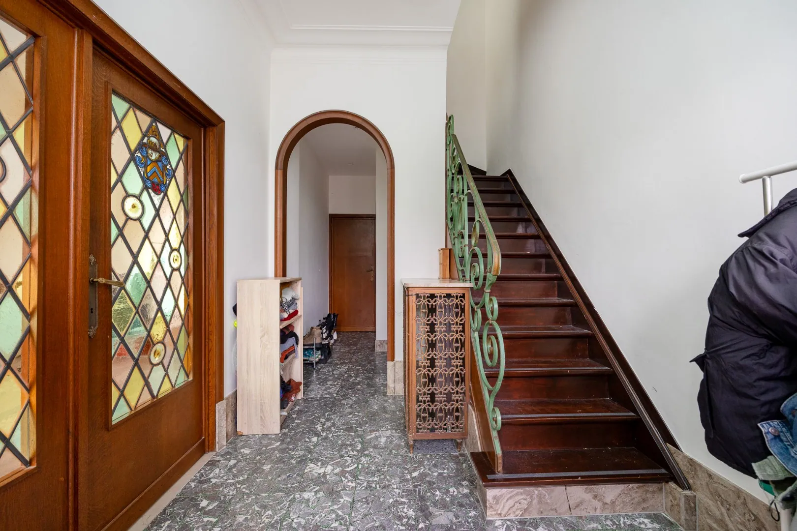 We nemen de trap in de statige inkomhal naar de nachthal op de eerste verdieping. Deze geeft toegang tot een volledig ingerichte badkamer (douche en enkele wastafel) en drie ruime slaapkamers.