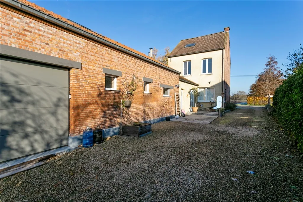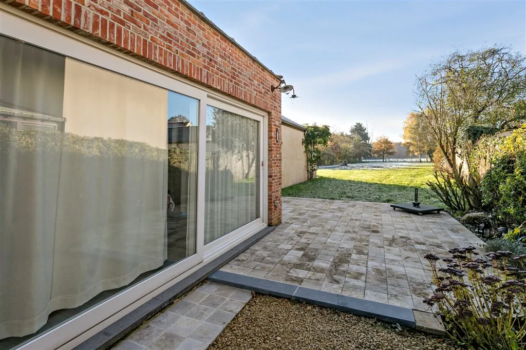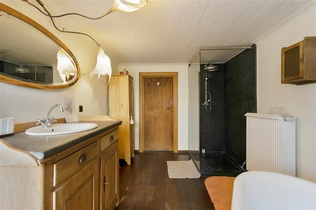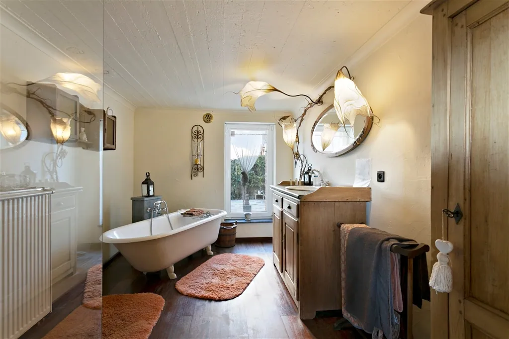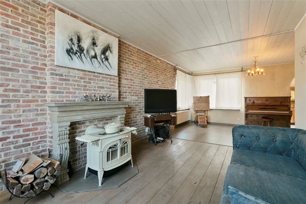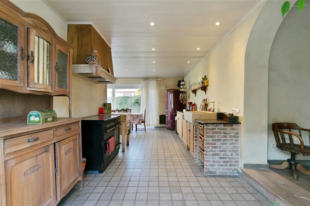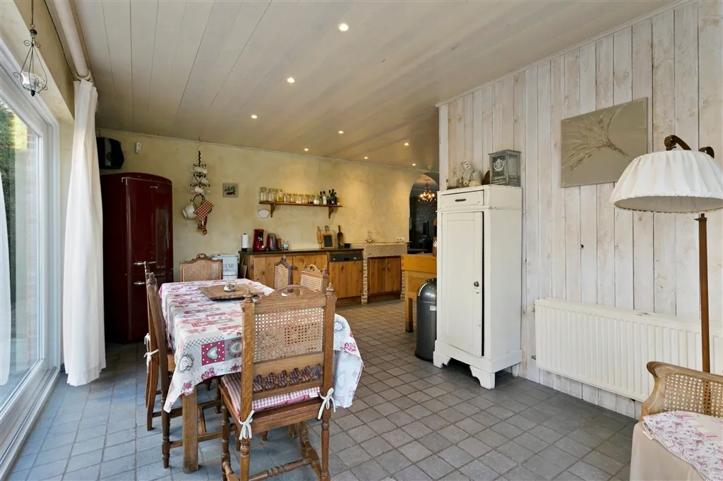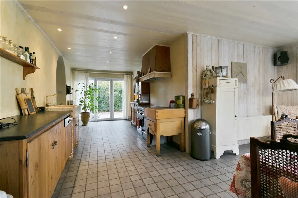U heeft voor uw eigen voertuigen ook de beschikking over een grote oprit voor verscheidene wagens, een diepe garage en een fietsbergplaats. De goed georiënteerde achtertuin, die in het zuidwesten ligt, is zichtbaar vanop alle terrassen (Italiaanse marmer). U kan eenvoudig mee verhuizen met zon en schaduw, als u om en rond het huis wil genieten van het groene uitzicht. Binnen wacht u een unieke ervaring. Vooral het samenspel van materialen van vandaag en weleer, met de op maat gemaakte kunstcreaties, maakt deze thuis uniek en speciaal. Zo flankeert in de keuken een kapblok het Atag-fornuis met 4 gasbekkens, Teppan-Yaki en halogeenplaat. In de leefruimte treffen we een Canadees haardvuur aan. In de badkamer zorgt een op maat gemaakt kunstwerk voor verlichting en de juiste sfeer, waarbij een ventilatiesysteem permanent verse lucht aanvoert. Het huis baadt in een sfeer van rust en romantiek, door oordeelkundige combinatie van plankenvloeren en plafondbeplanking.