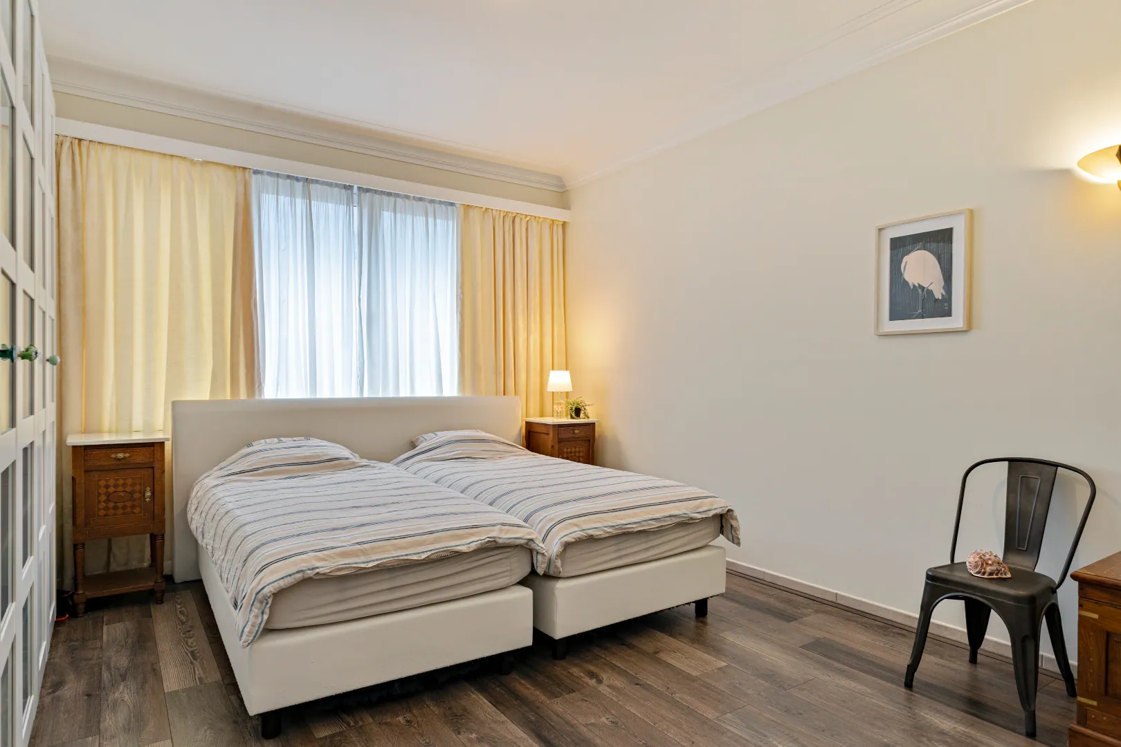 Vanuit de nachthal bereik je eveneens het eerste gastentoilet, de twee ruime slaapkamers met ingemaakte kastenwand, waarvan de master bedroom doorgang biedt tot de en suite badkamer met toilet, bad/douche en een tweede toilet.