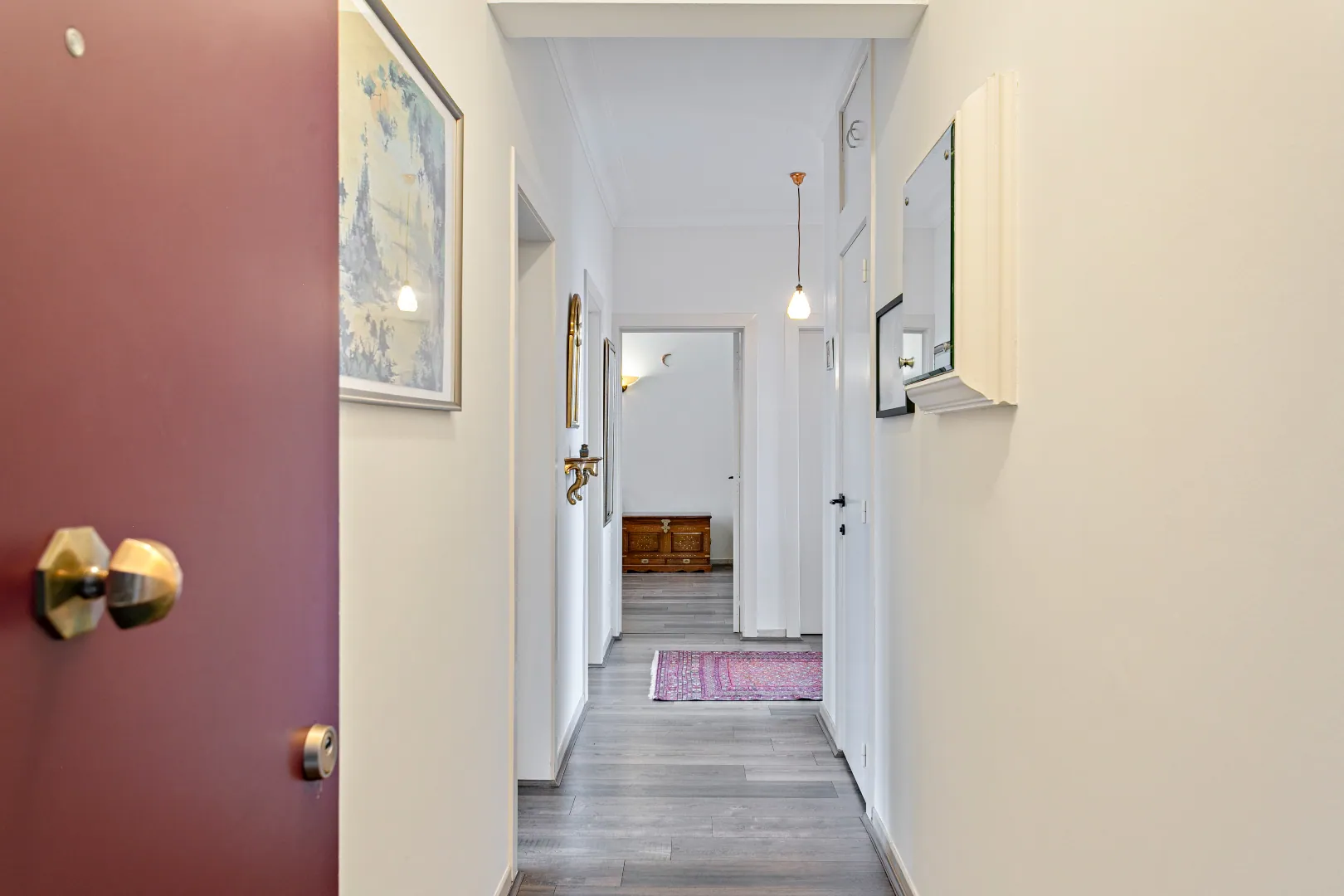 Het ruime en lichtrijke appartement bestaat uit een privatieve inkomhal, grote living en leefruimte met prachtige schouw, halfopen keuken (inductievuur, combi-oven, oven, vaatwasmachine) met toegang tot klein terras en buitenberging.