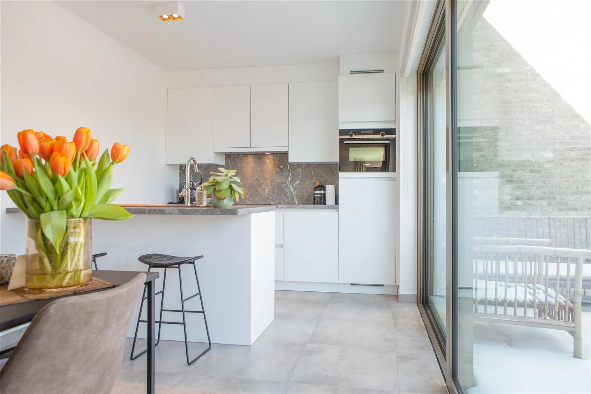 Dit parkappartement heeft 2 slaapkamers en een terras met een afwerking die tot de verbeelding spreekt: een mooie keuken met Mieletoestellen, prachtige vloeren, rustgevende badkamer en berging naast de keuken.
