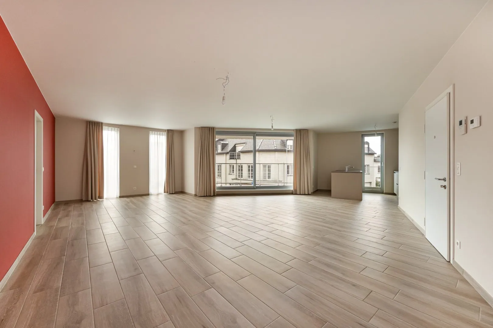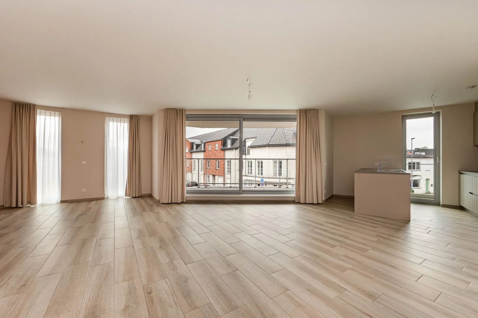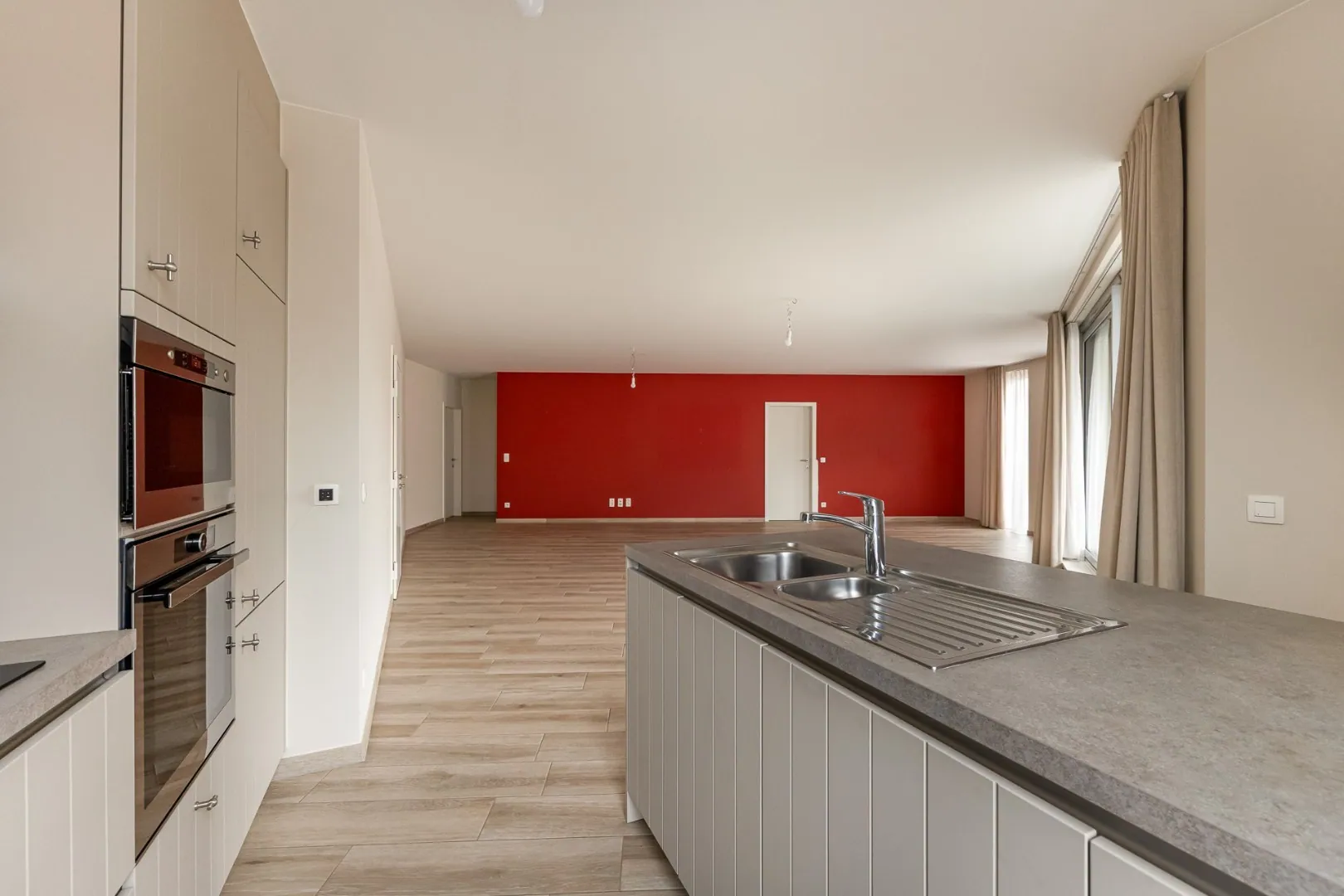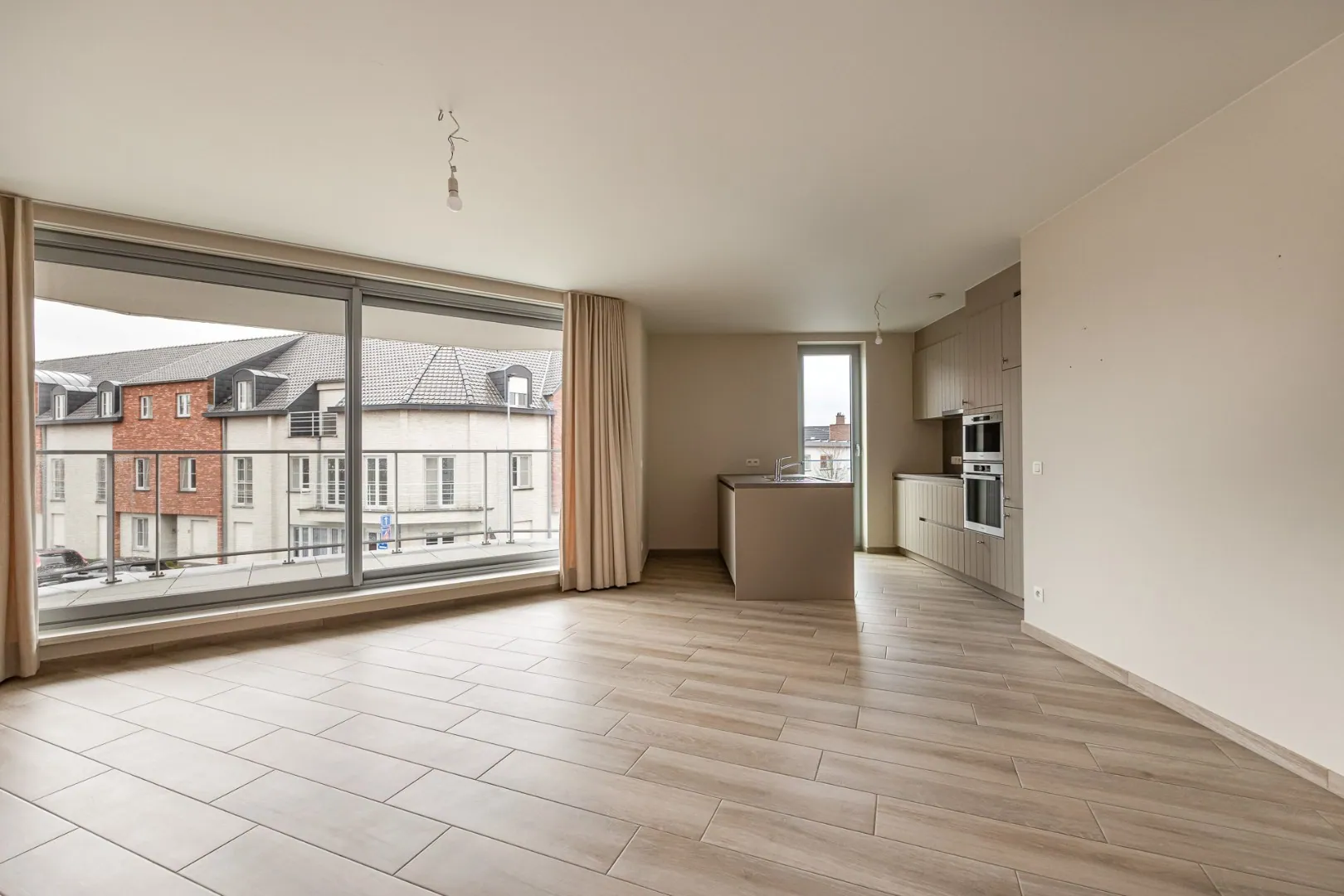 Het appartement beschikt over een zeer ruime en lichtrijke woonkamer met aansluitend terras – ideaal om te genieten van een kop koffie of een rustig moment buiten. De volledig ingerichte keuken sluit mooi aan op de leefruimte.