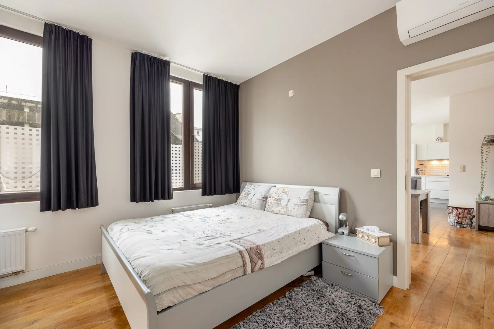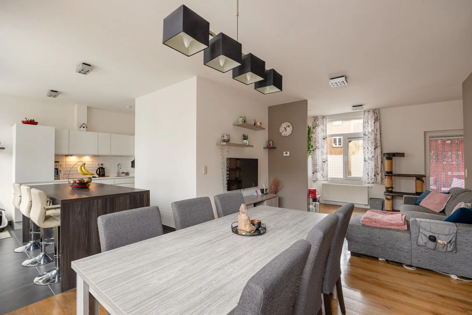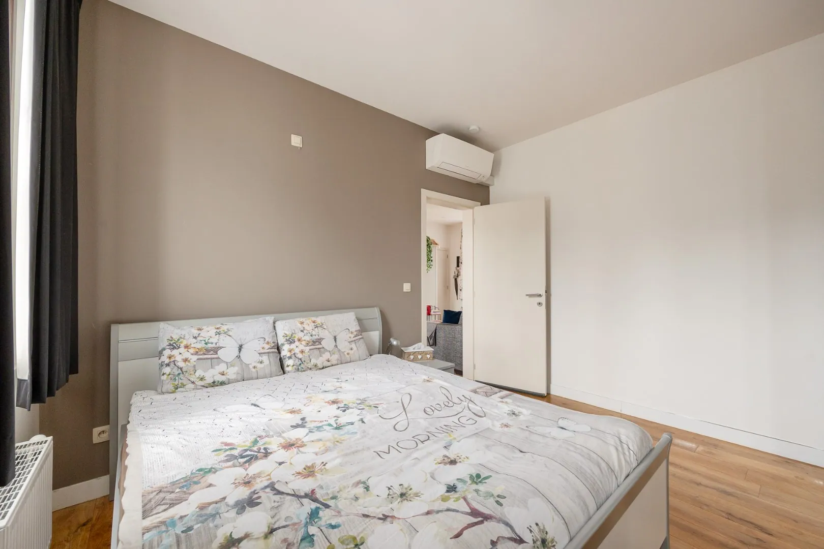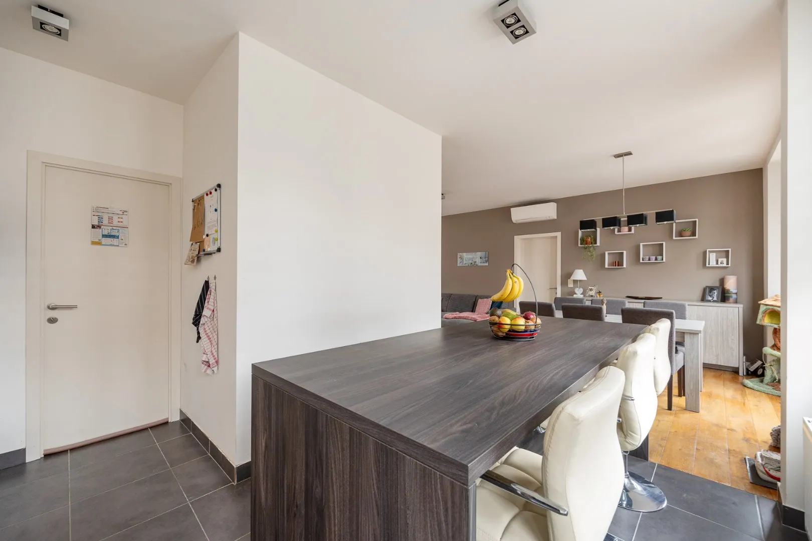 We betreden dit mooie appartement in de ruime en lichtrijke woonkamer met volledig uitgeruste open keuken. Aansluitend vind je de aparte berging/wasplaats. Doorheen het appartement ligt een parketvloer, die meteen voor een warm gevoel zorgt.