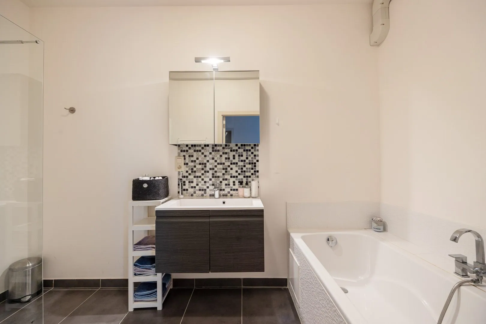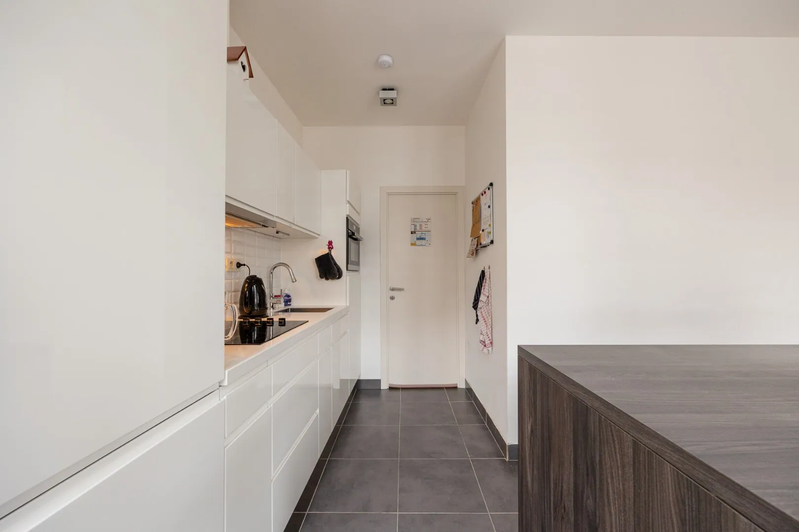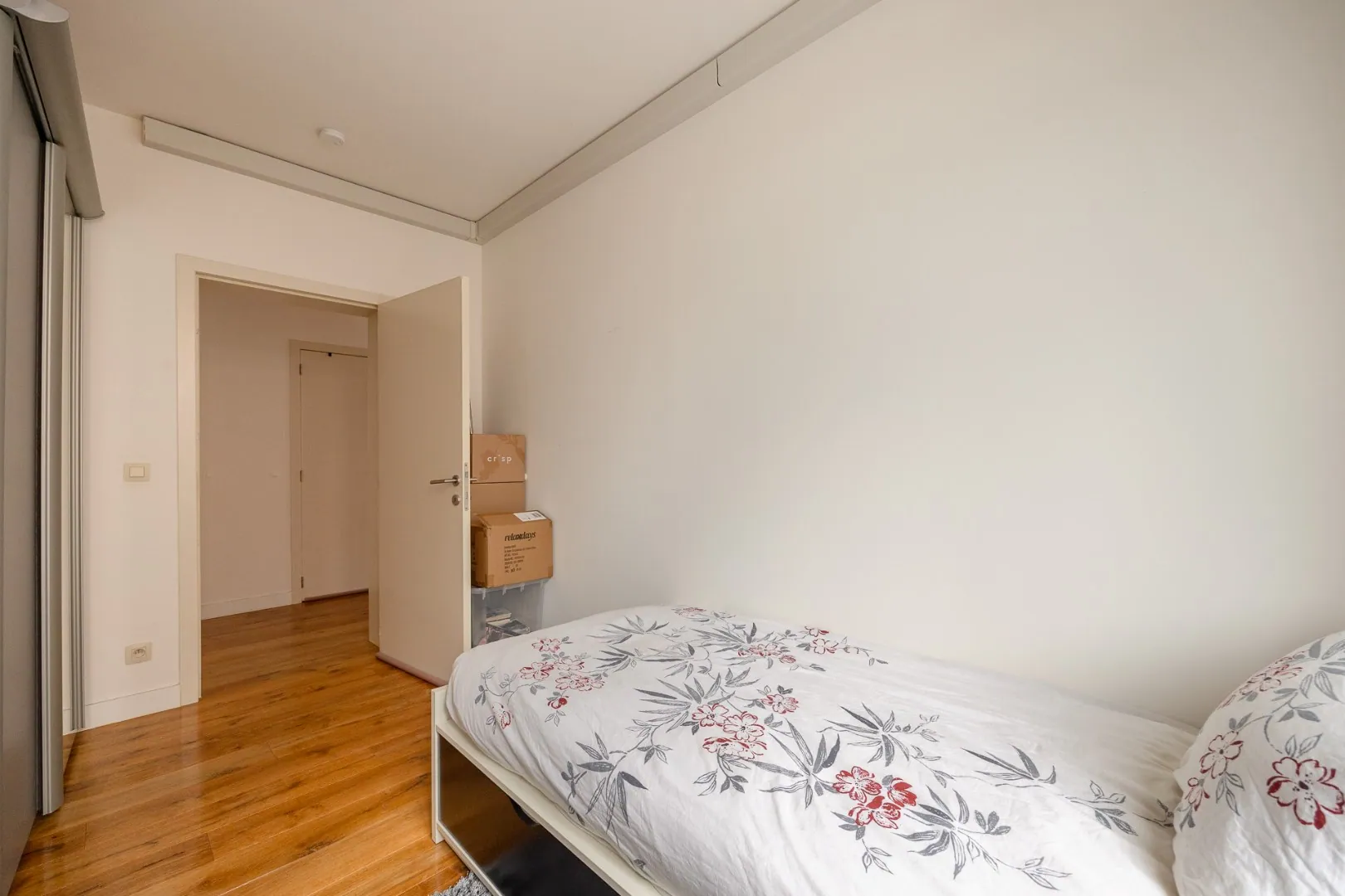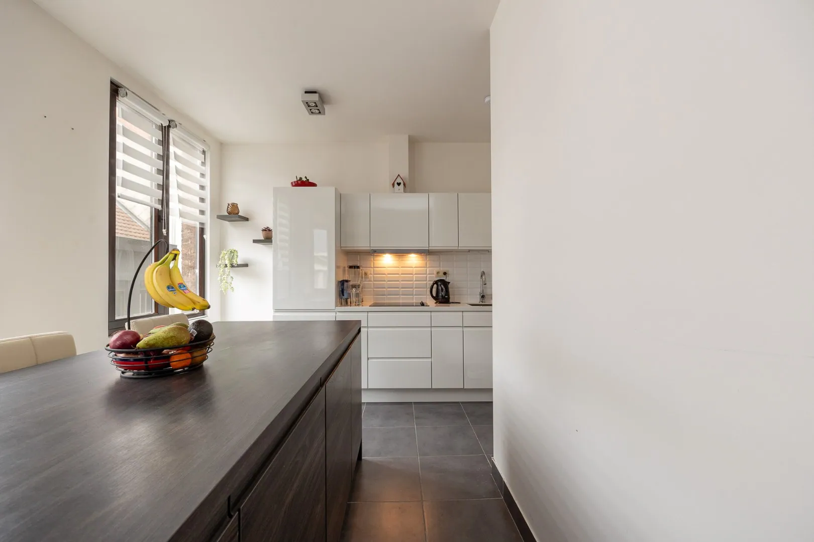 We betreden dit mooie appartement in de ruime en lichtrijke woonkamer met volledig uitgeruste open keuken. Aansluitend vind je de aparte berging/wasplaats. Doorheen het appartement ligt een parketvloer, die meteen voor een warm gevoel zorgt.