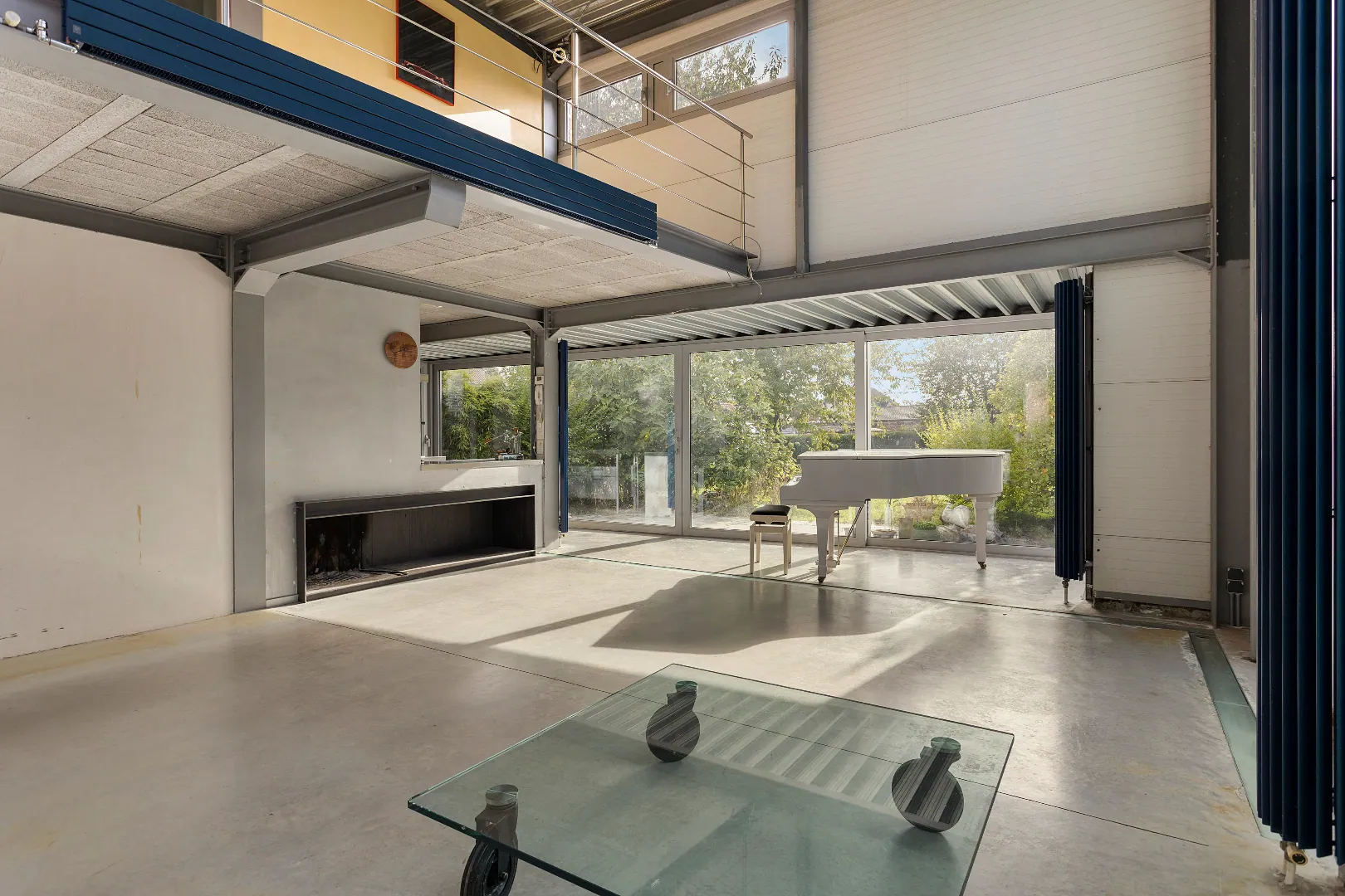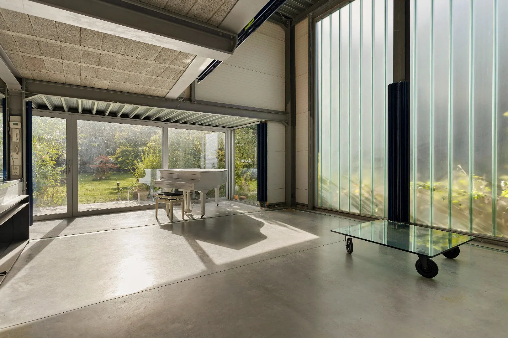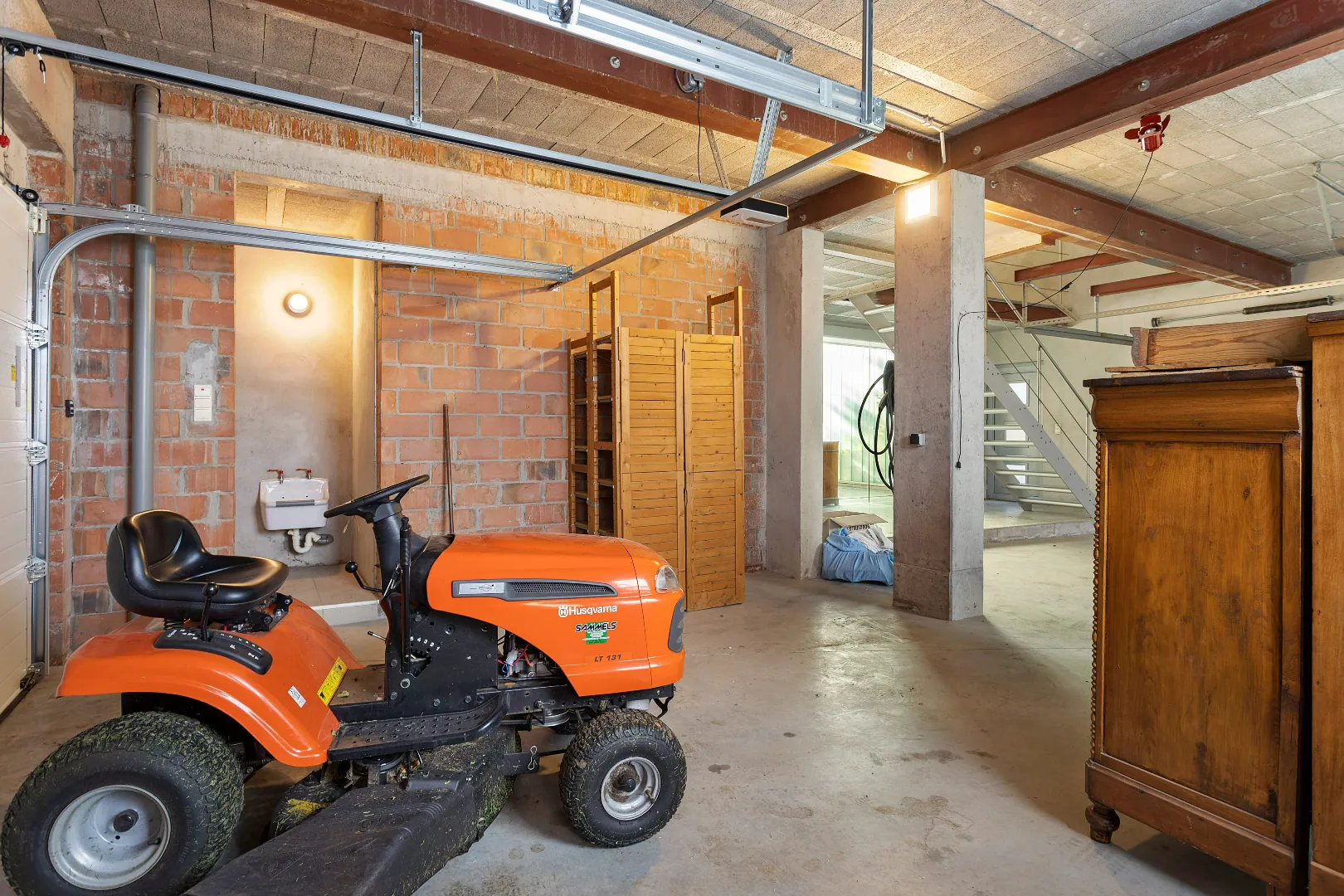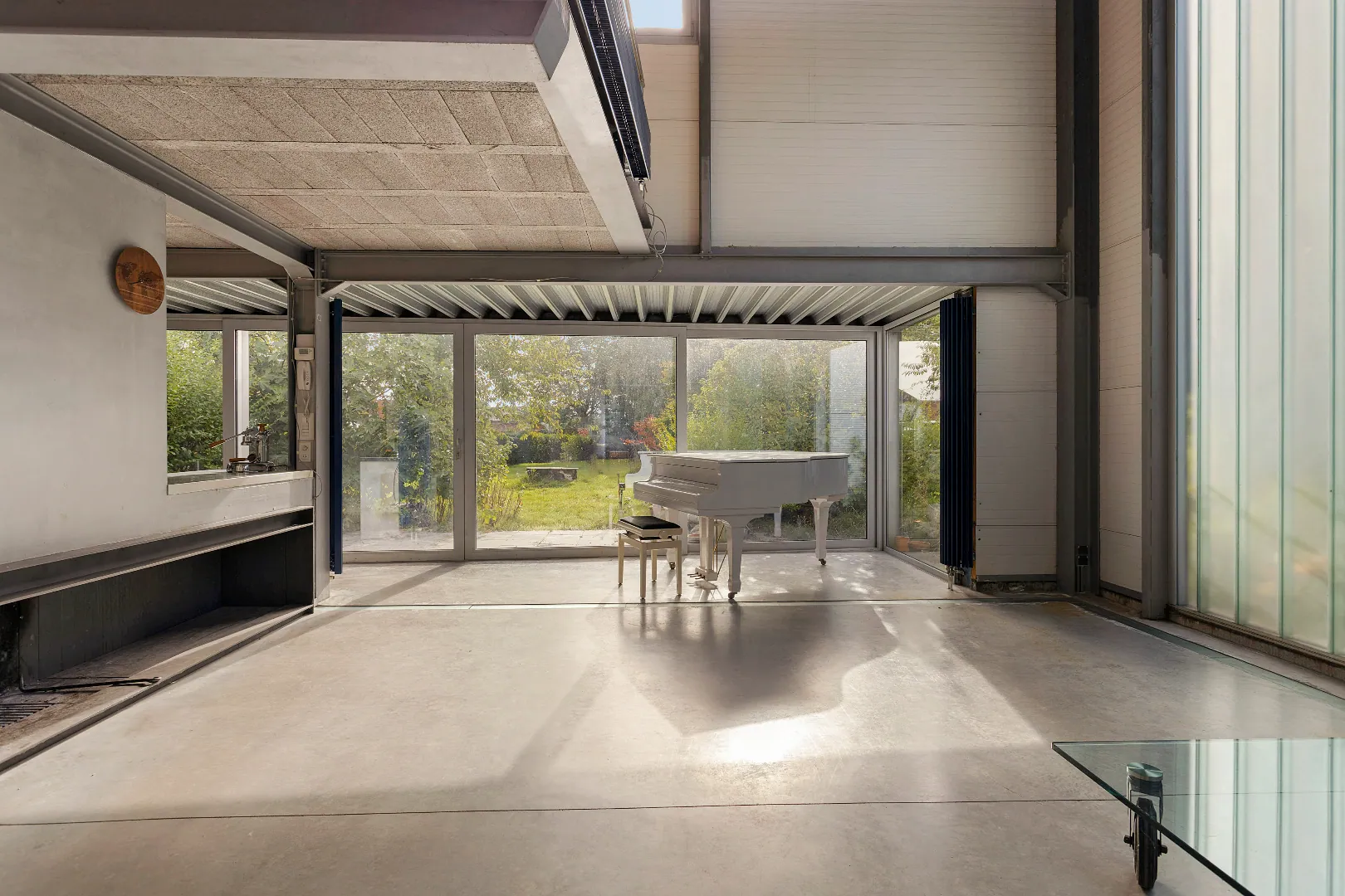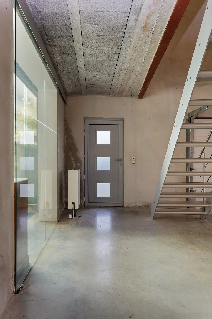 Wegens de passie voor zijn wagens, heeft de vorige eigenaar de garage een centrale plaats gegeven en vormen grote glazen schuifdeuren de enige afscheiding.