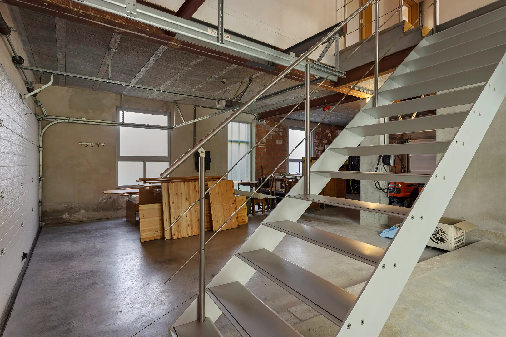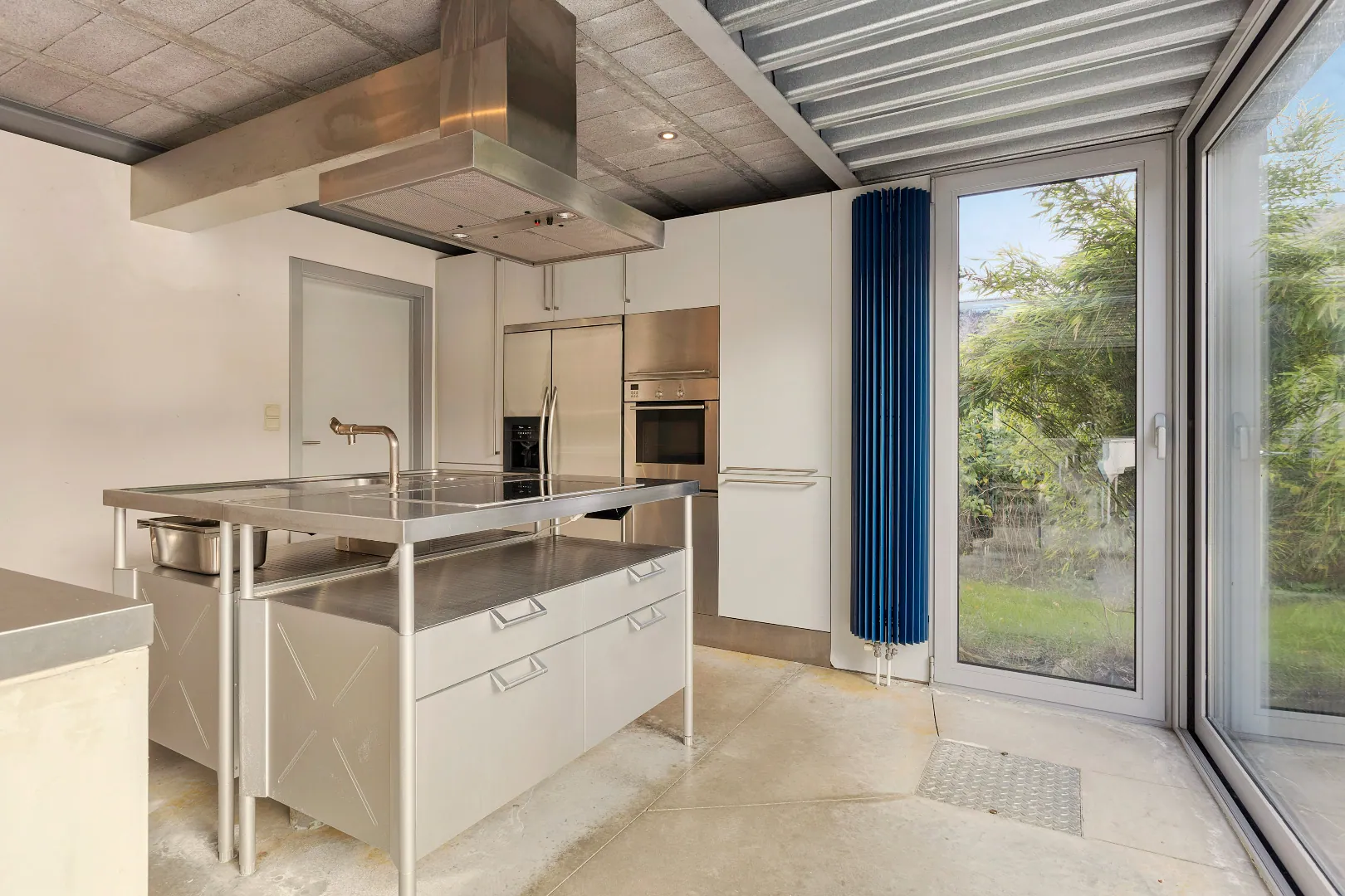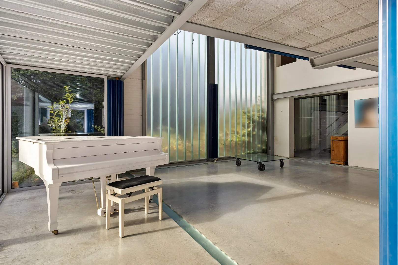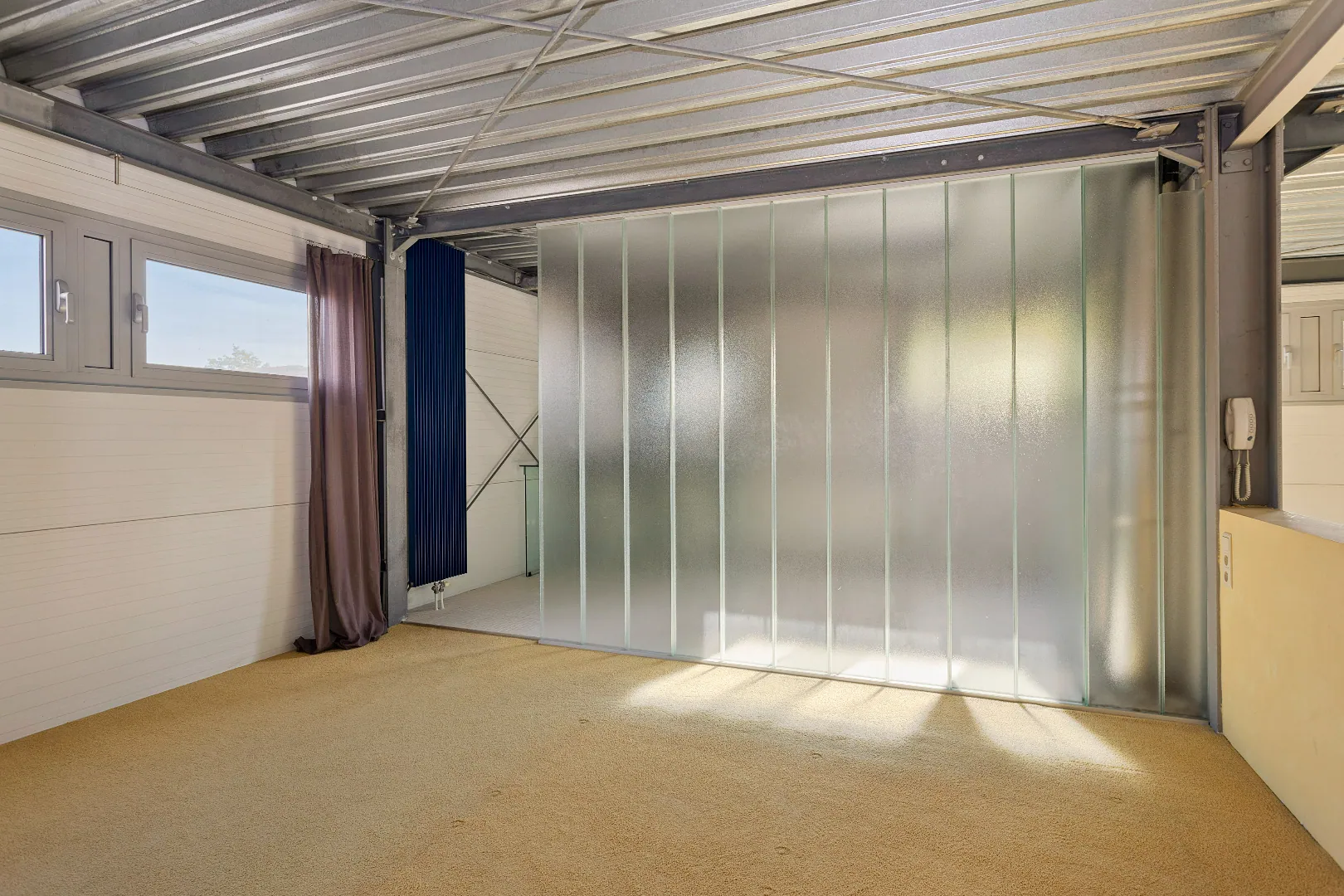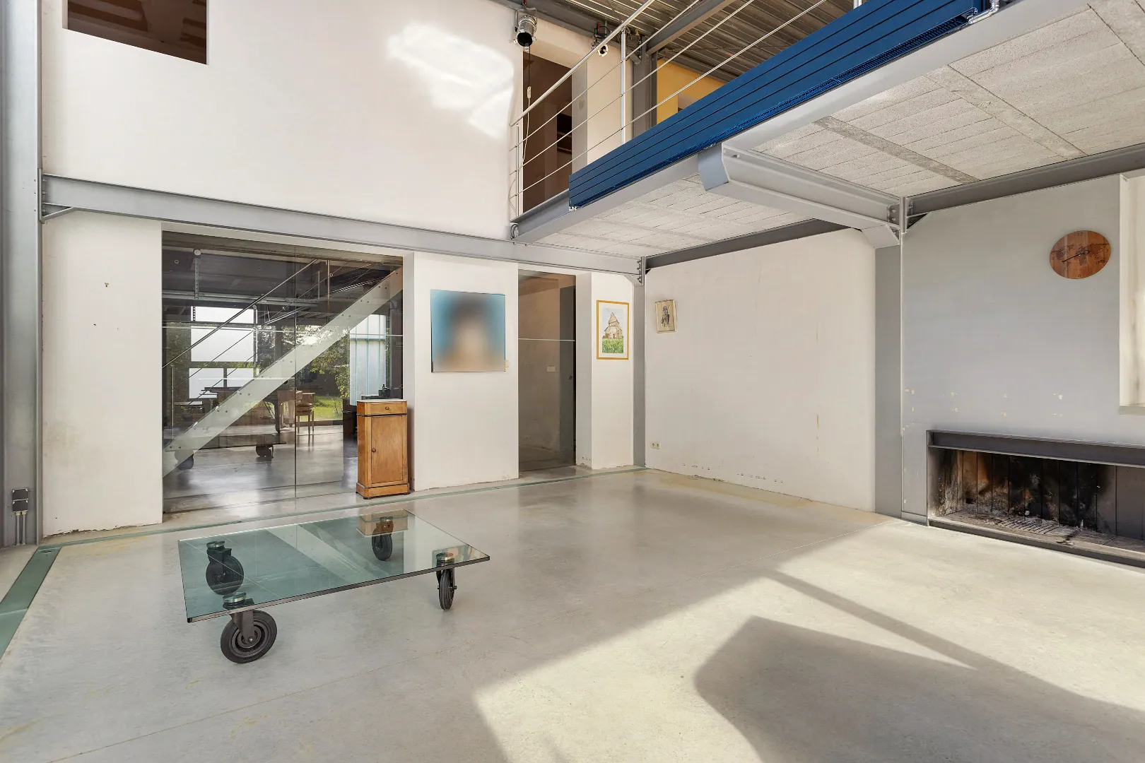 Wegens de passie voor zijn wagens, heeft de vorige eigenaar de garage een centrale plaats gegeven en vormen grote glazen schuifdeuren de enige afscheiding.