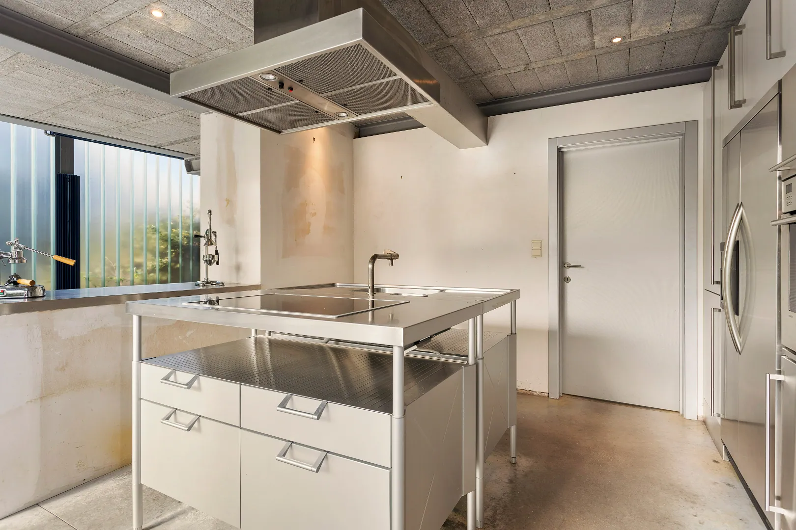 De haard verbindt de keuken en de leefruimte waar een design- keuken van (Bulthaup) het industriële beeld aansterkt.