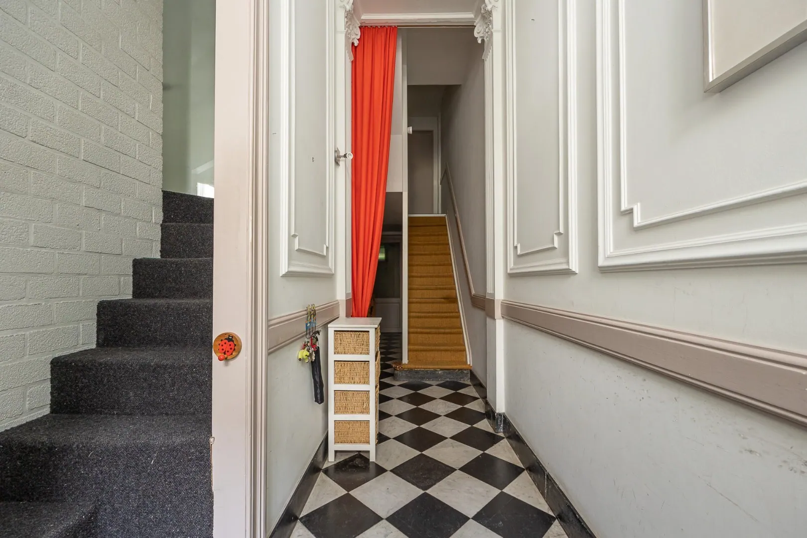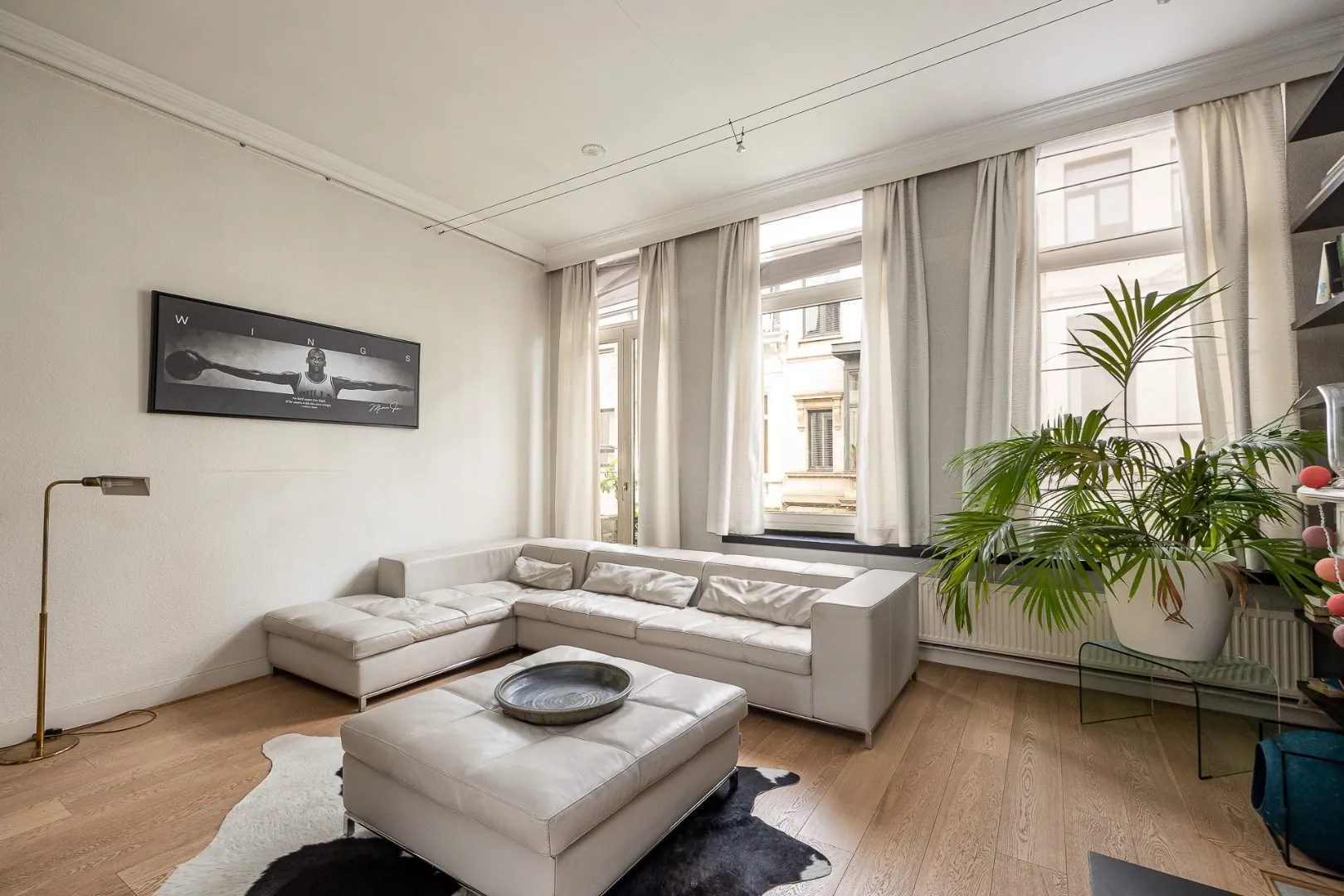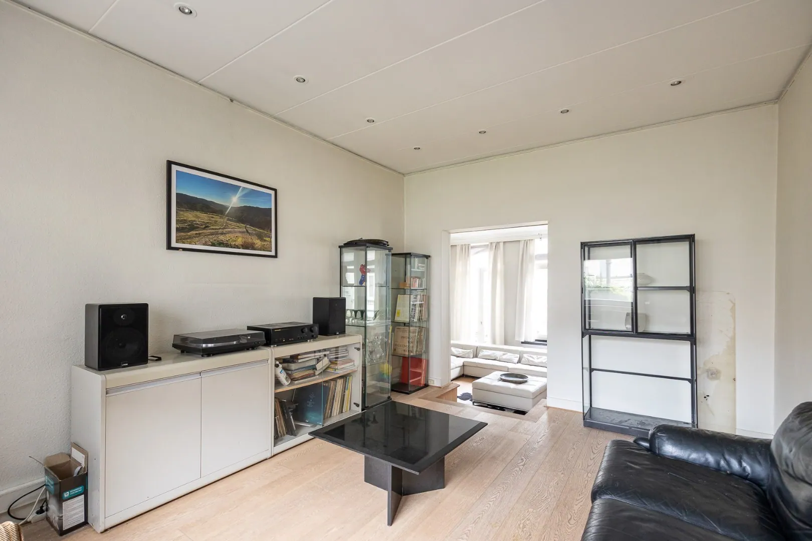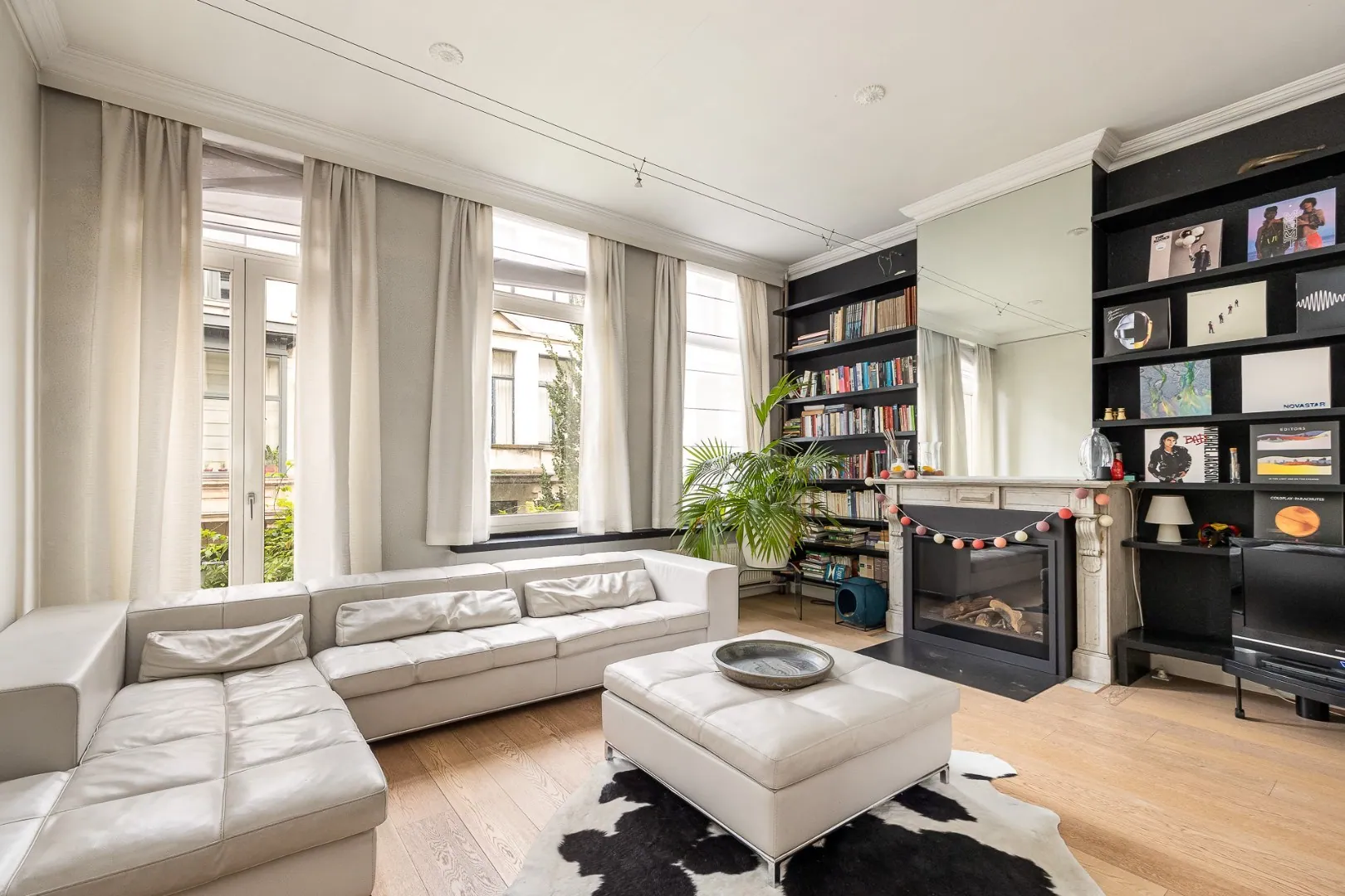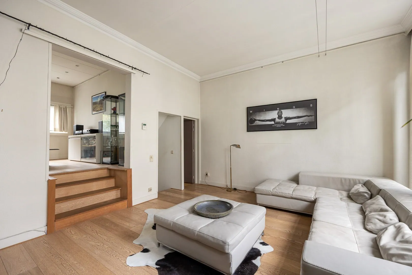 Op het eerste tussenverdiep vind je de ruime woonkamer, volledig voorzien van parketvloer, hoge ramen die zorgen voor een optimale lichtinval en een prachtige schouw.