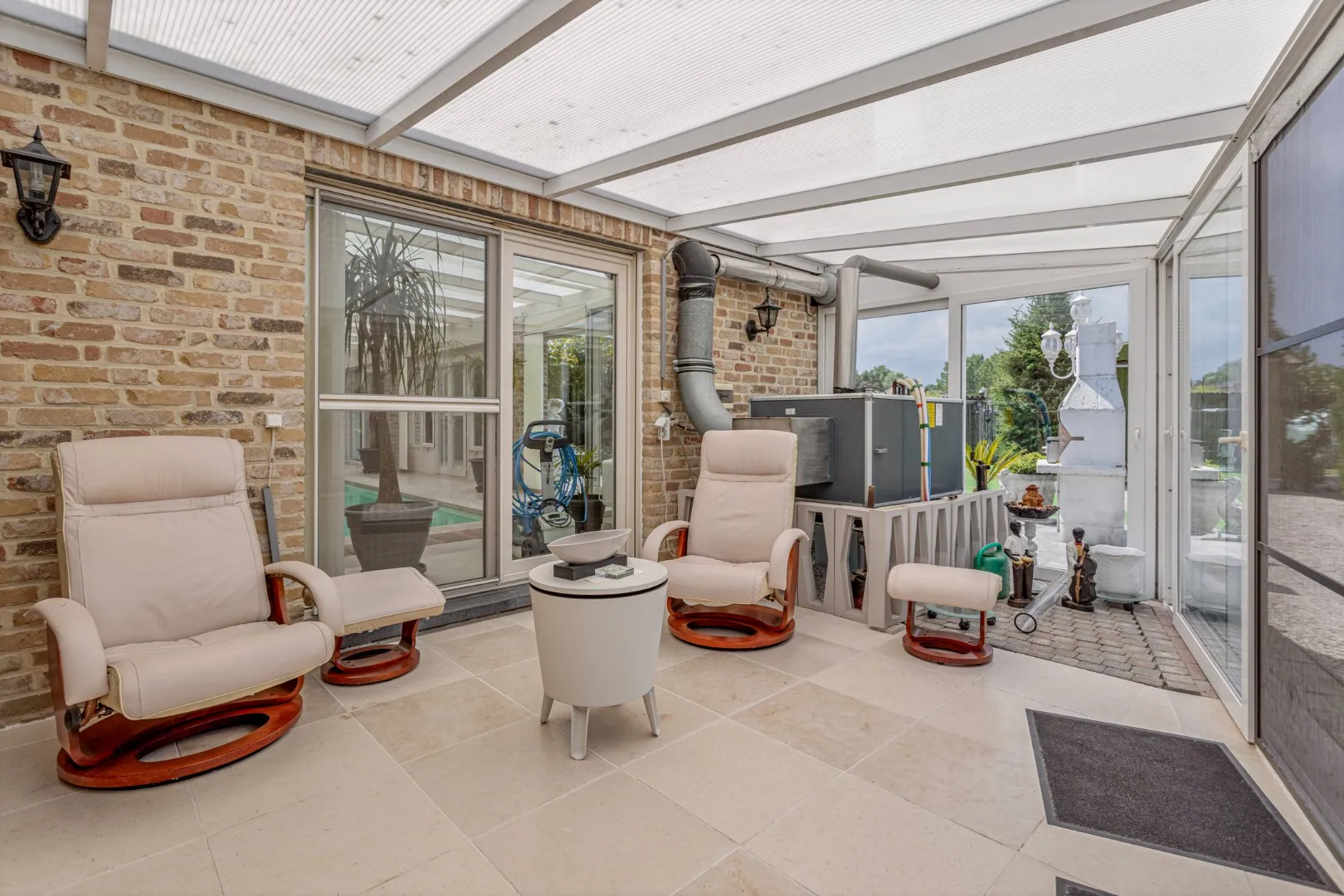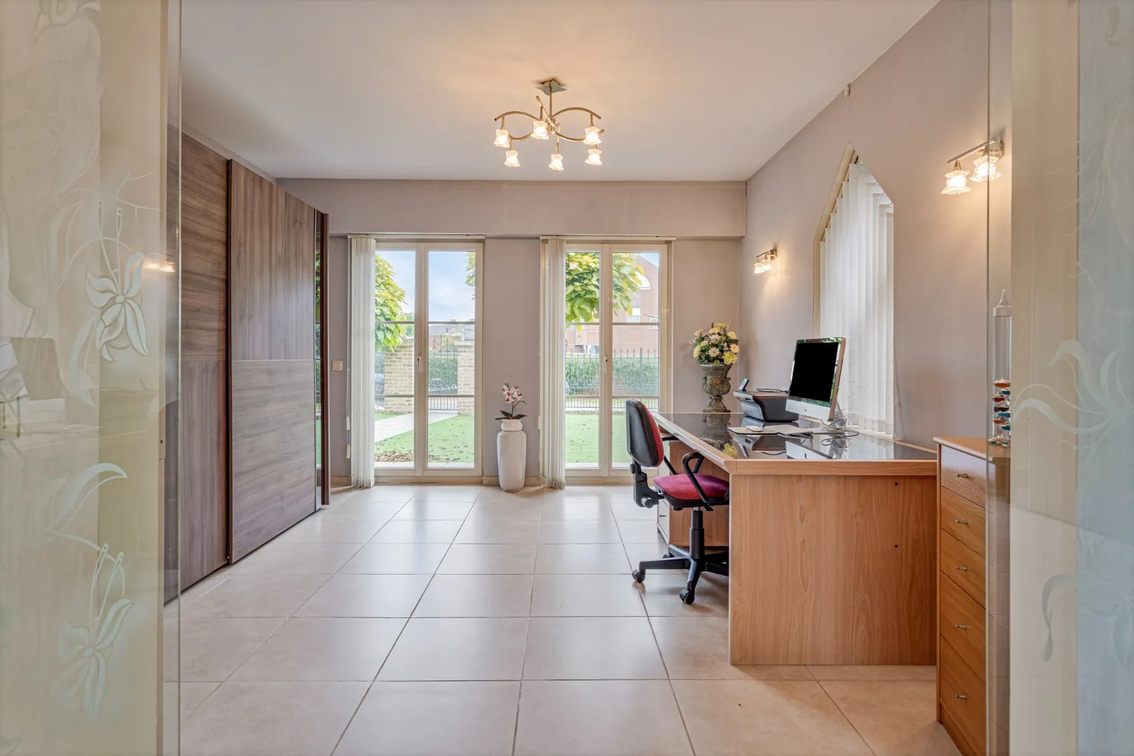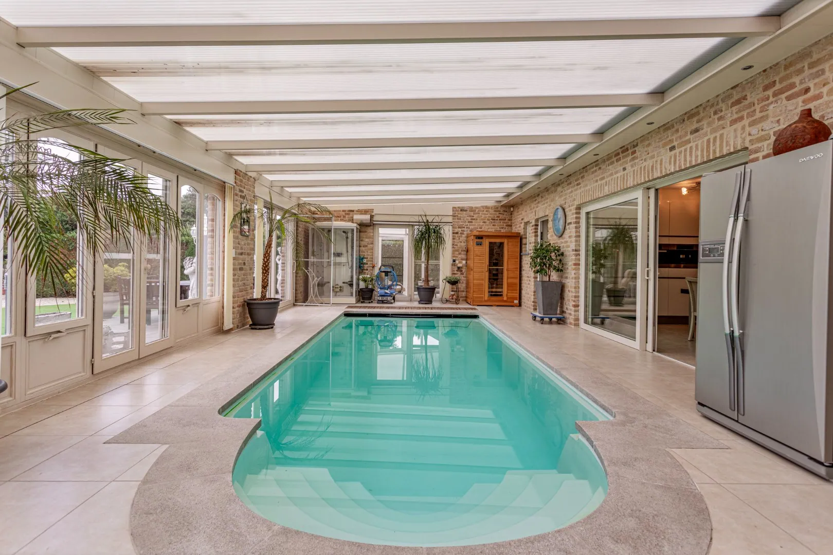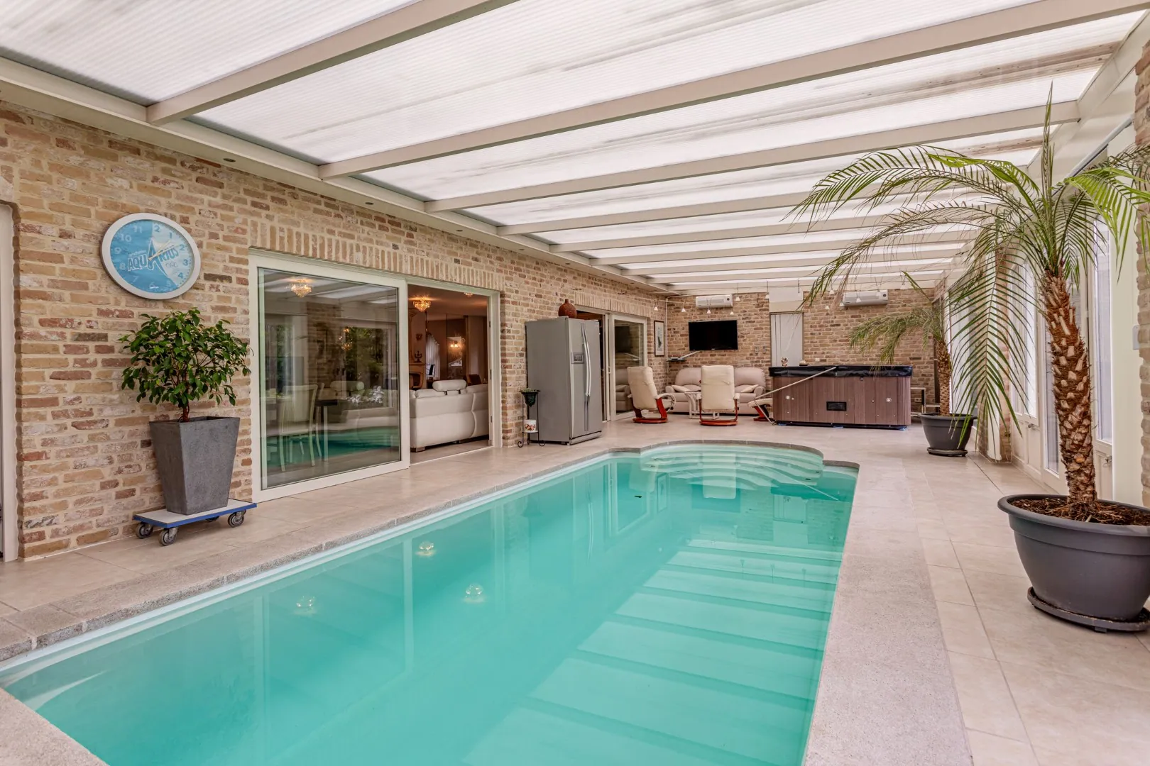 Op het gelijkvloers bevindt zich de inkomhal met gastentoilet, ruime woonkamer met volledig uitgeruste open keuken, twee slaapkamers, bureau, badkamer met dubbele wastafel en bad. Graag wat baantjes trekken? Dat kan in je eigen binnenzwembad in de veranda.