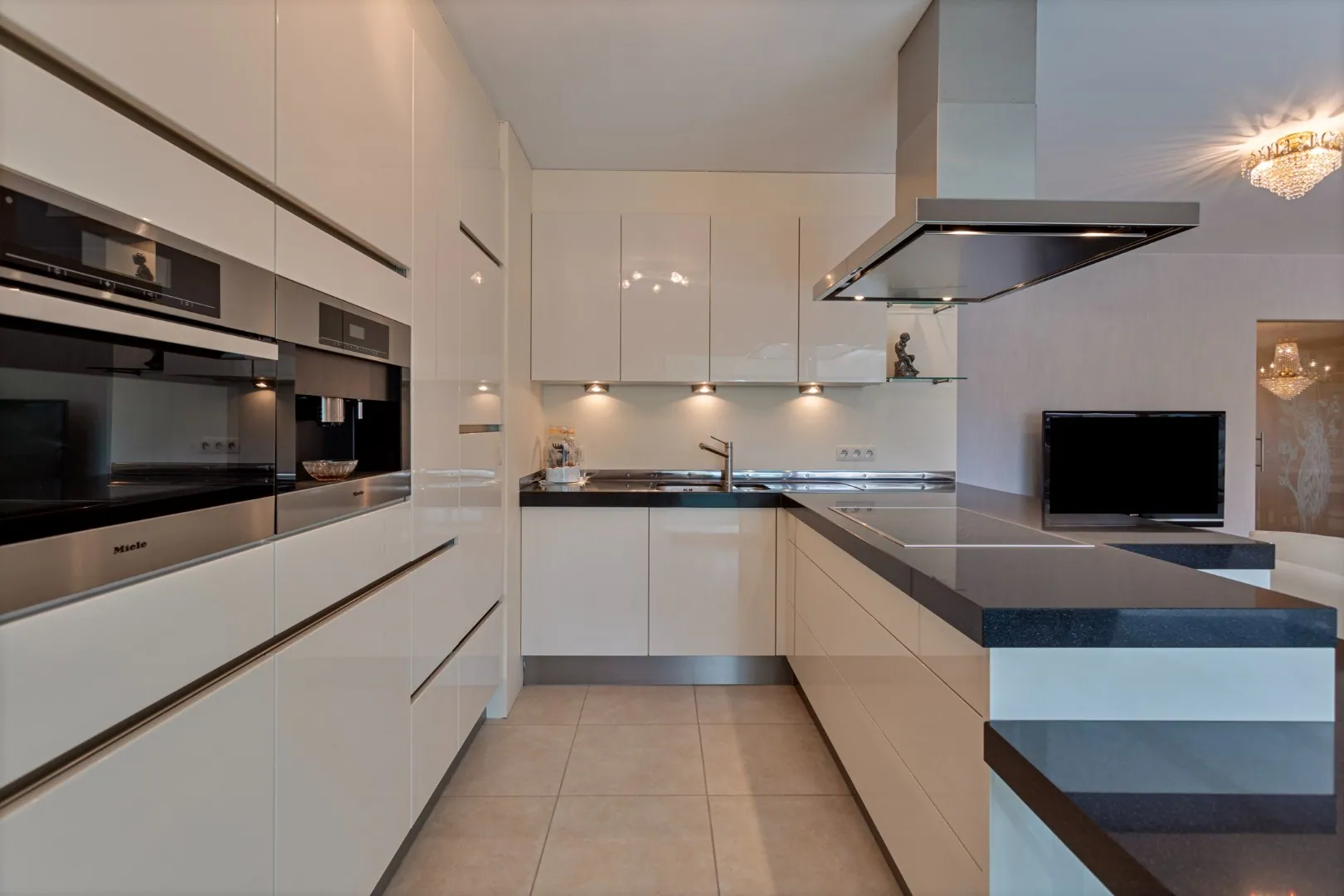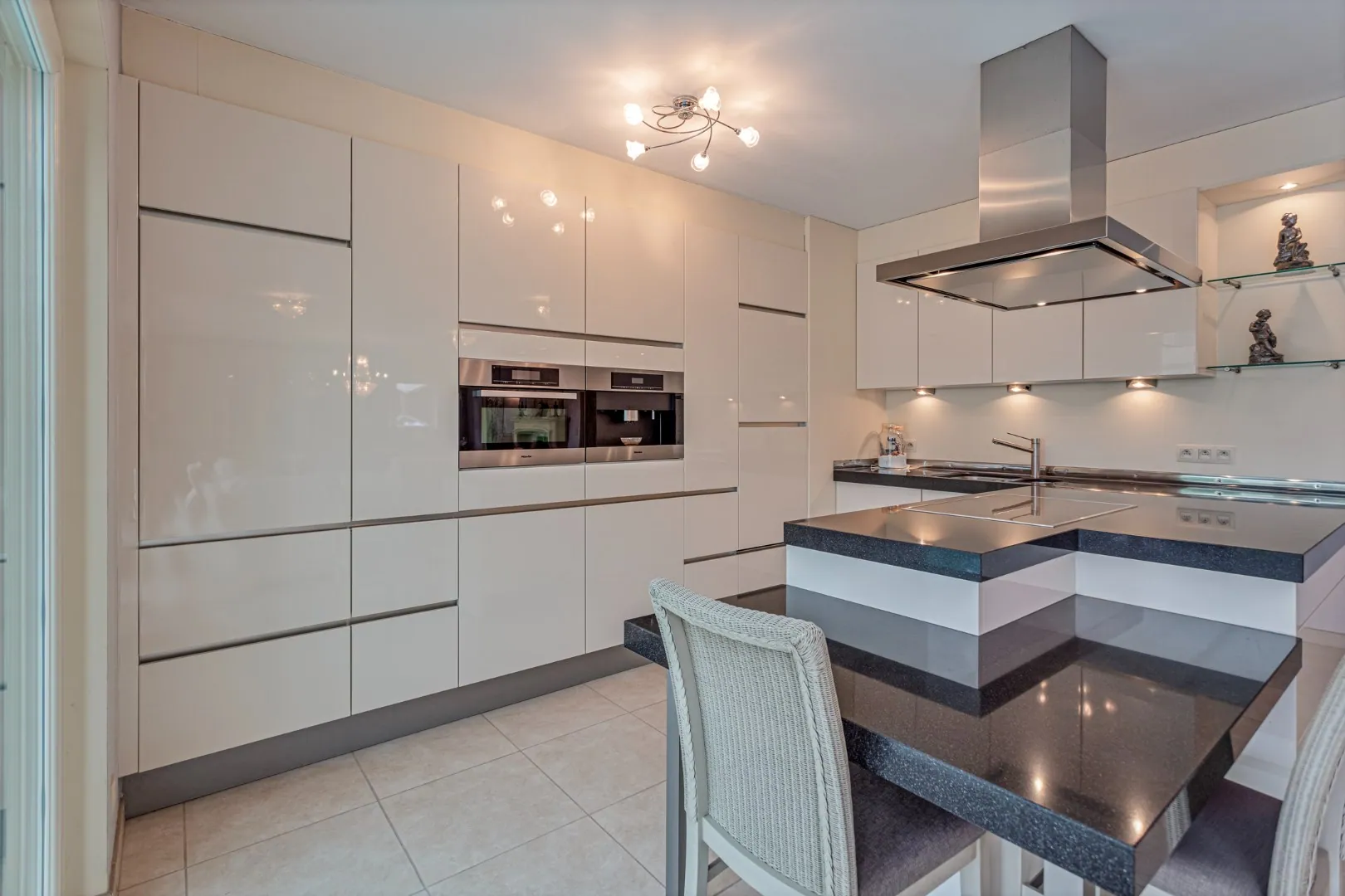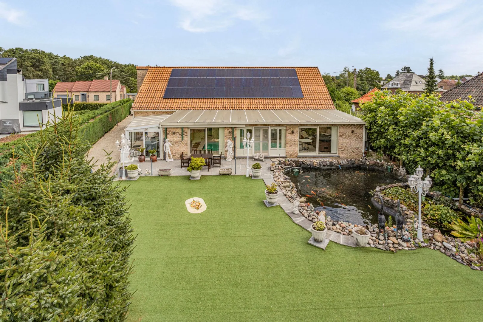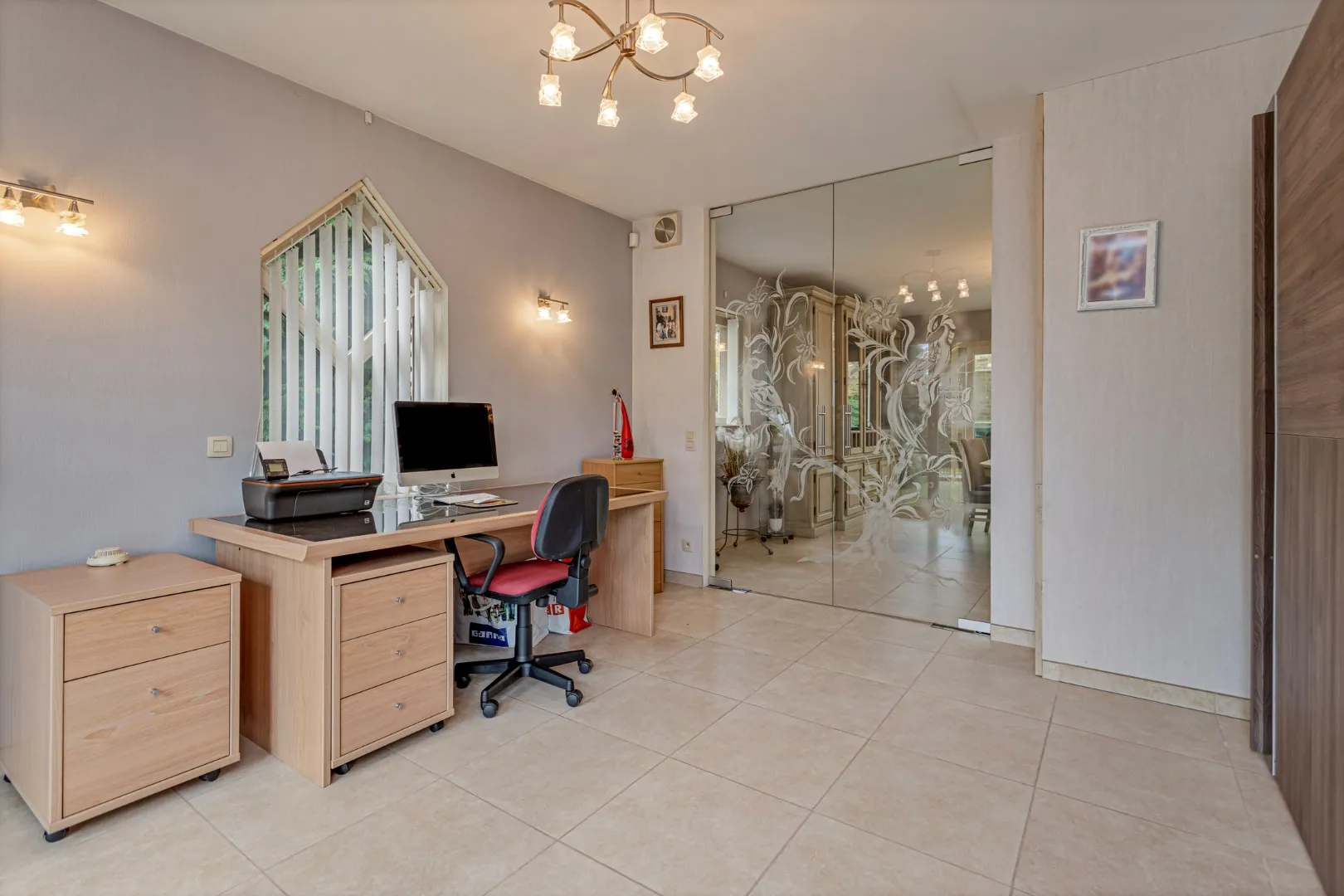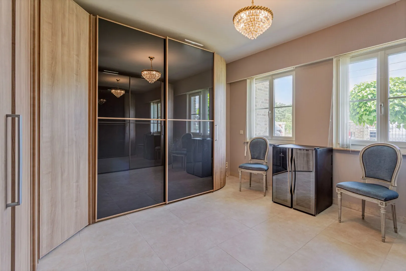 Op het gelijkvloers bevindt zich de inkomhal met gastentoilet, ruime woonkamer met volledig uitgeruste open keuken, twee slaapkamers, bureau, badkamer met dubbele wastafel en bad. Graag wat baantjes trekken? Dat kan in je eigen binnenzwembad in de veranda.