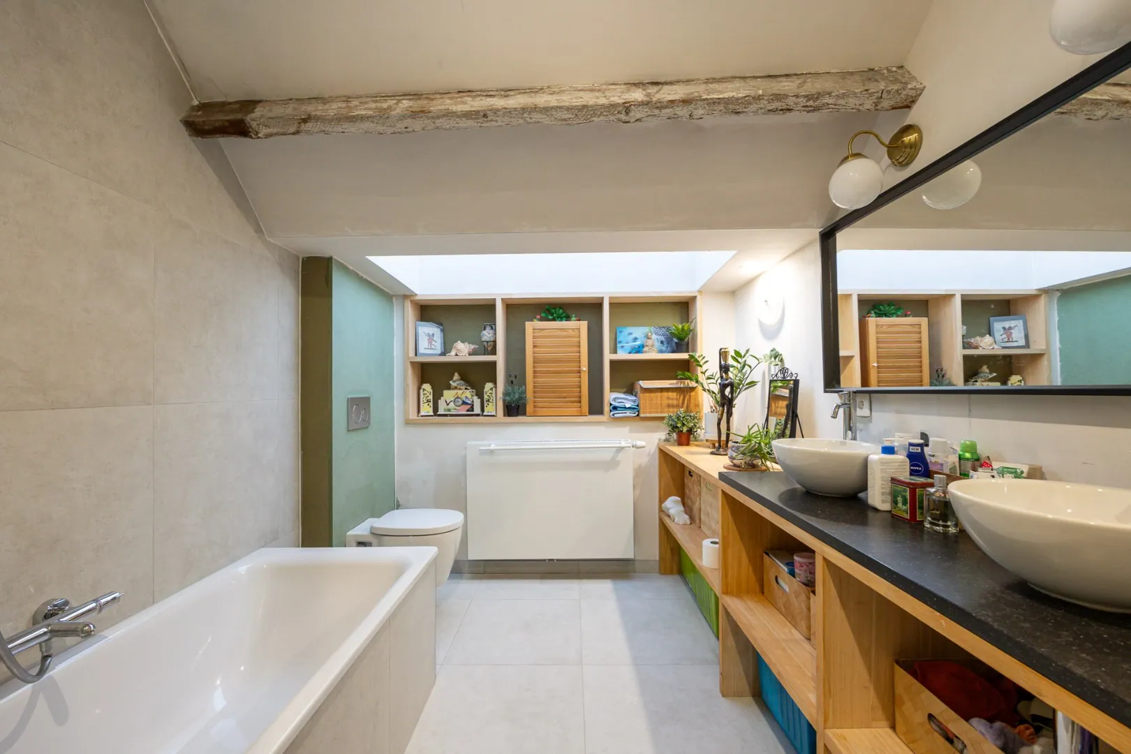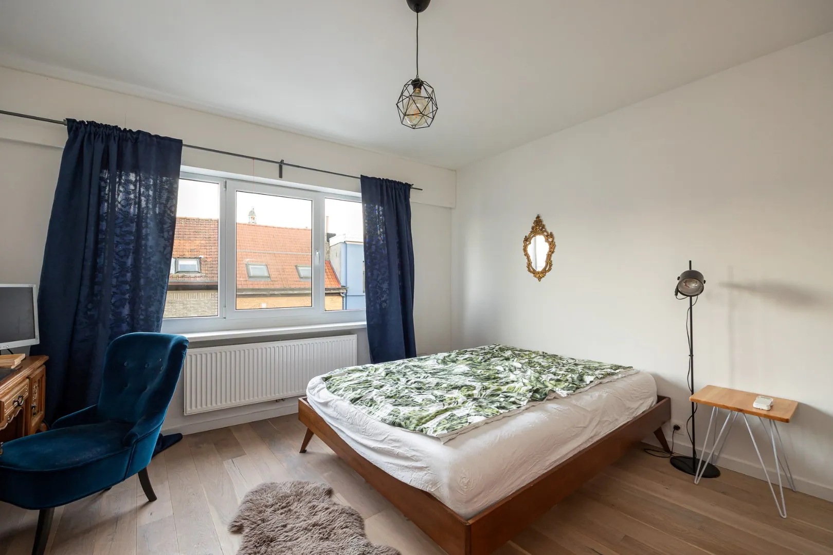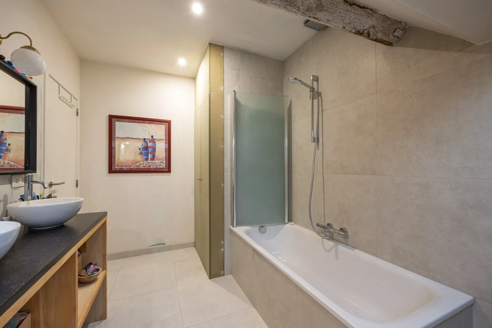 Op de tussenverdieping vinden we een eerste ruime slaapkamer. De tweede verdieping brengt ons de vernieuwde badkamer (2017), voorzien van dubbele wastafel, bad en derde toilet en een tweede slaapkamer voorzien van eiken parket. De slaapkamers zijn voorzien van airco (koud-warm).
