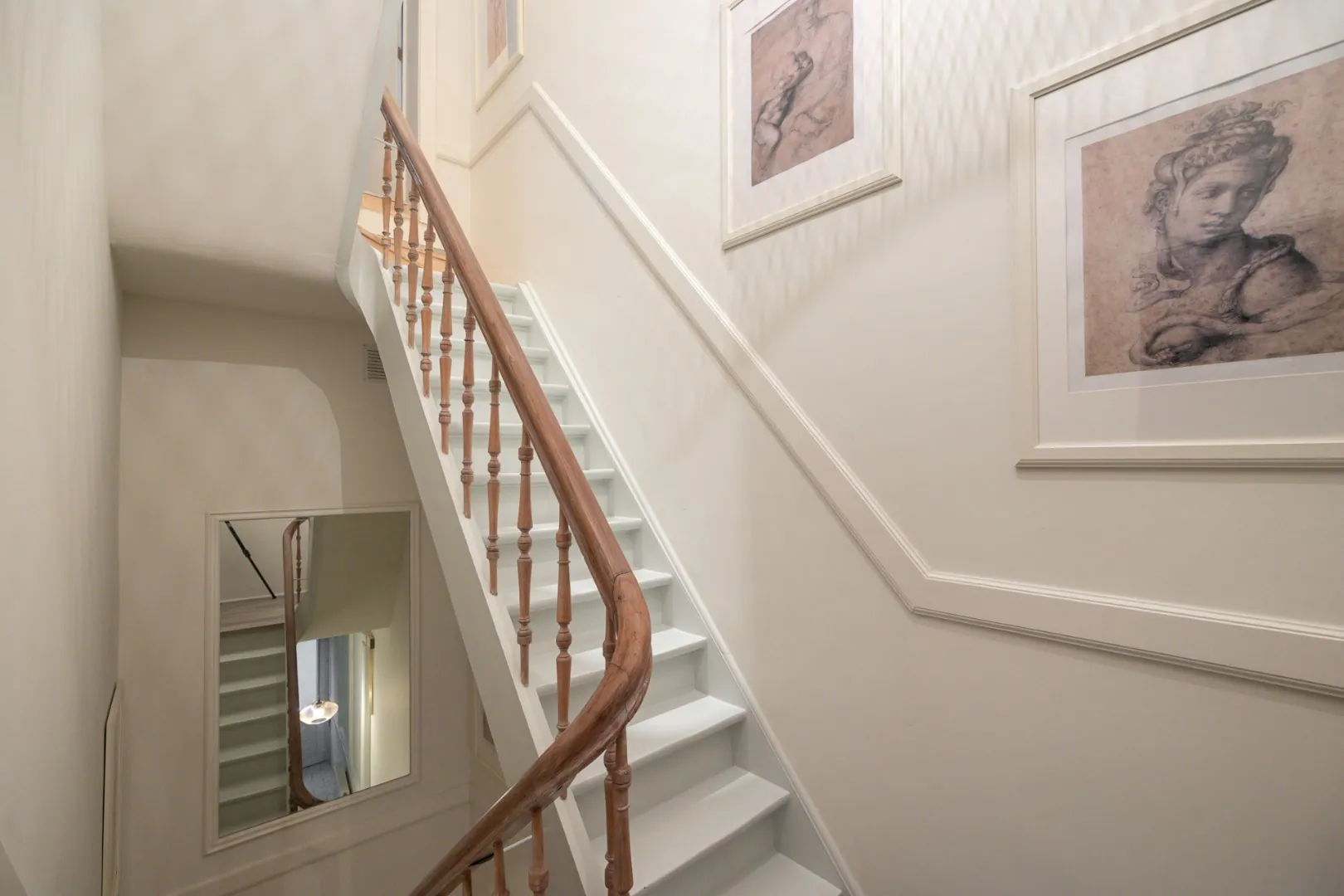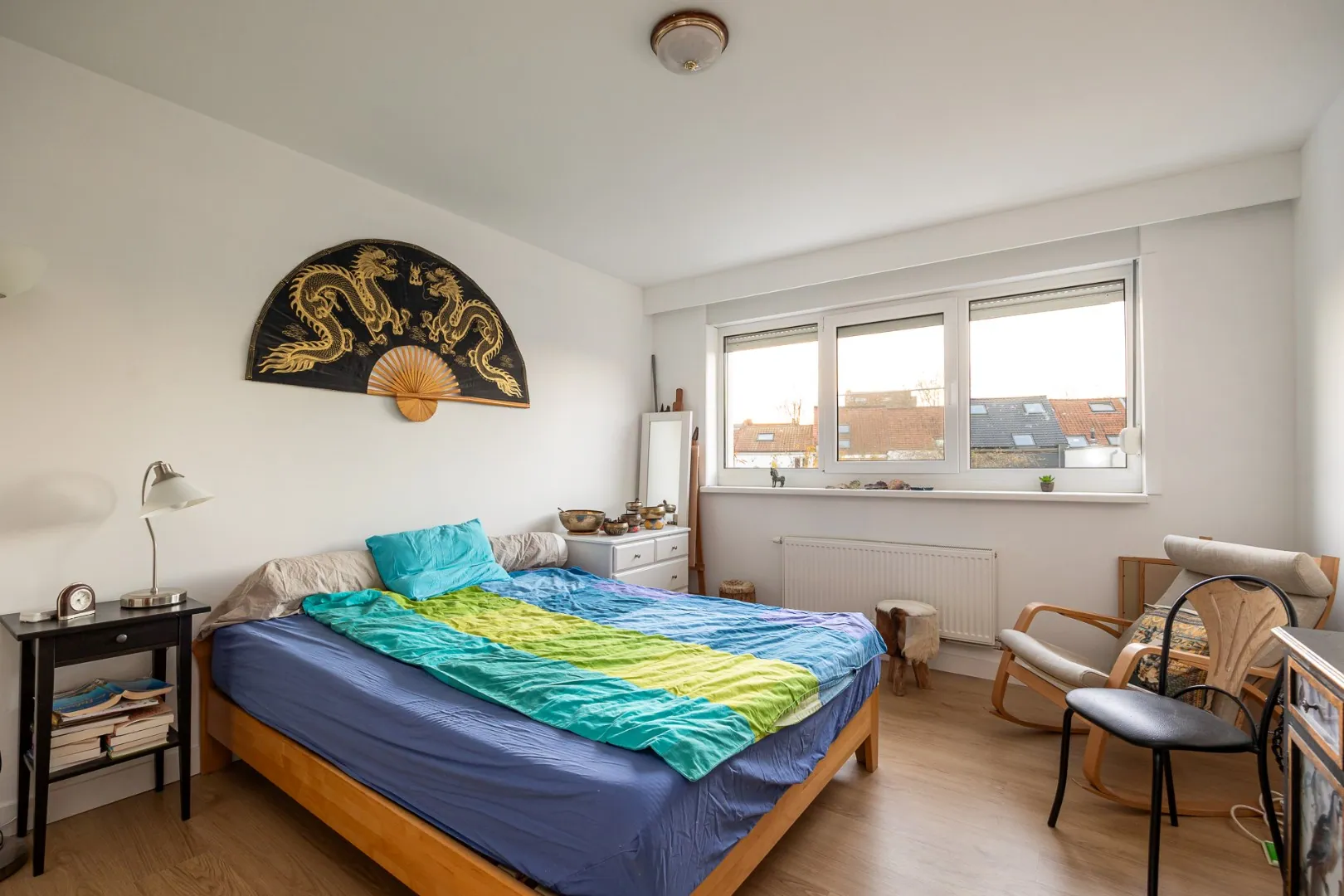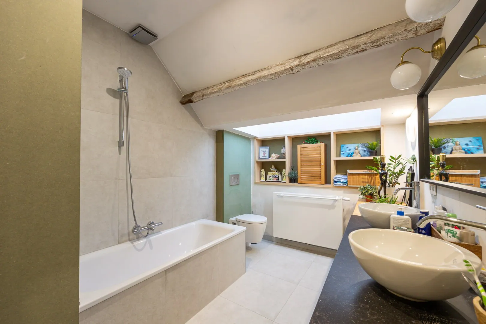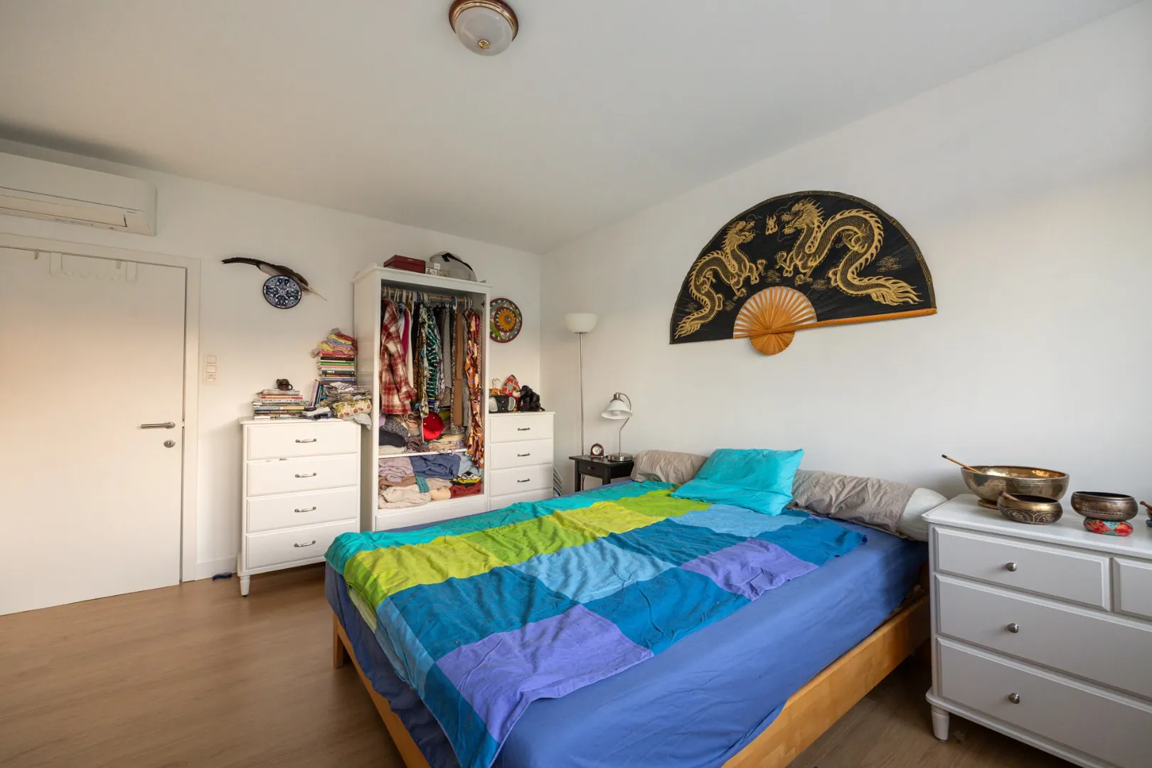 Op de tussenverdieping vinden we een eerste ruime slaapkamer. De tweede verdieping brengt ons de vernieuwde badkamer (2017), voorzien van dubbele wastafel, bad en derde toilet en een tweede slaapkamer voorzien van eiken parket. De slaapkamers zijn voorzien van airco (koud-warm).