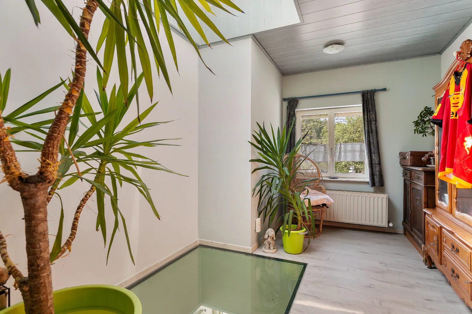 De woonkamer, keuken, eerste badkamer (bad en toilet) en de veranda bevinden zich op het gelijkvloers. Vanuit de veranda heb je toegang tot het terras met aanpalende ZW-tuin. De tuin is ook toegankelijk via een zij ingang.