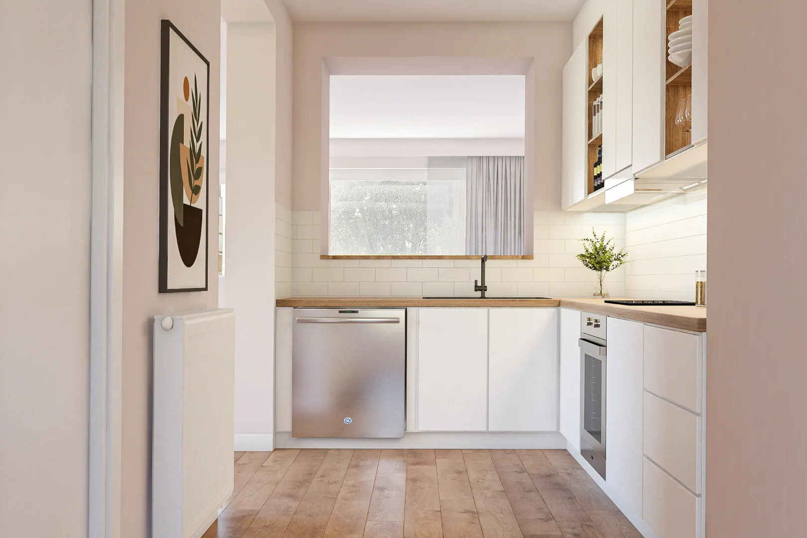 Op het gelijkvloers bevinden zich de inkomhal, ruime garage, eerste keuken, badkamer, toilet, 2 slaapkamers en ZW-tuin. De gelijkvloerse indeling biedt eveneens bijzonder potentieel voor een vrij beroep, co-wonen, kantoor, of bijvoorbeeld studio.