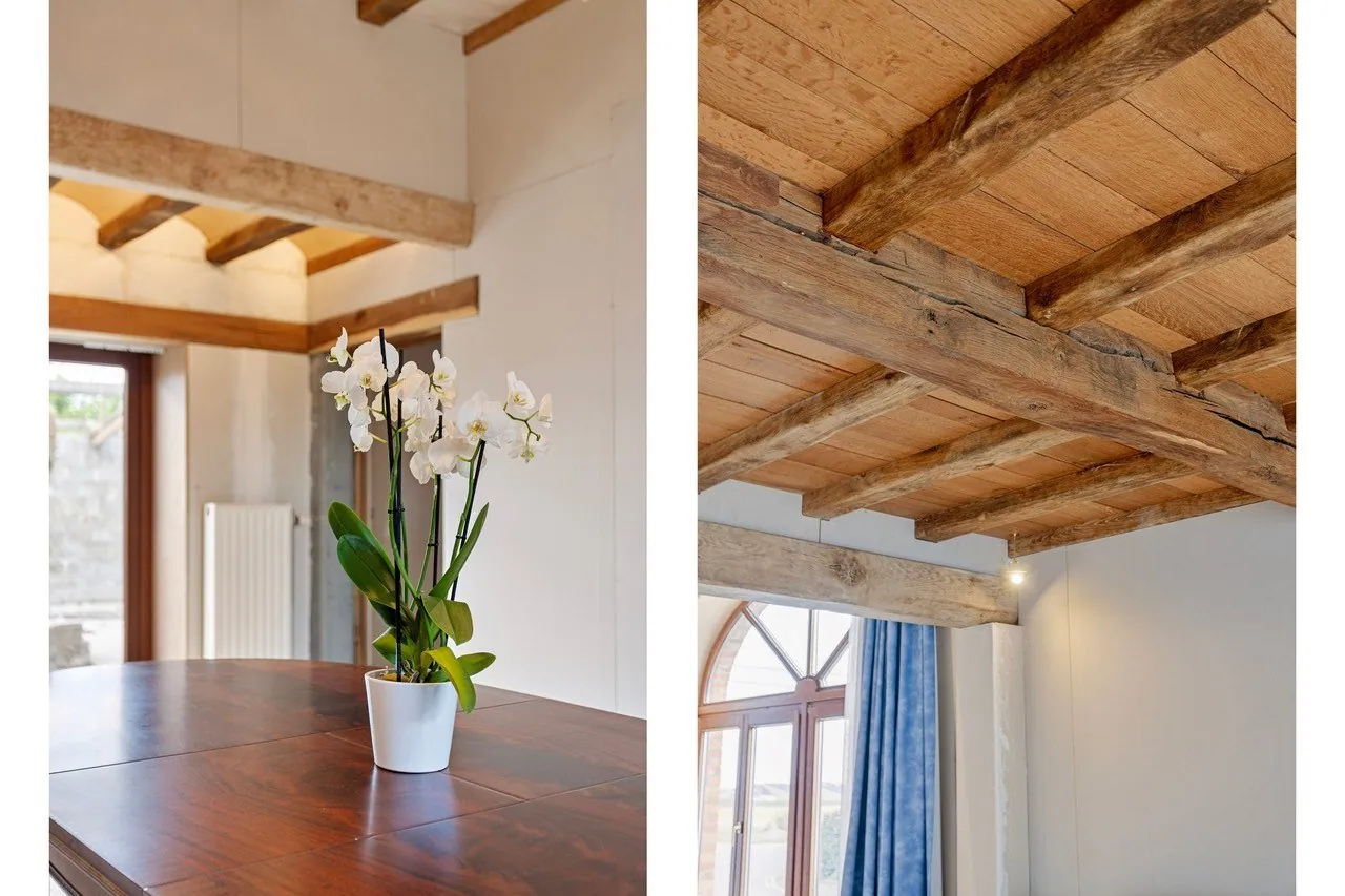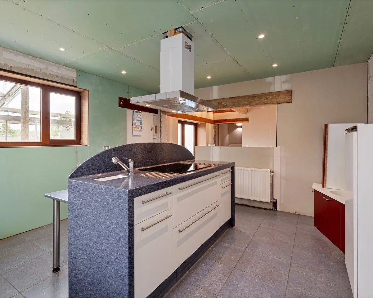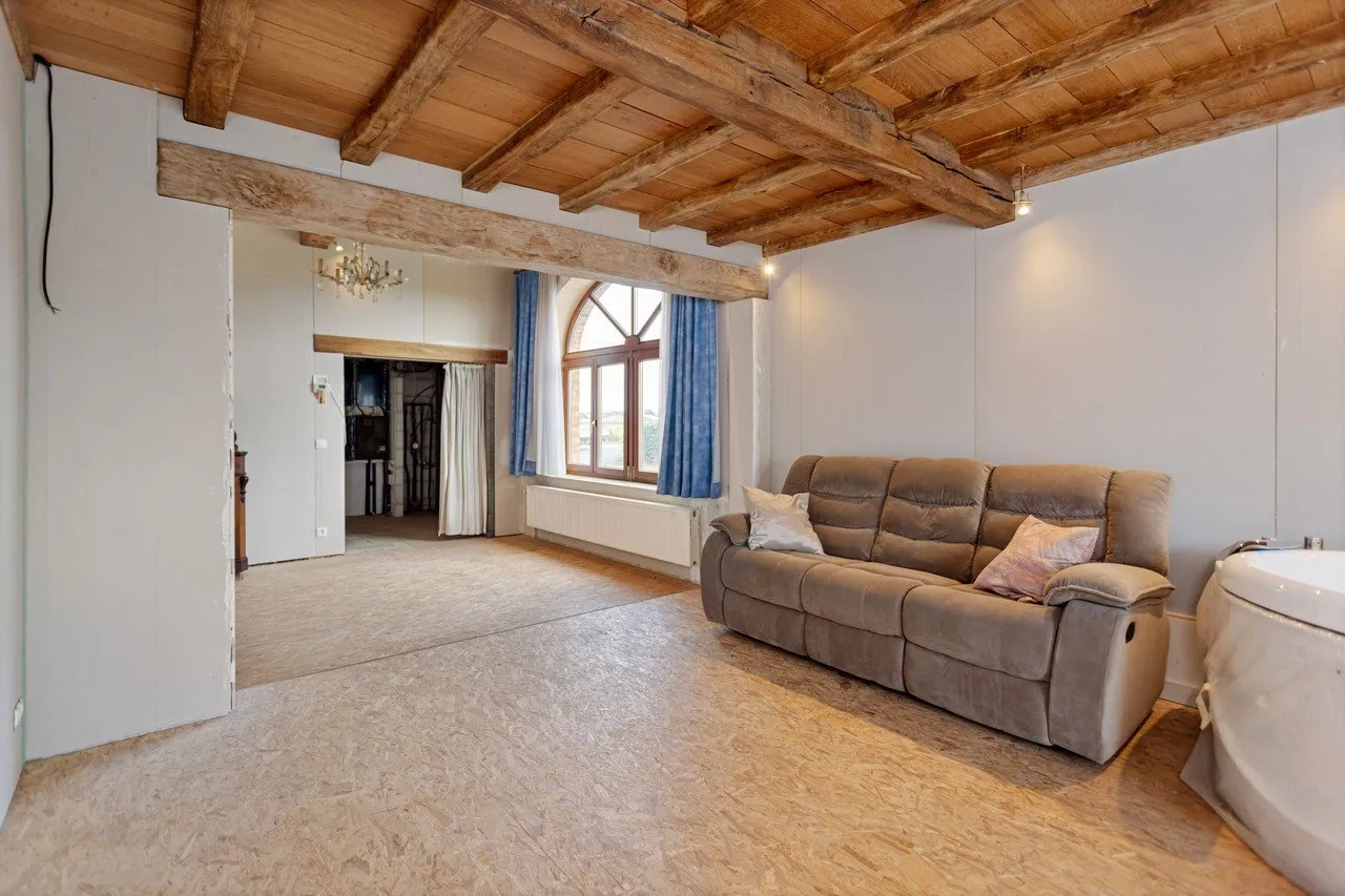 Met een bewoonbare oppervlakte van meer dan 300m² biedt deze ruime charmante hoeve tal van mogelijkheden om het na afwerking om te toveren tot een echt pareltje! Waar voorheen stallingen waren omvat het gelijkvloers nu een inkomhal met toilet, ruime woon- en eetkamer, keuken uitgerust met groot kookeiland, badkamer, ruime eerste slaapkamer en veel opbergplaats in de aparte berging/bijkeuken.