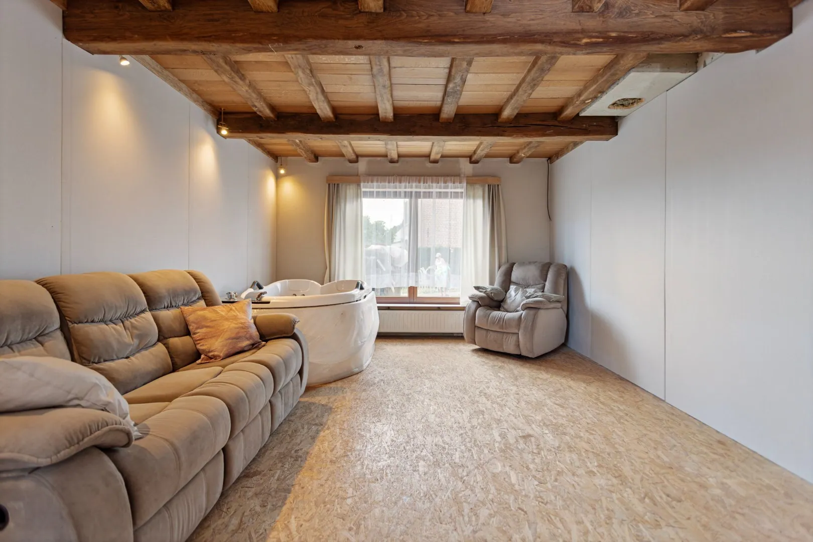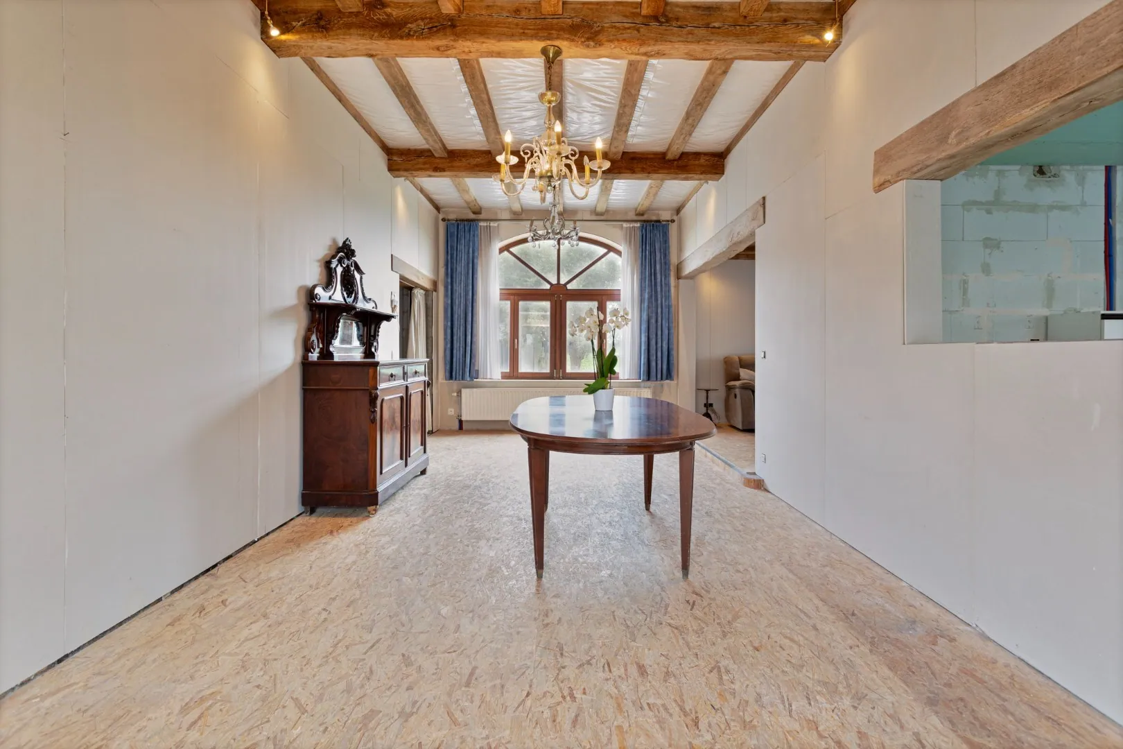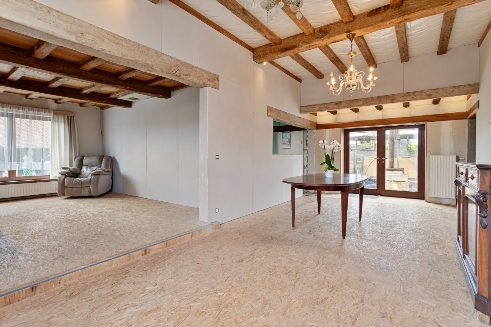 Met een bewoonbare oppervlakte van meer dan 300m² biedt deze ruime charmante hoeve tal van mogelijkheden om het na afwerking om te toveren tot een echt pareltje! Waar voorheen stallingen waren omvat het gelijkvloers nu een inkomhal met toilet, ruime woon- en eetkamer, keuken uitgerust met groot kookeiland, badkamer, ruime eerste slaapkamer en veel opbergplaats in de aparte berging/bijkeuken.