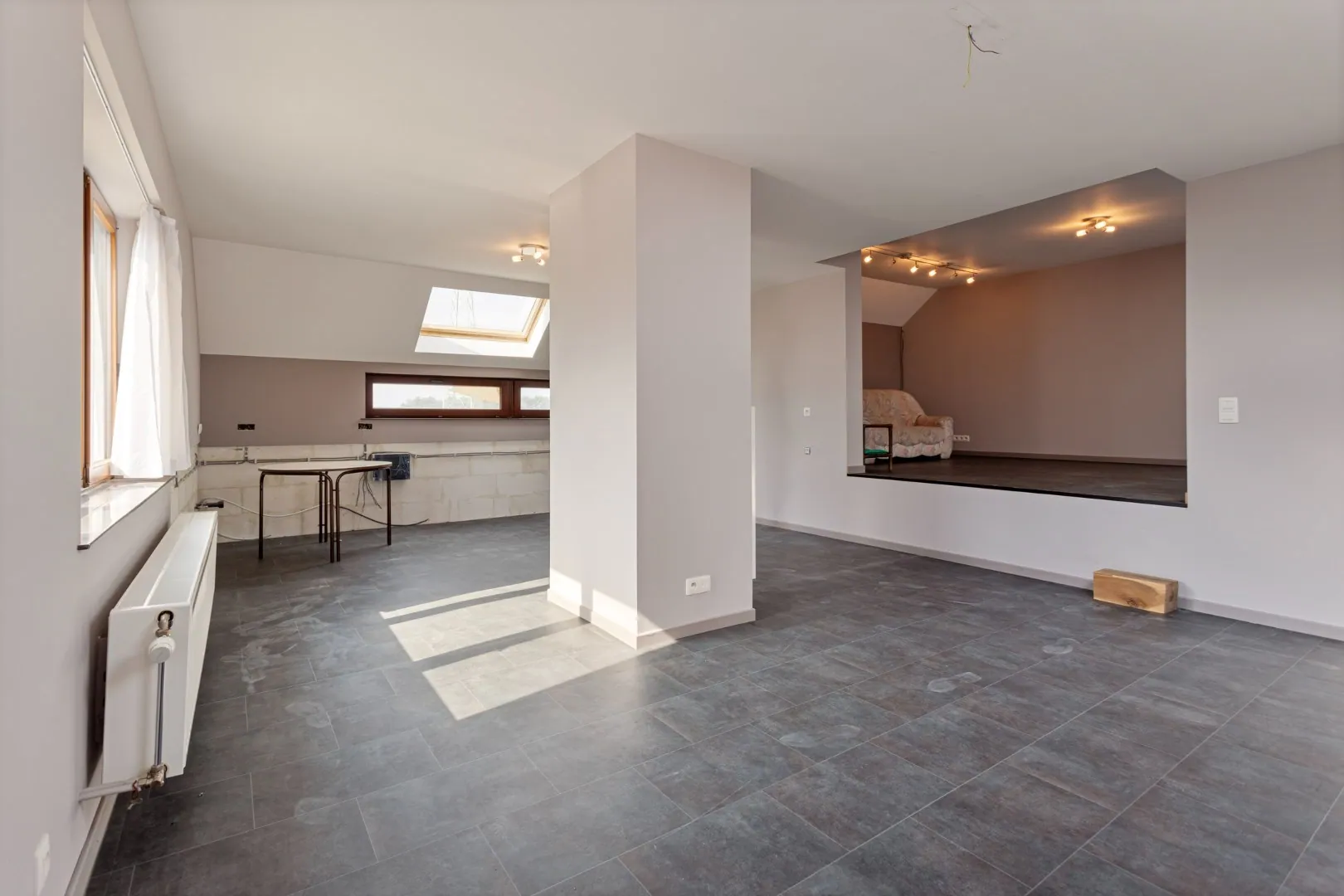 Op de eerste verdieping vinden we een studio (62m²) met mogelijkheid om een aparte keuken te plaatsen, ideaal voor kangoeroewonen. Verder bestaat deze verdieping uit een nog af te werken (casco met technieken) 2e badkamer, 3 slaapkamers (1 met wateraansluiting) en een 3e toilet.