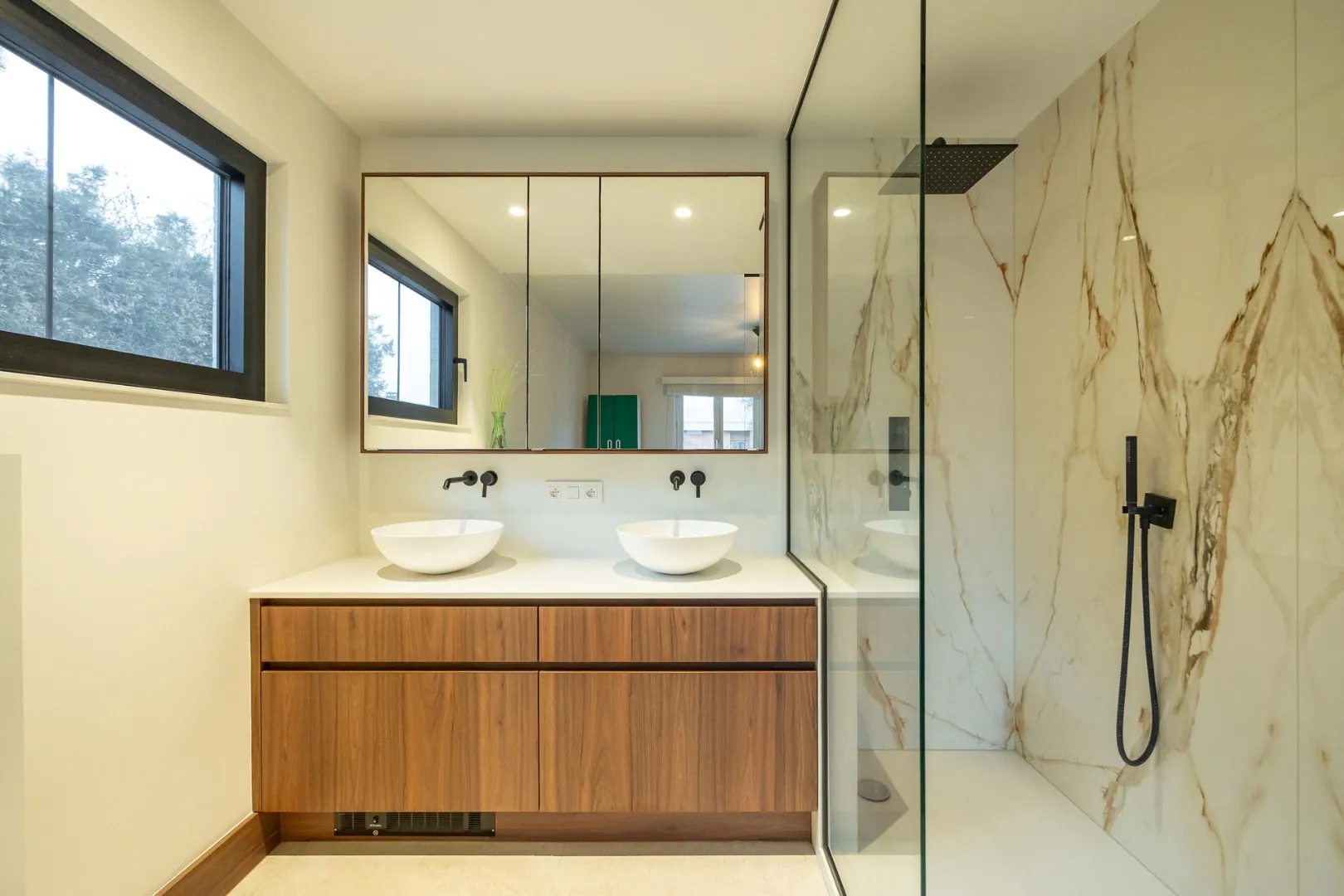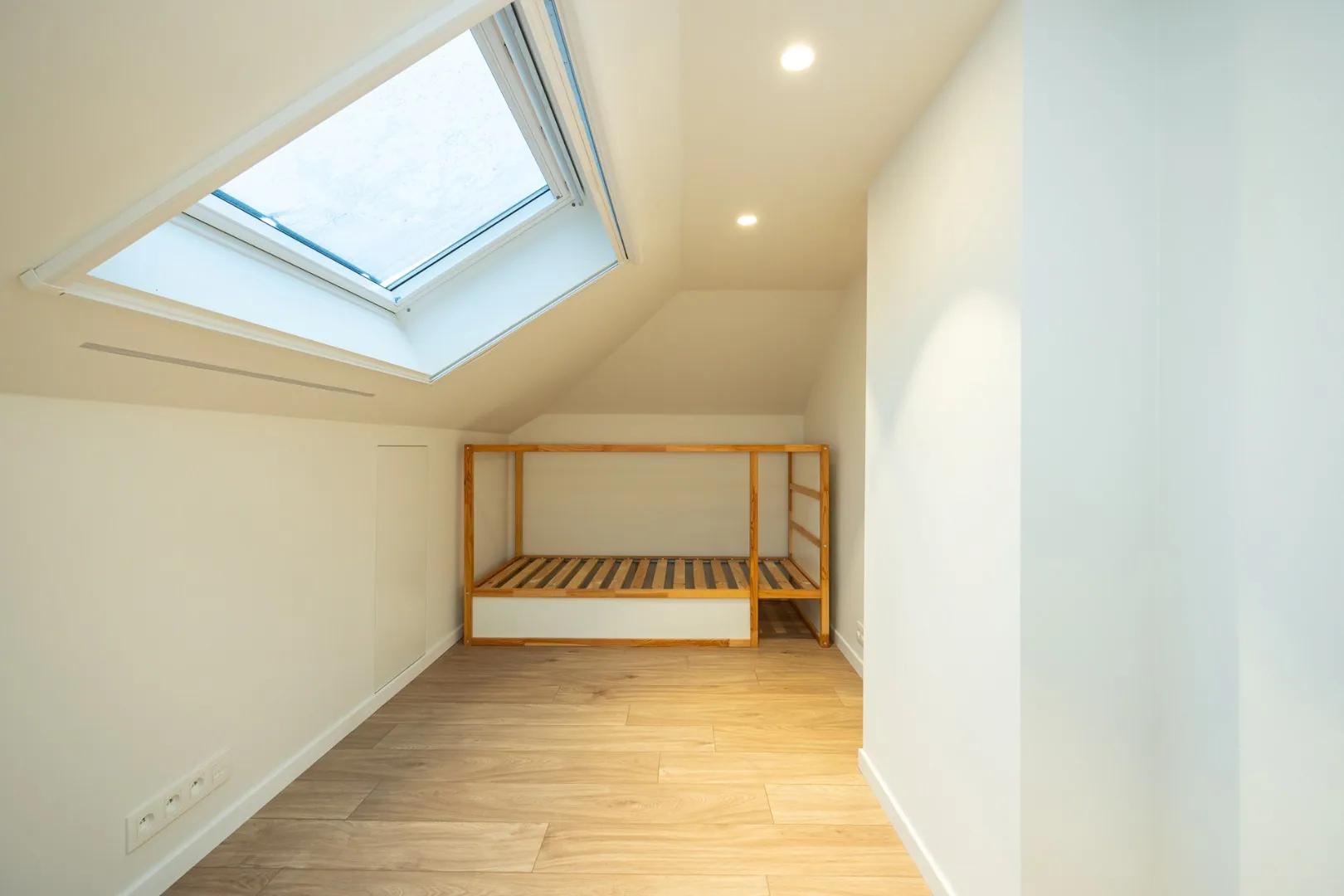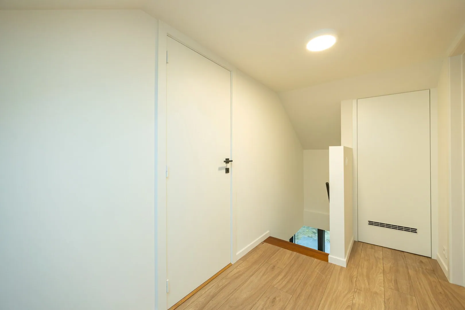 Op het gelijkvloers bevindt zich een volwaardige slaapkamer met aansluitende badkamer, ideaal als master-bedroom of voor wie het comfort van gelijkvloers wonen verkiest. De verdieping brengt twee extra slaapkamers en een tweede, smaakvol ingerichte badkamer, perfect afgestemd op de noden van een gezin.