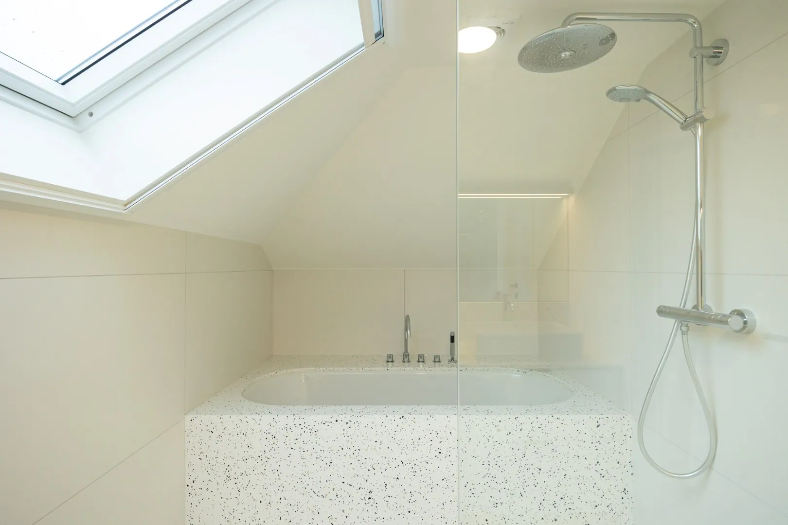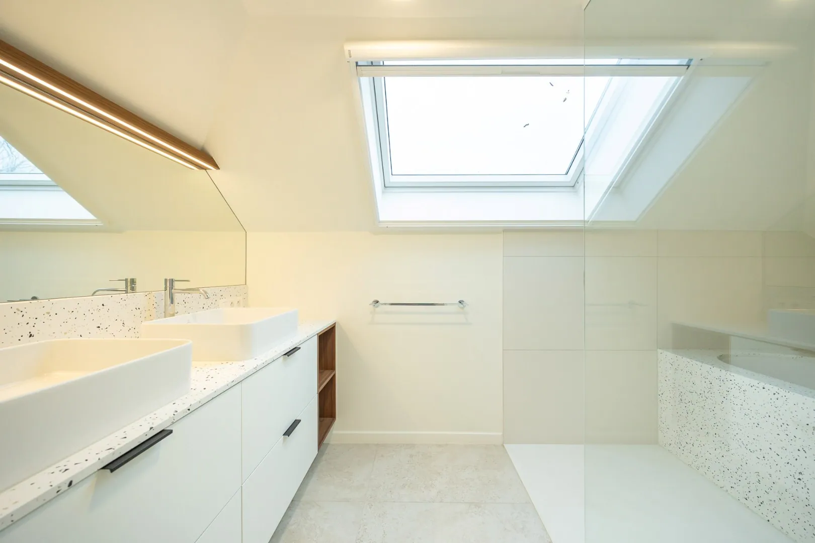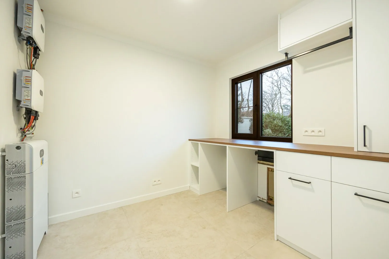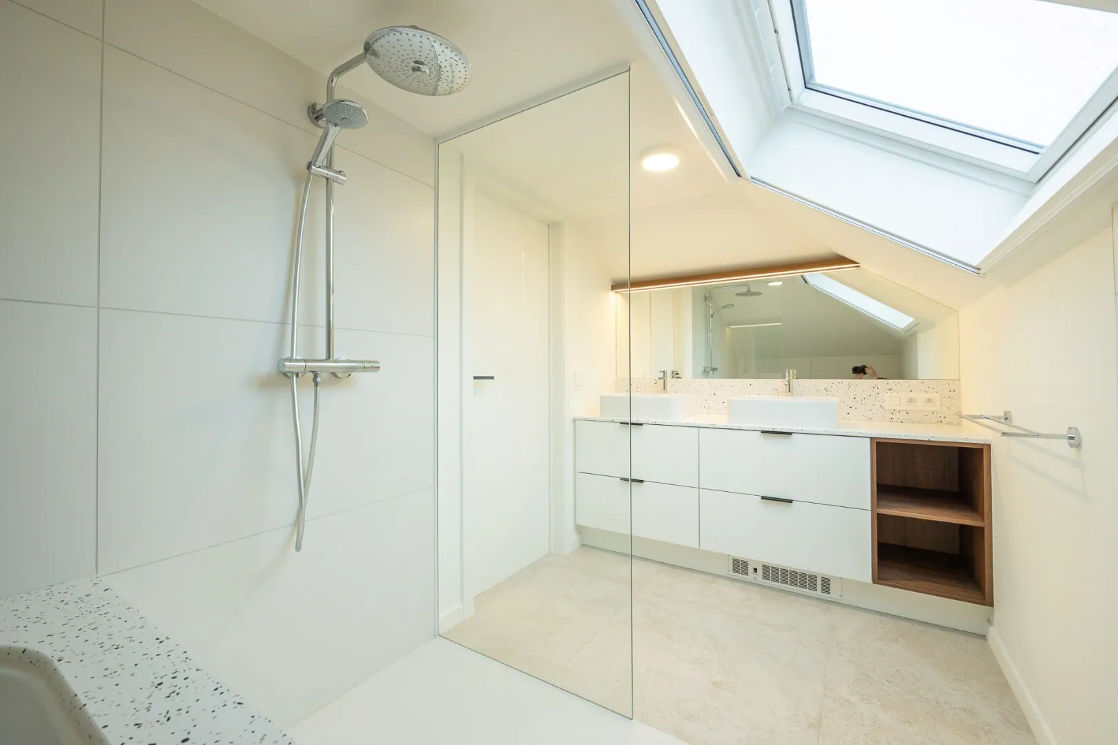 Op het gelijkvloers bevindt zich een volwaardige slaapkamer met aansluitende badkamer, ideaal als master-bedroom of voor wie het comfort van gelijkvloers wonen verkiest. De verdieping brengt twee extra slaapkamers en een tweede, smaakvol ingerichte badkamer, perfect afgestemd op de noden van een gezin.