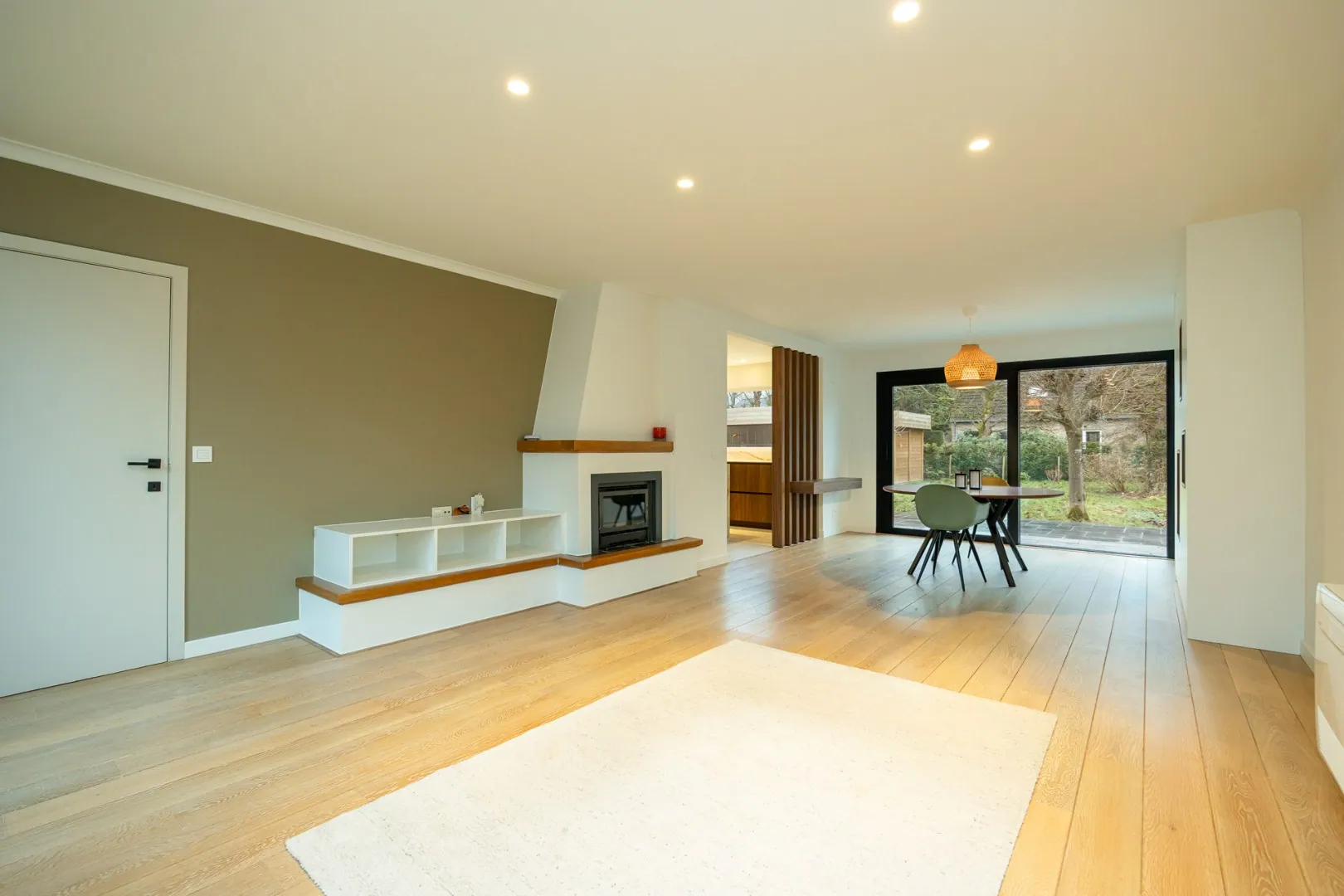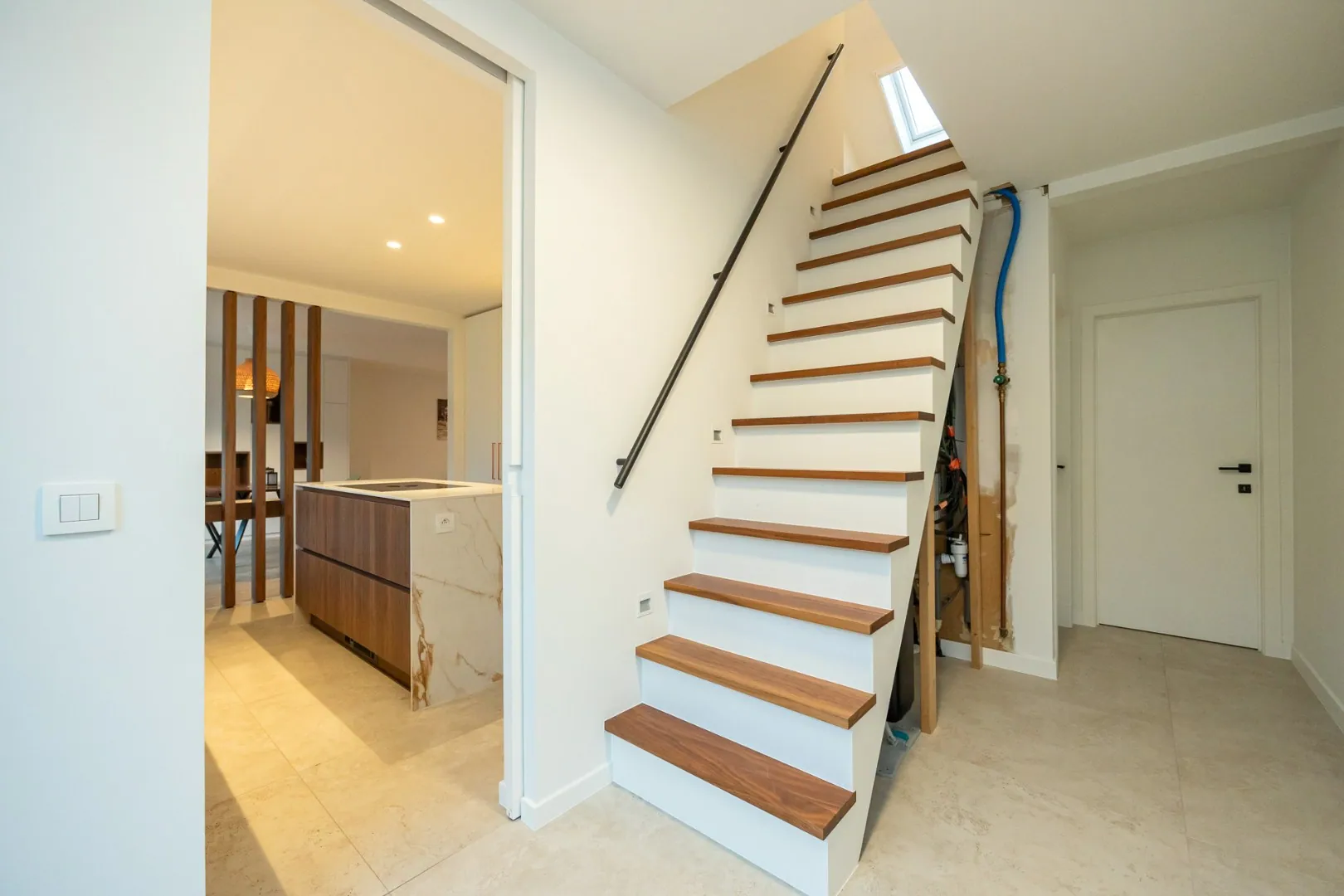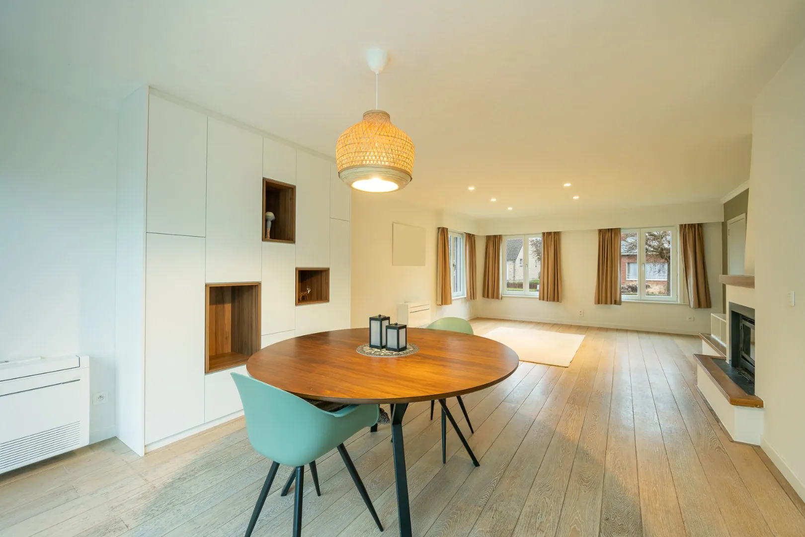 Bij het betreden van de woning wordt u verwelkomd in een ruime en lichtrijke leefruimte, waar een verfijnde parketvloer en een harmonieuze indeling zorgen voor een warme, stijlvolle sfeer. De moderne, volledig uitgeruste keuken sluit naadloos aan op de leefruimte en creëert een open woonbeleving die uitnodigt tot gezellig samenzijn.