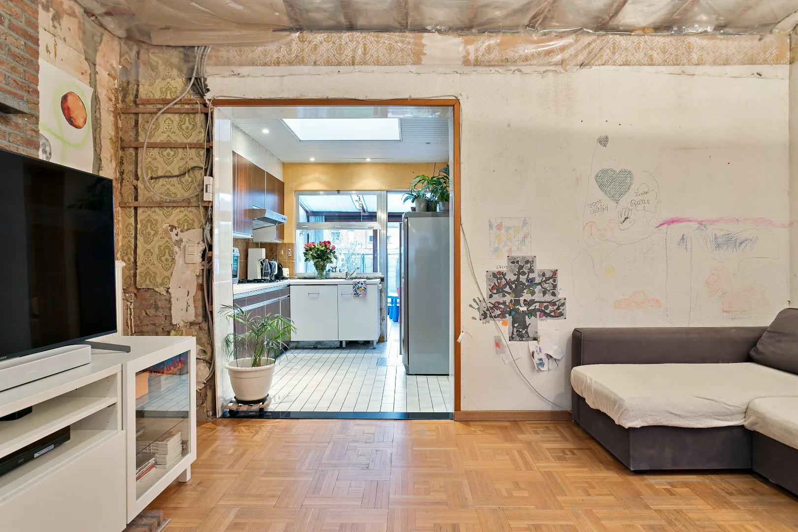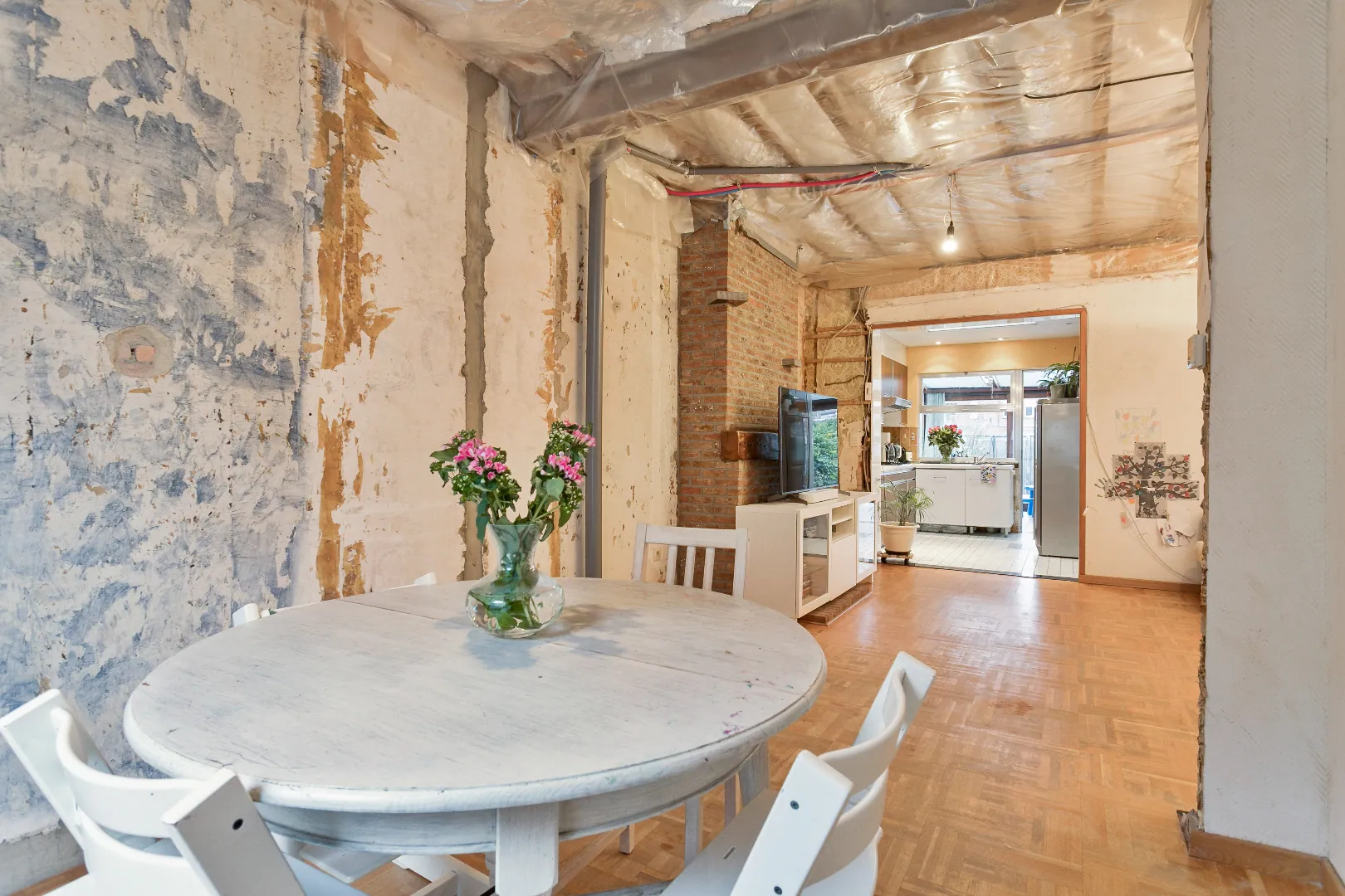 Voor wie op zoek is naar een degelijke gezinswoning waarbij de essentiële renovaties reeds werden uitgevoerd (nieuw dak + isolatie, nieuwe ramen, elektrische rolluiken, centrale verwarming, vernieuwde leidingen, nieuwe badkamer, zonnepanelen, ...), is deze af te werken woning met bijzonder potentieel een absolute buitenkans.