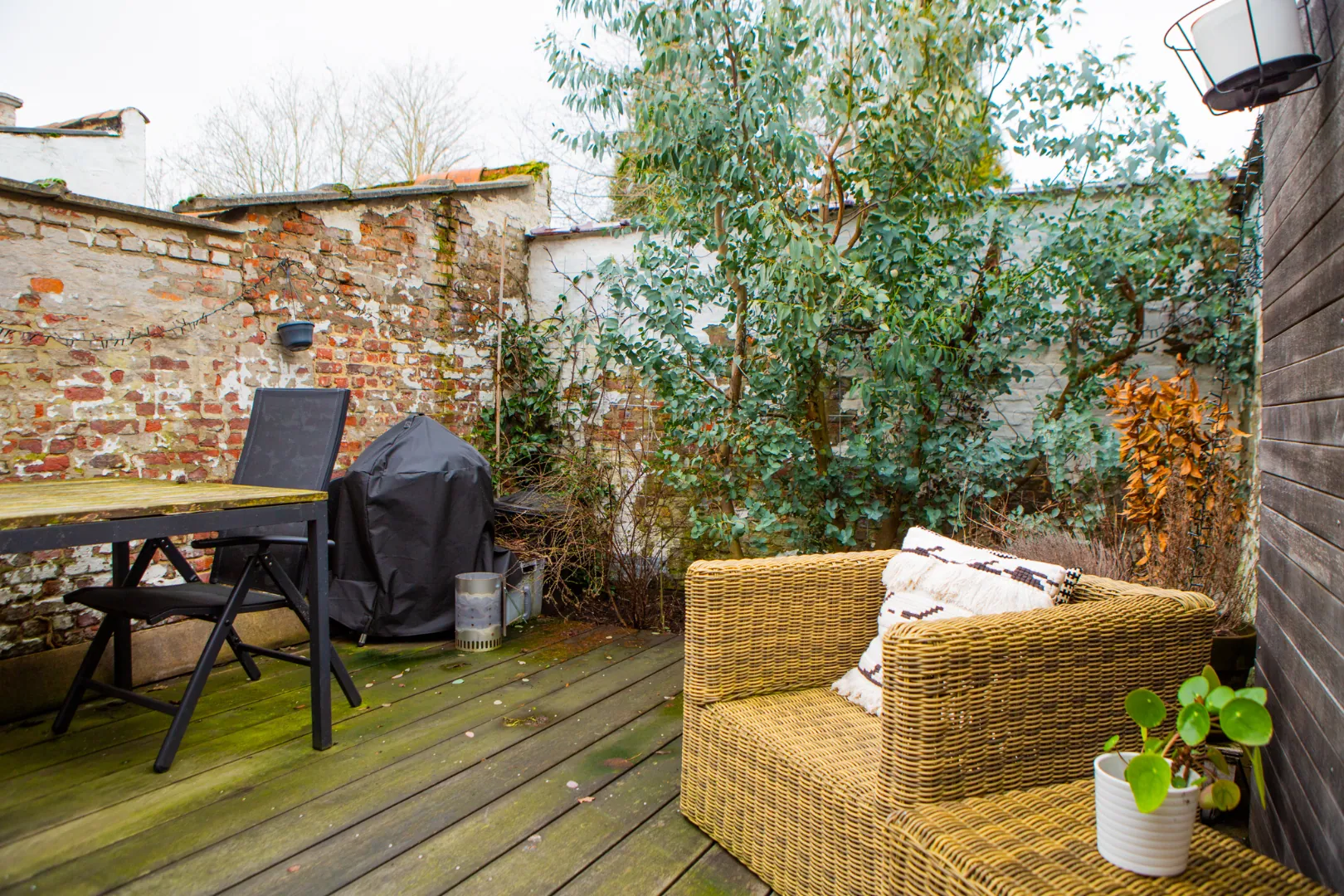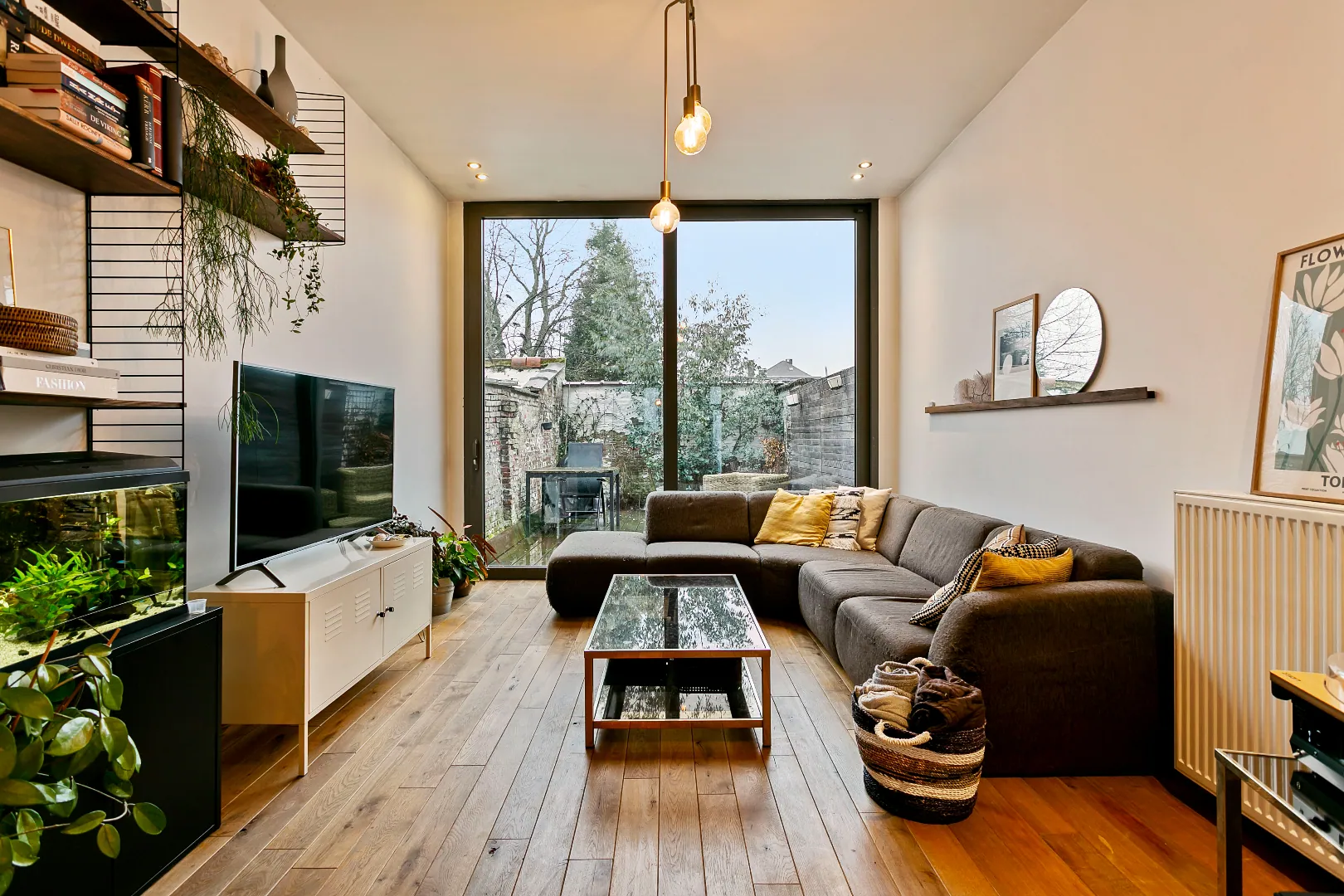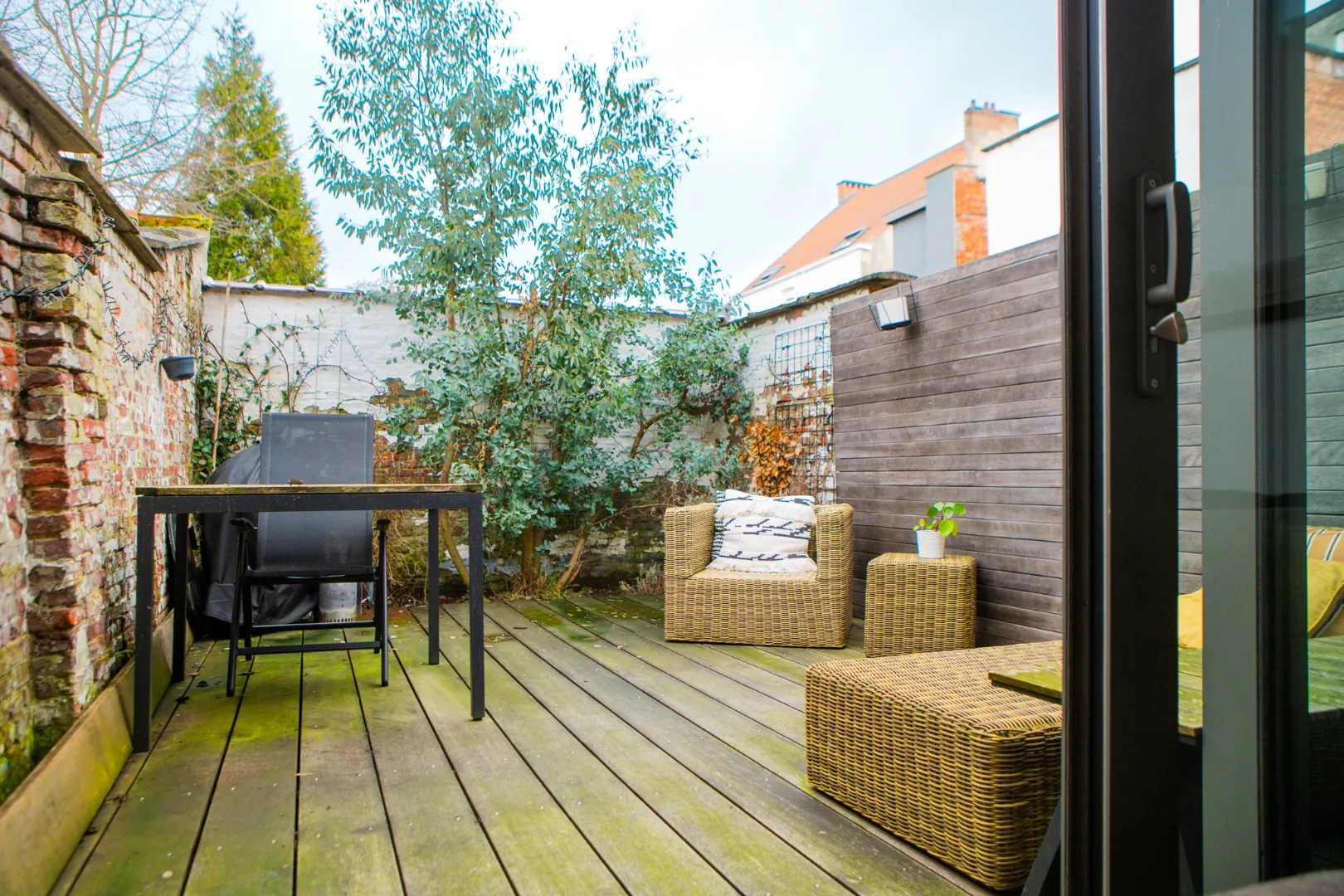 Dit grote schuifraam geeft toegang tot het sfeervolle en zuiders aanvoelende zonnige stadstuintje.