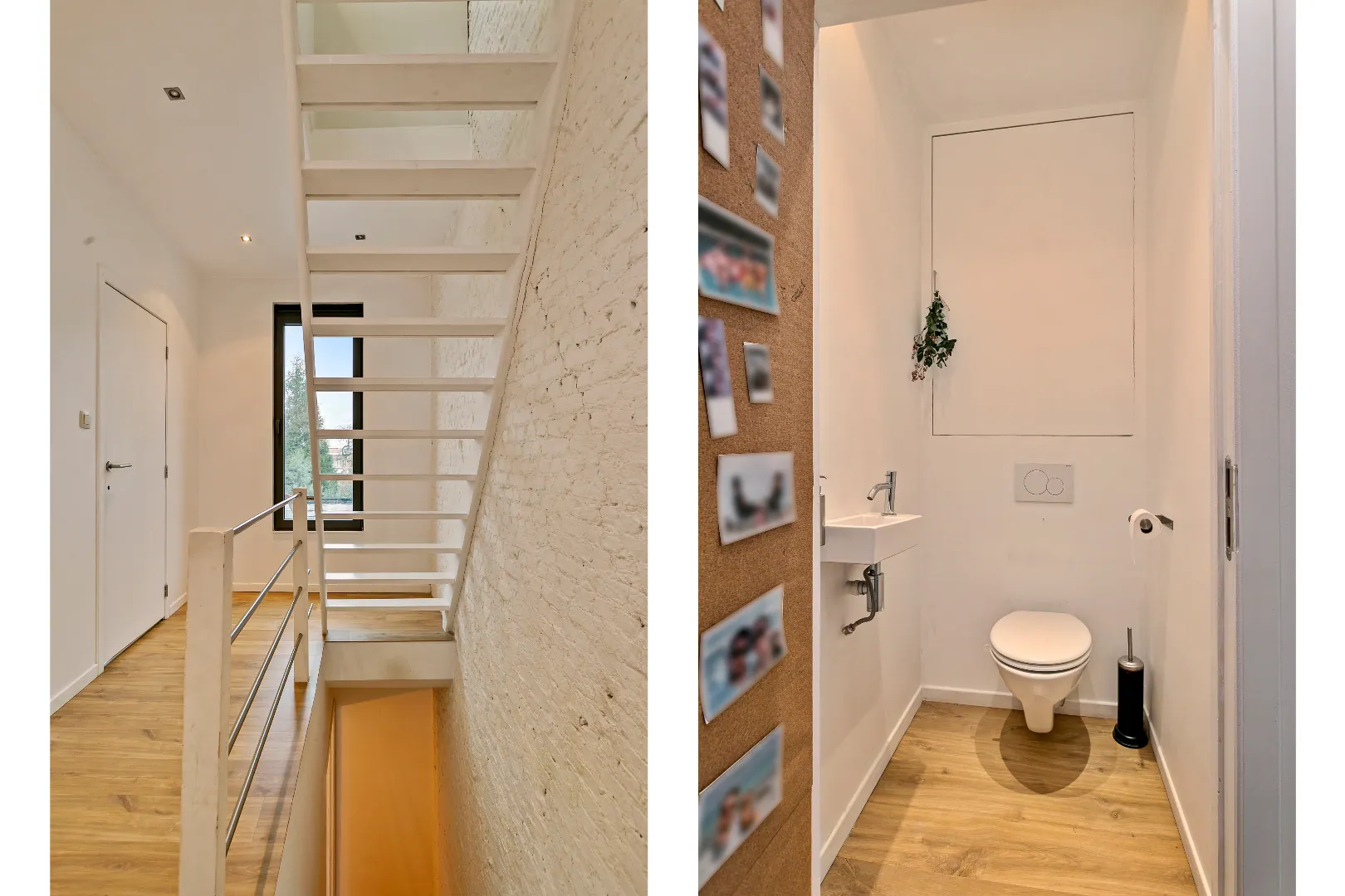 Op de eerste verdieping vind je een eerste ruime slaapkamer, toilet, badkamer met inloopdouche en trap naar de master bedroom op de bovenste verdieping. Deze tweede kamer kan worden opgedeeld in een extra slaapkamer.
