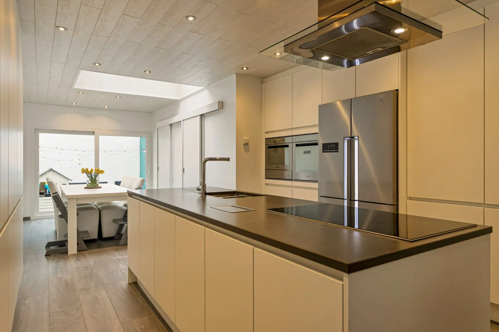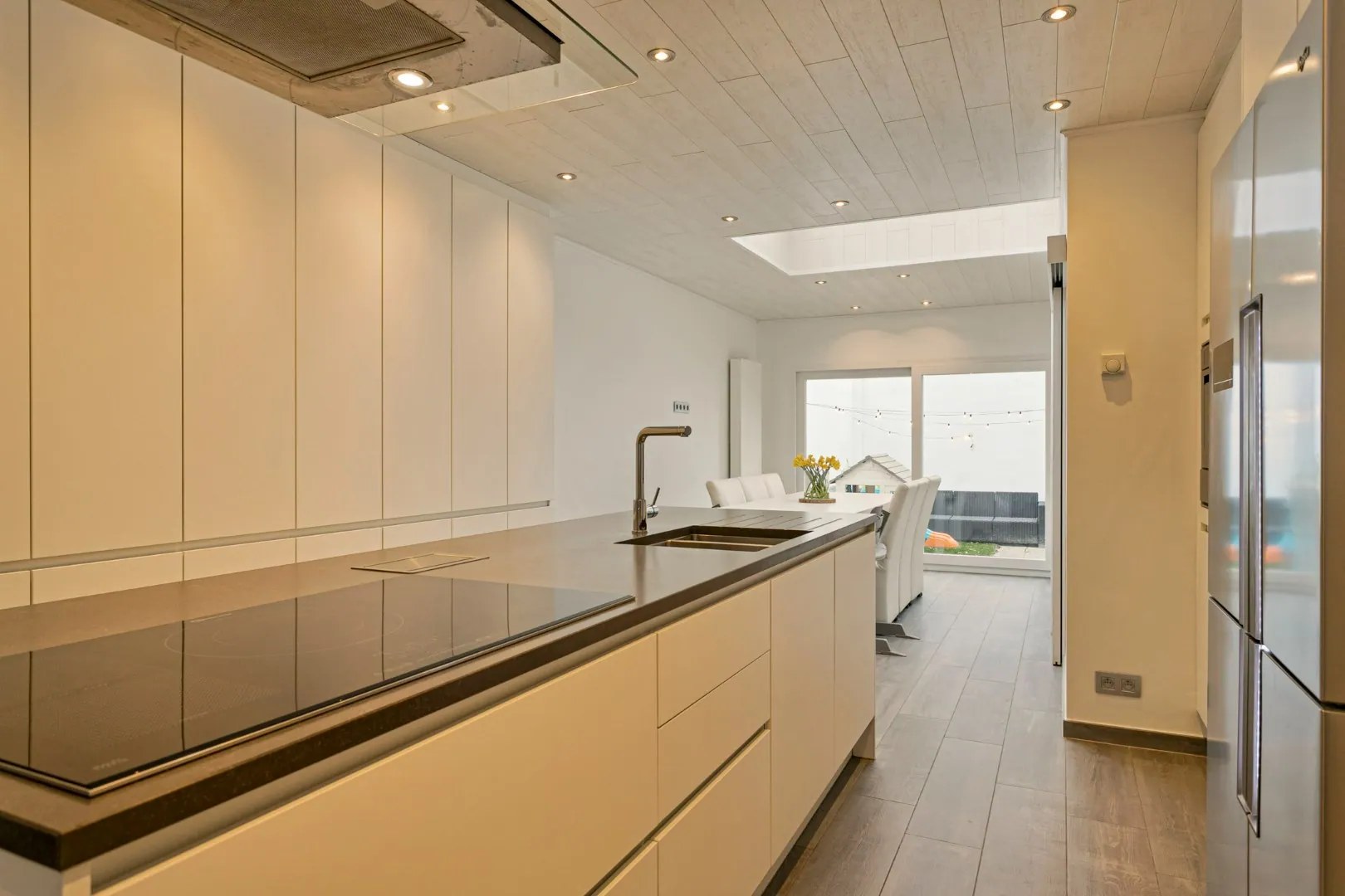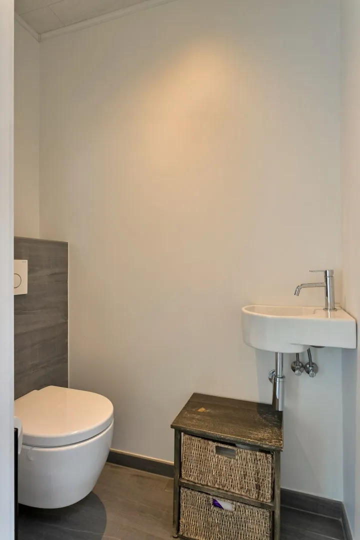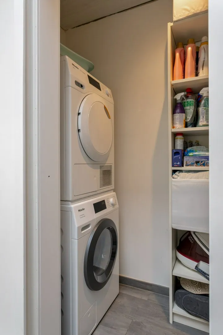 We betreden de woning in de inkomhal, met toegang tot de gezellige leefruimte. Aansluitend vinden we de lichtrijke, gerenoveerde (2016) keuken (inductiekookplaat, Amerikaanse koelkast, oven, microgolfoven, warmtelade en vaatwas) met eetplaats en een groot schuifraam die toegang biedt tot het sfeervolle stadstuintje. Naast de keuken vind je de wasplaats met extra bergruimte en een eerste toilet.