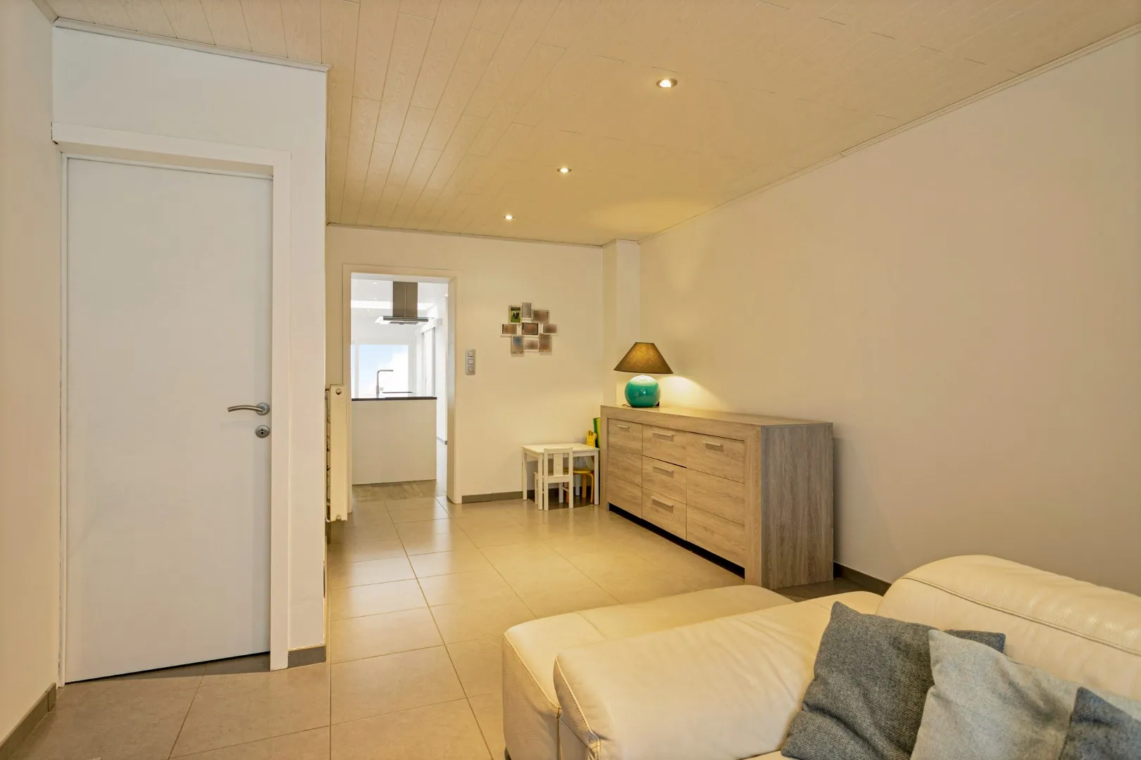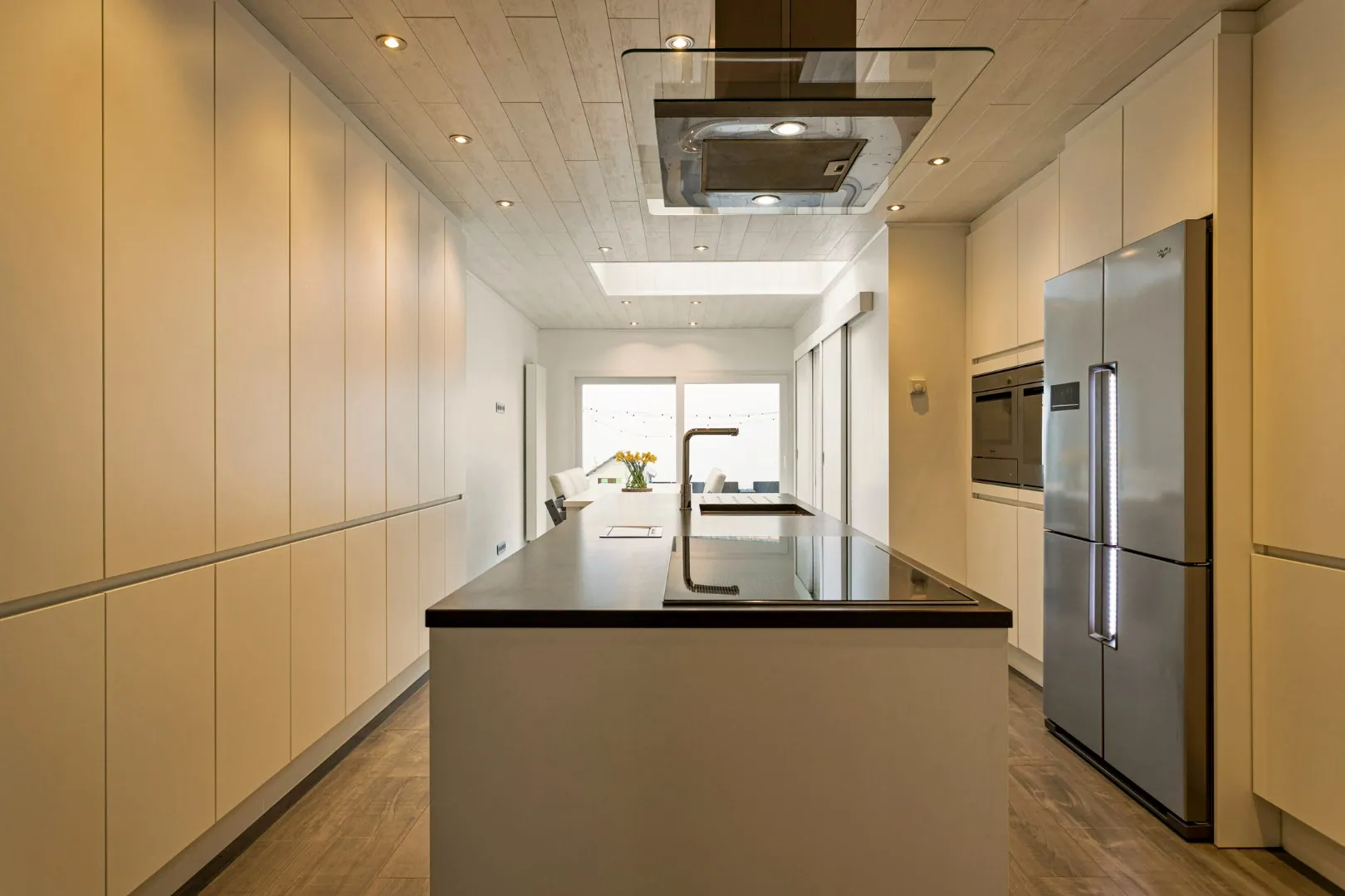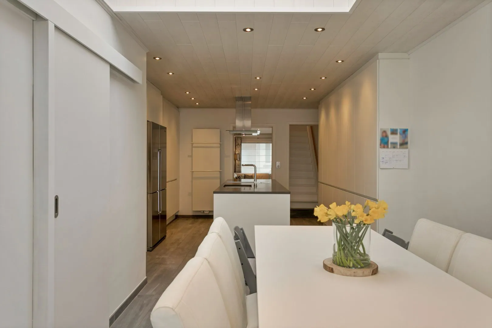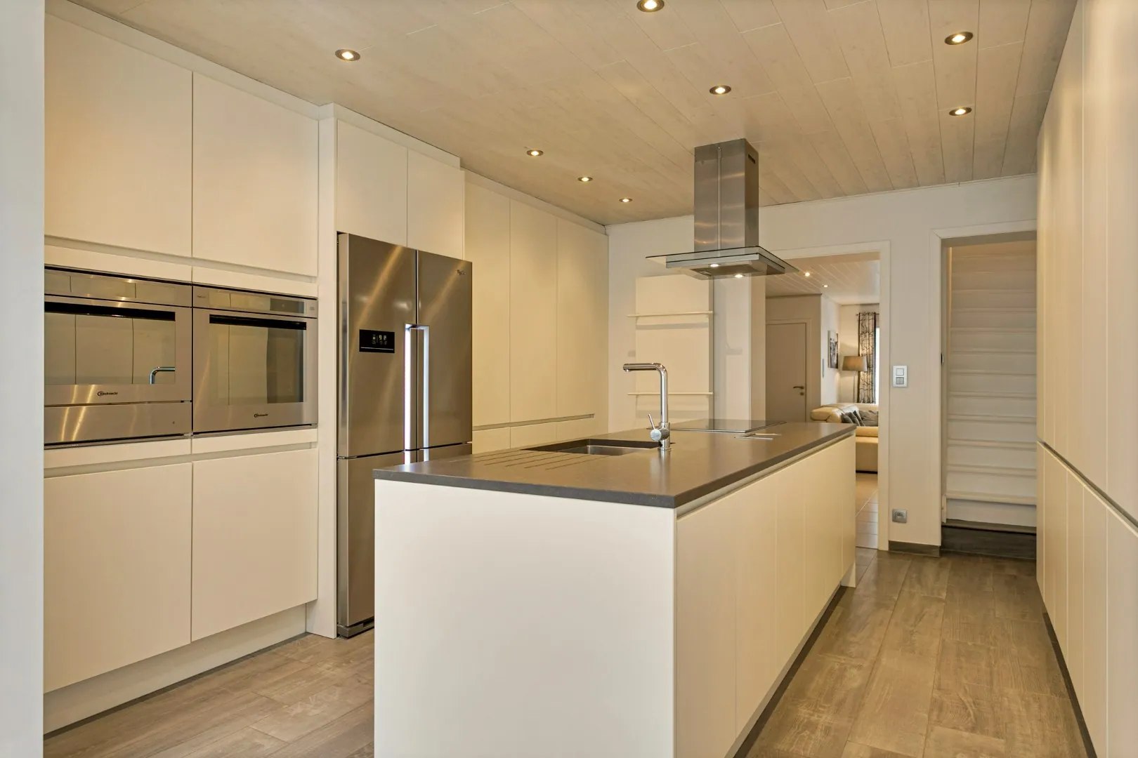 We betreden de woning in de inkomhal, met toegang tot de gezellige leefruimte. Aansluitend vinden we de lichtrijke, gerenoveerde (2016) keuken (inductiekookplaat, Amerikaanse koelkast, oven, microgolfoven, warmtelade en vaatwas) met eetplaats en een groot schuifraam die toegang biedt tot het sfeervolle stadstuintje. Naast de keuken vind je de wasplaats met extra bergruimte en een eerste toilet.