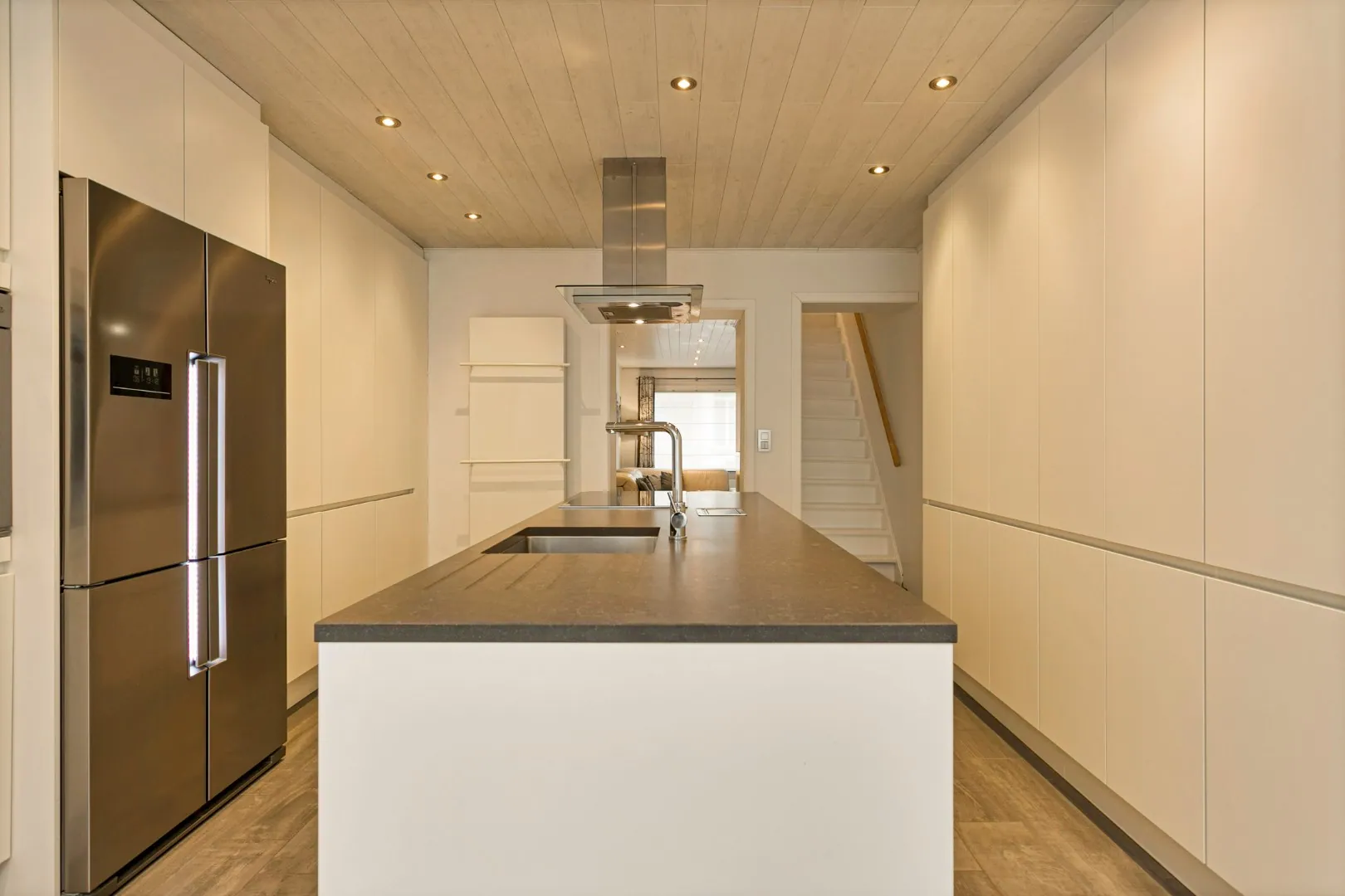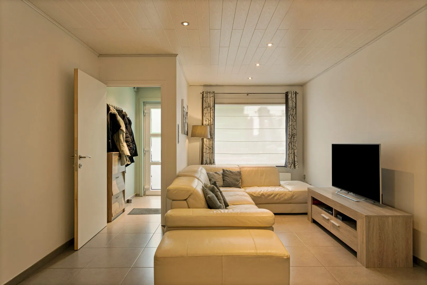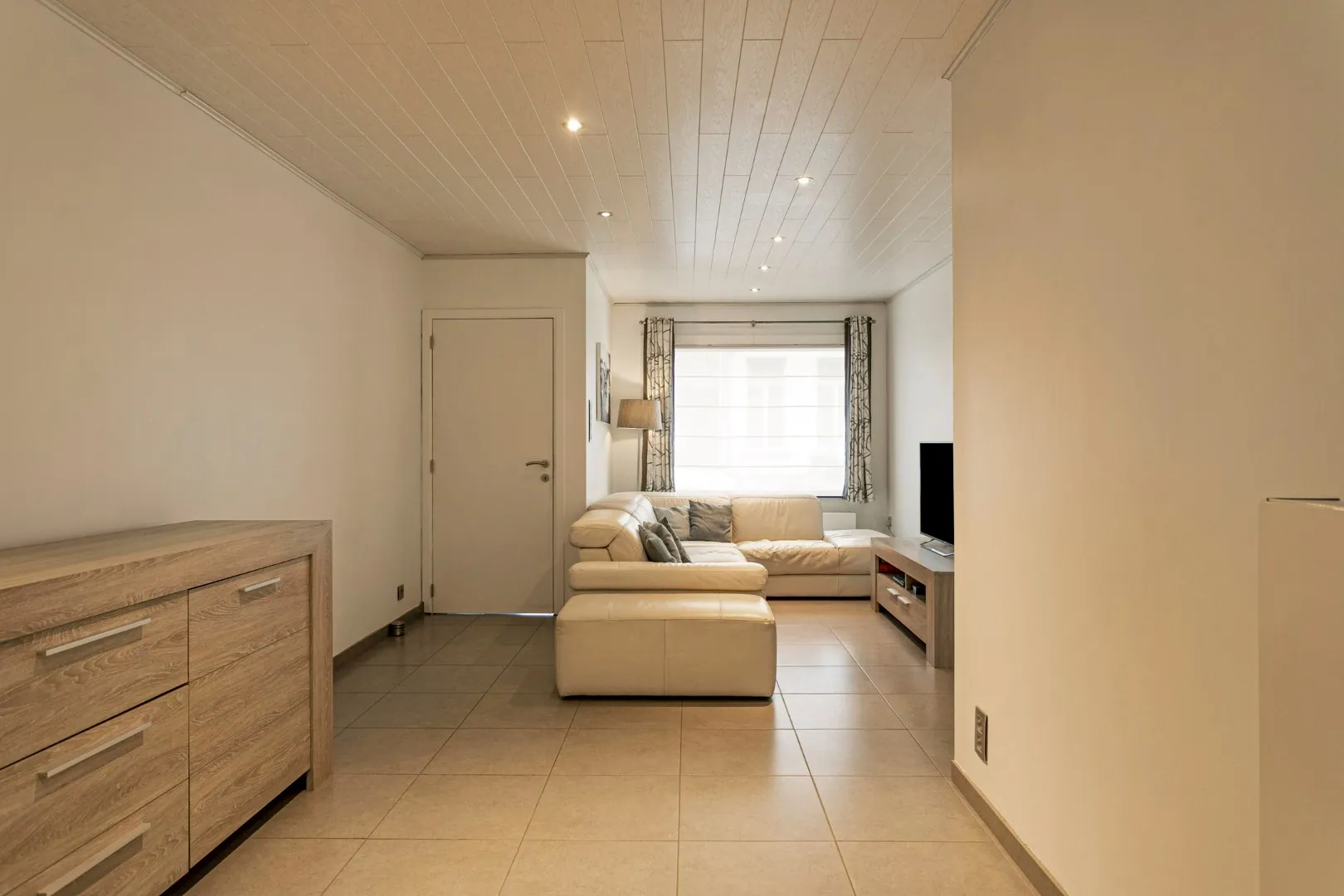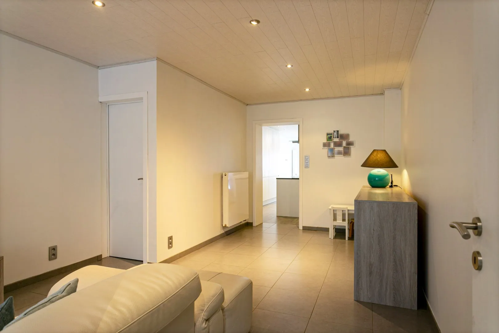 We betreden de woning in de inkomhal, met toegang tot de gezellige leefruimte. Aansluitend vinden we de lichtrijke, gerenoveerde (2016) keuken (inductiekookplaat, Amerikaanse koelkast, oven, microgolfoven, warmtelade en vaatwas) met eetplaats en een groot schuifraam die toegang biedt tot het sfeervolle stadstuintje. Naast de keuken vind je de wasplaats met extra bergruimte en een eerste toilet.