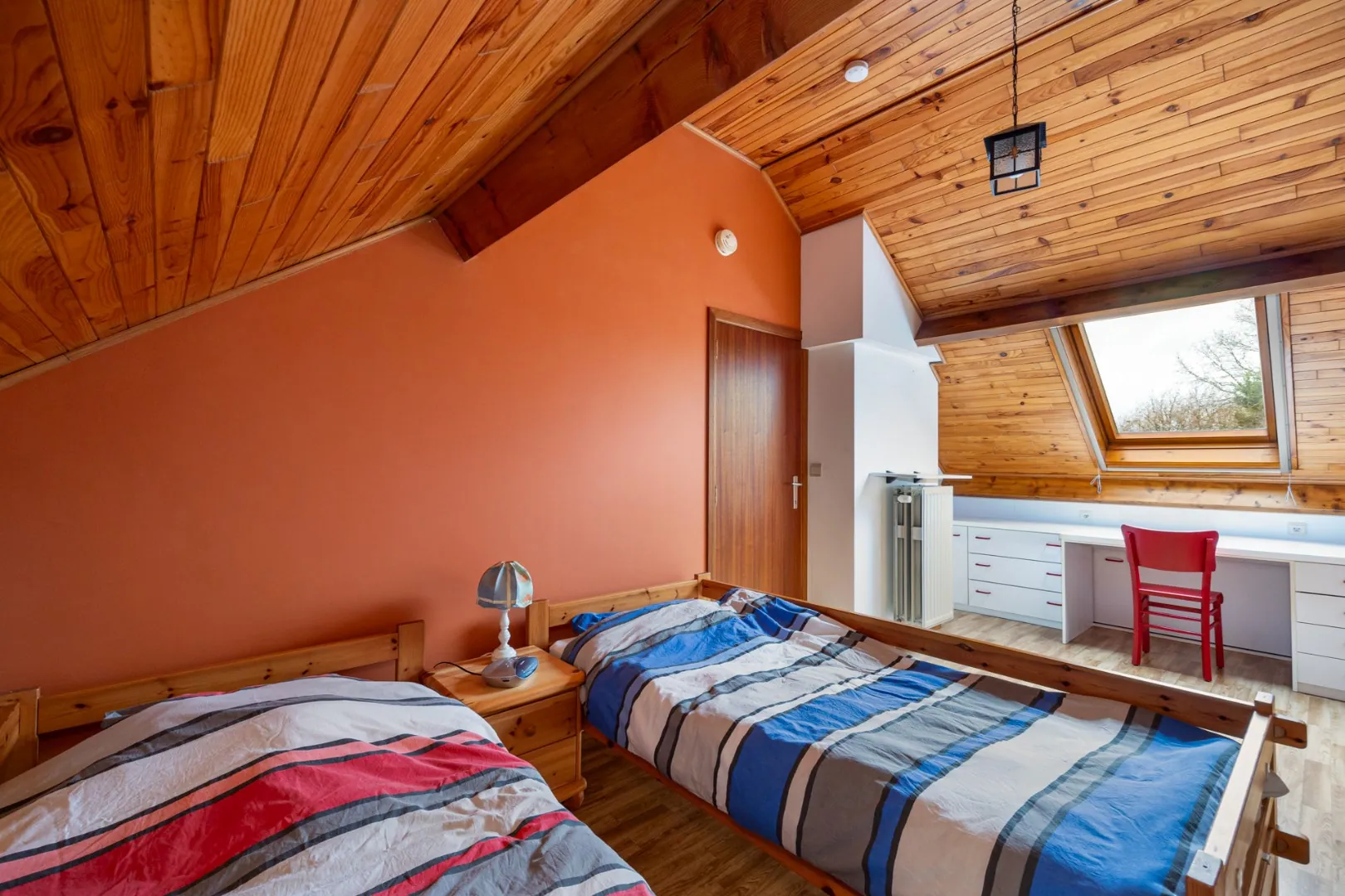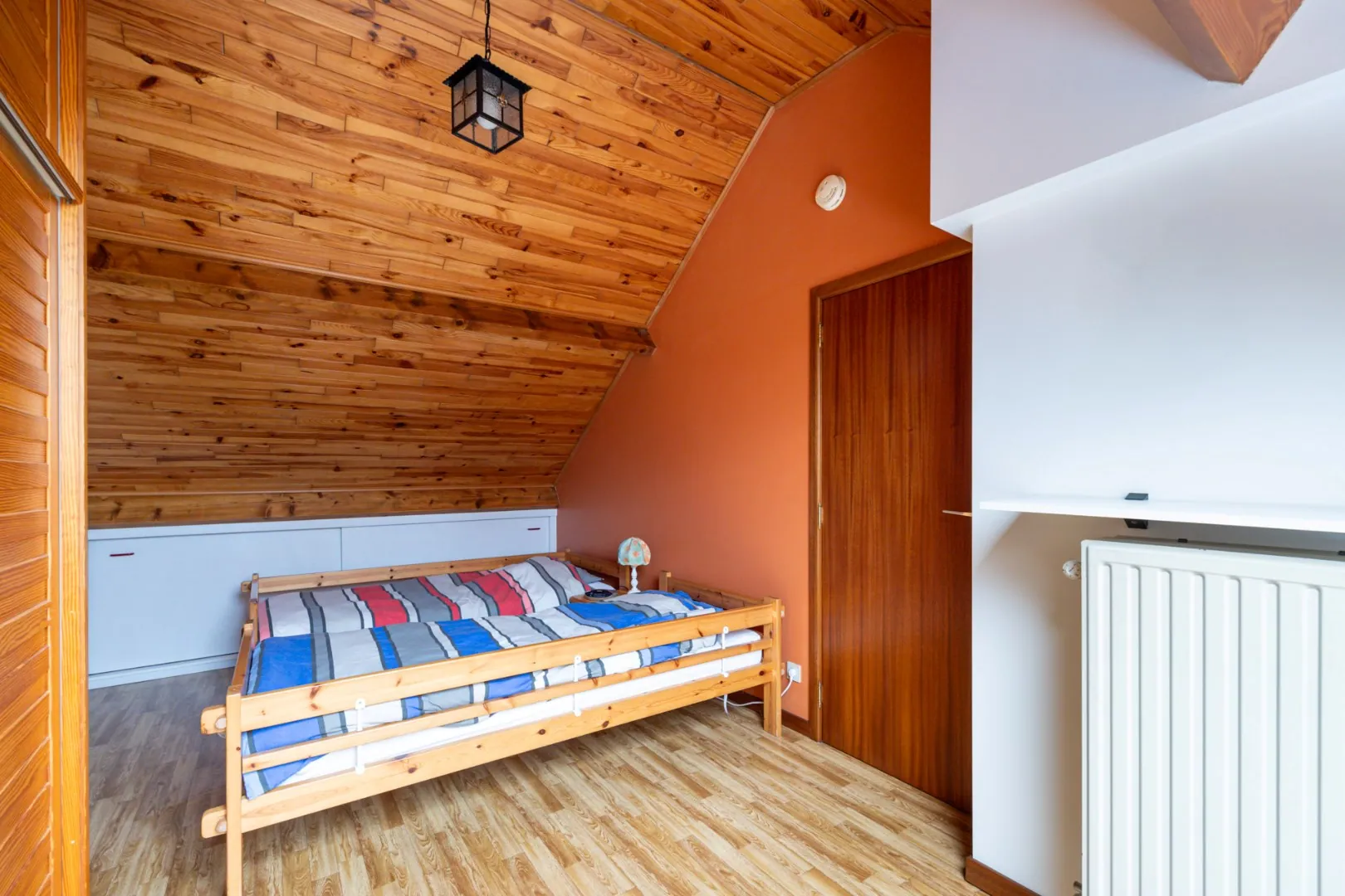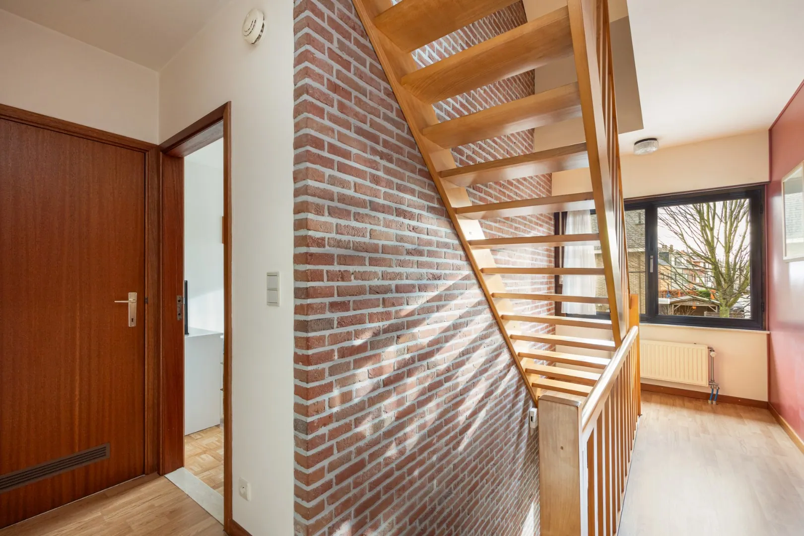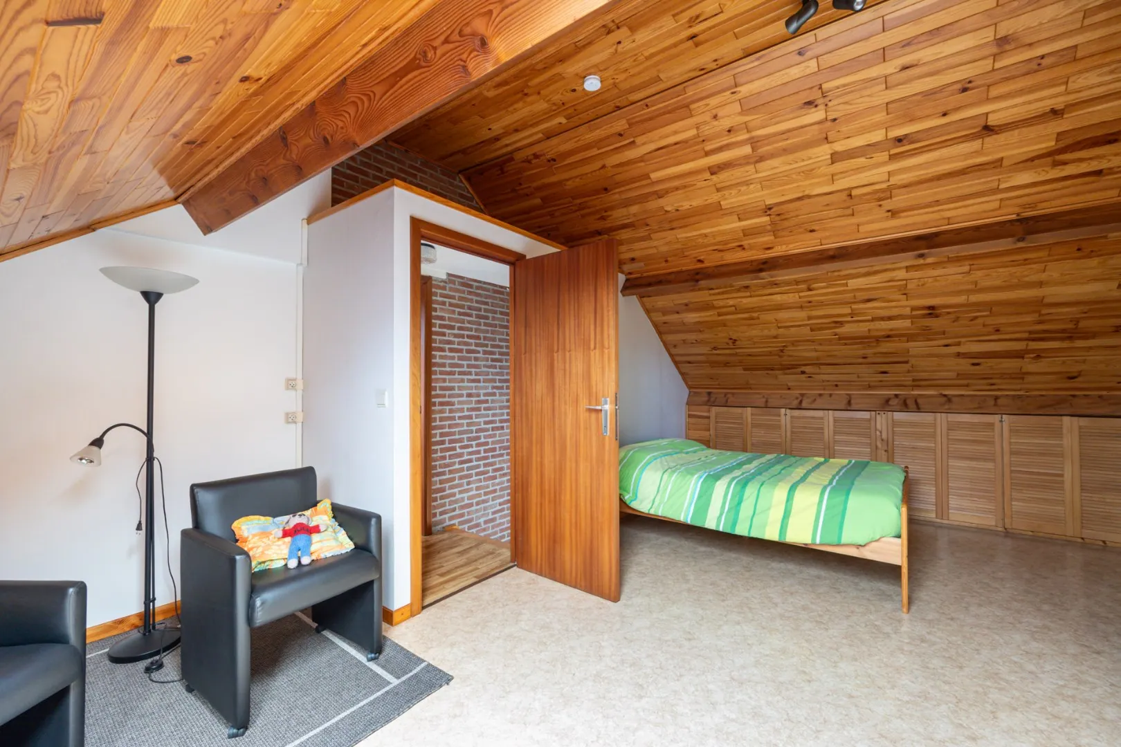 Op de eerste verdieping vinden we drie slaapkamer en de gerenoveerde badkamer met zowel bad als douche. De vaste trap brengt ons naar de zolderverdieping waar nog twee kamers aanwezig zijn.