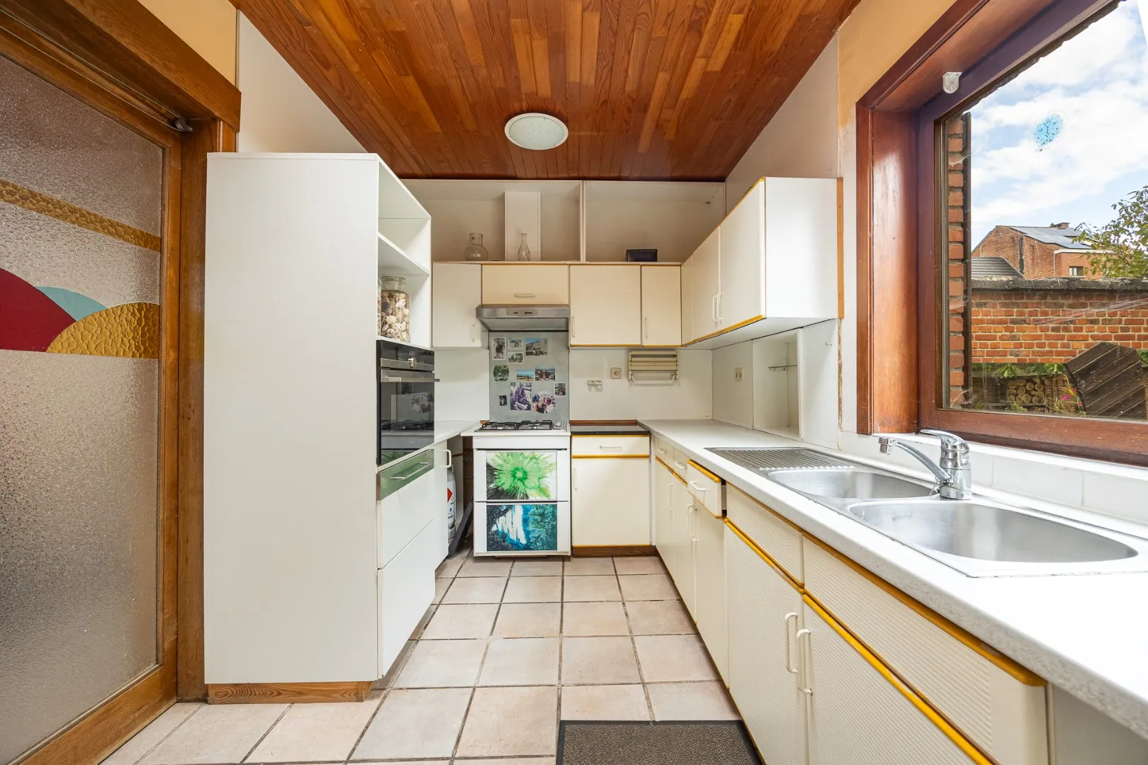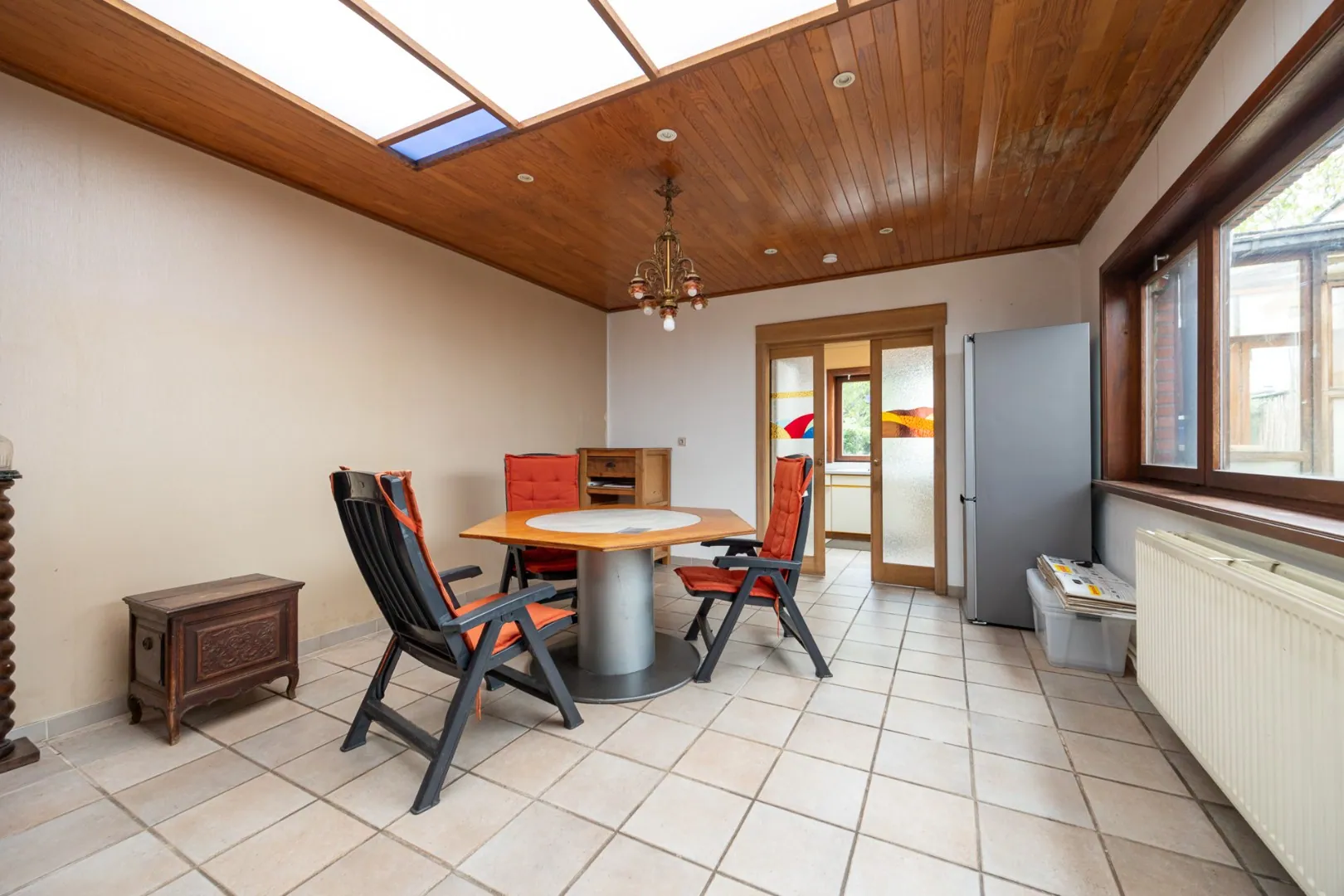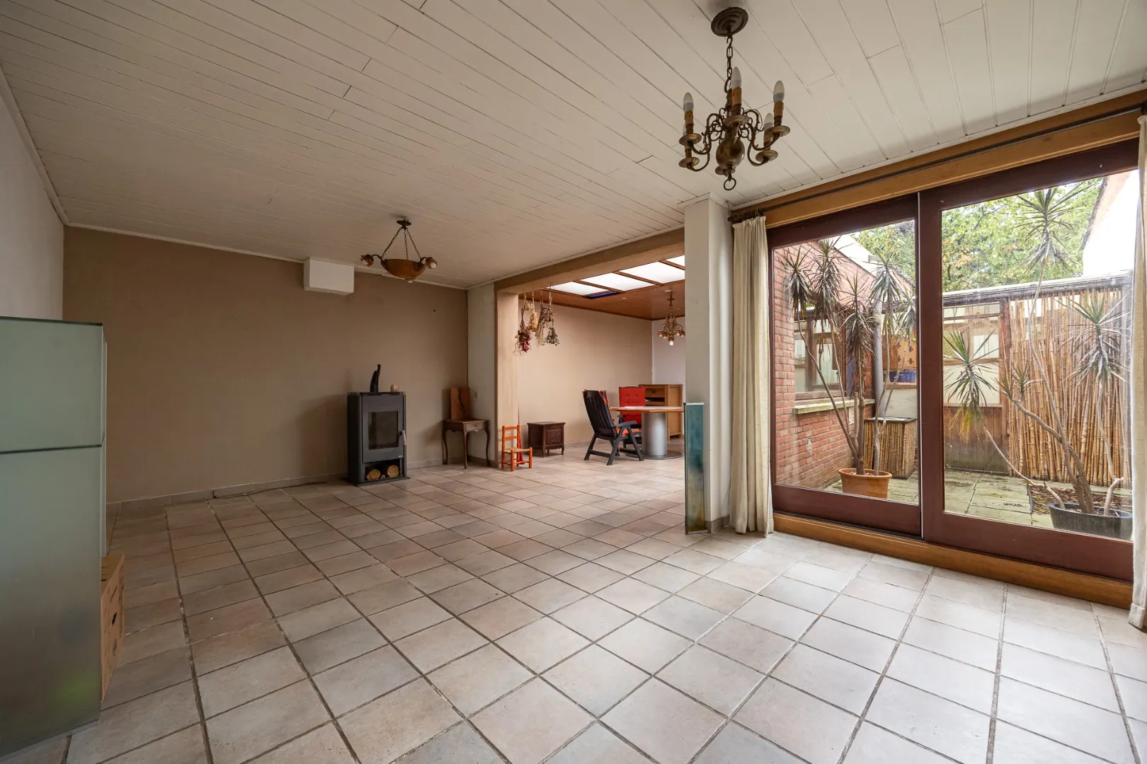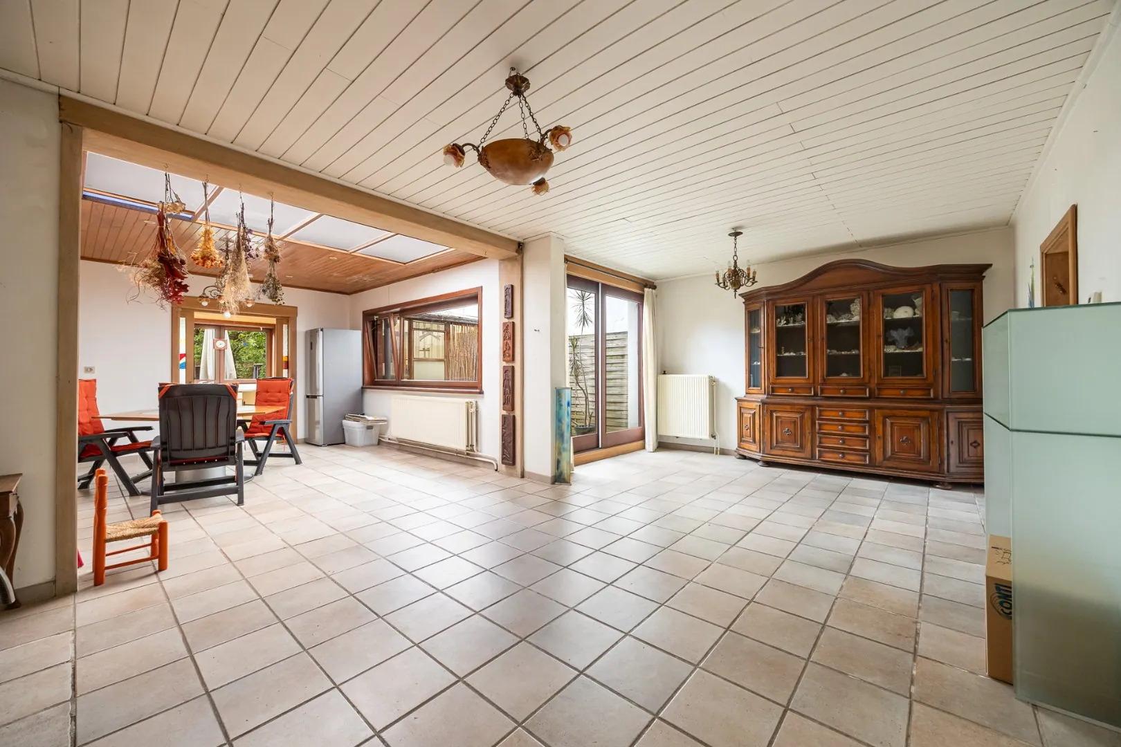 De leefruimte is ruim en gezellig, met een open connectie naar de keuken die uitkijkt op de tuin. Dankzij de raampartijen geniet u hier van veel natuurlijk licht en een aangename sfeer — ideaal voor wie houdt van binnen-buiten leven.