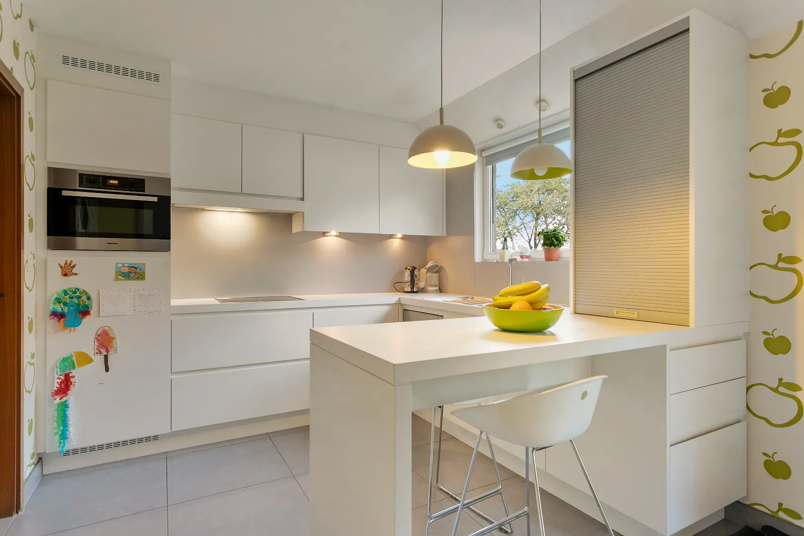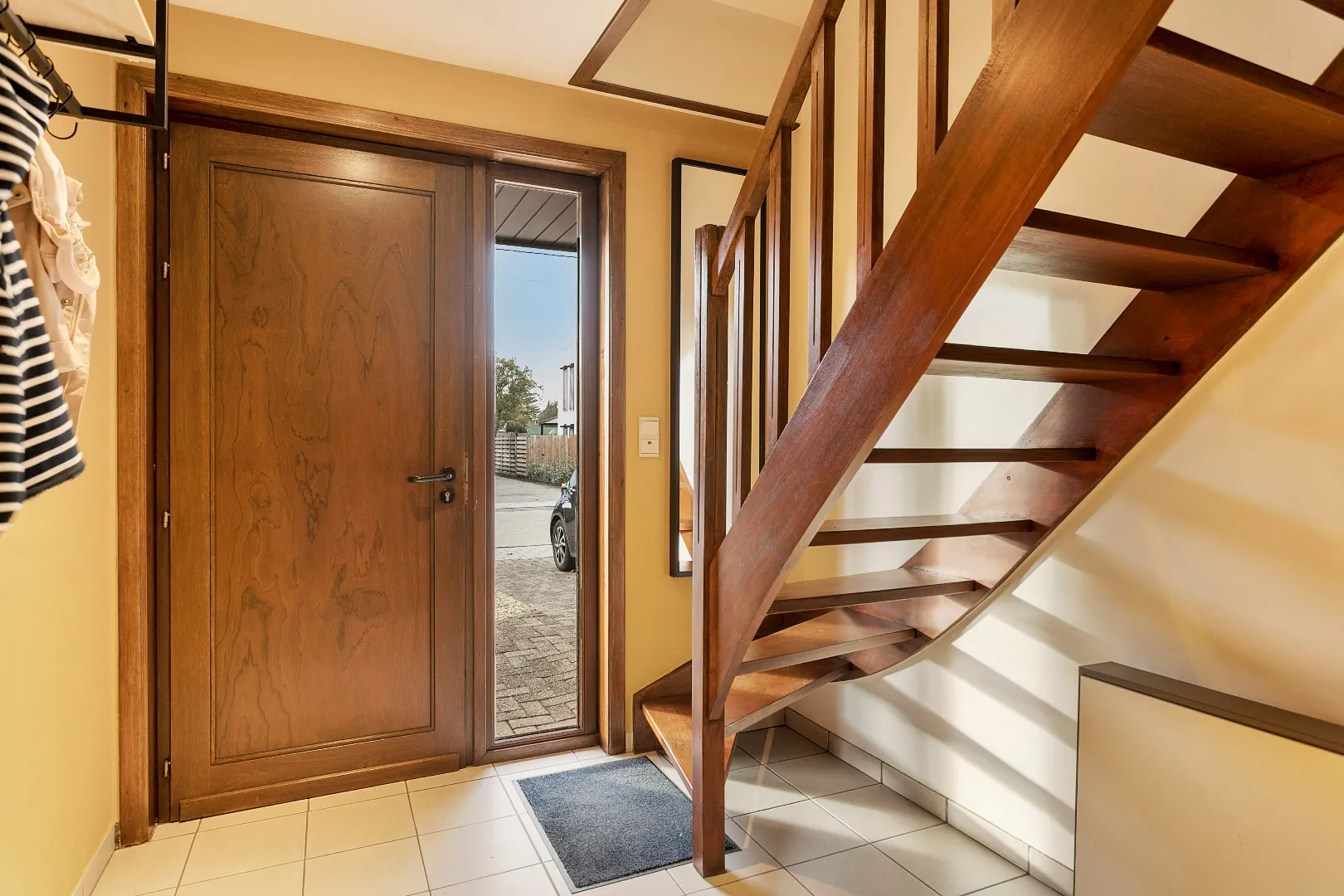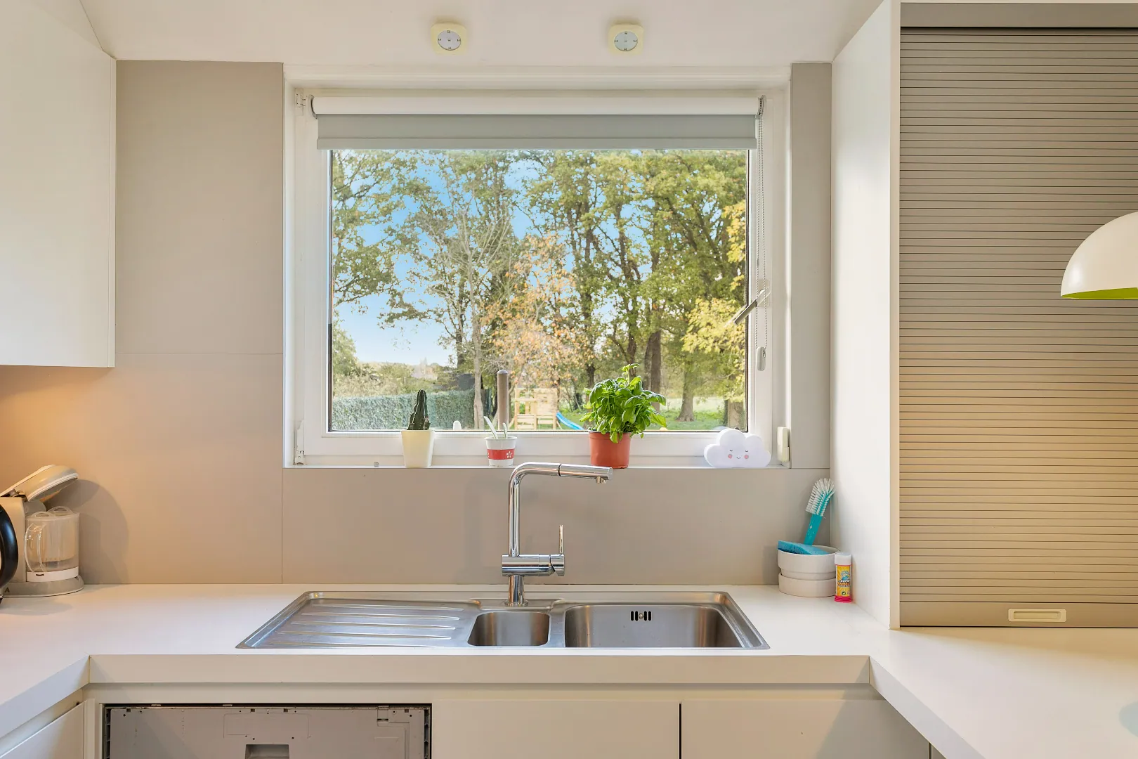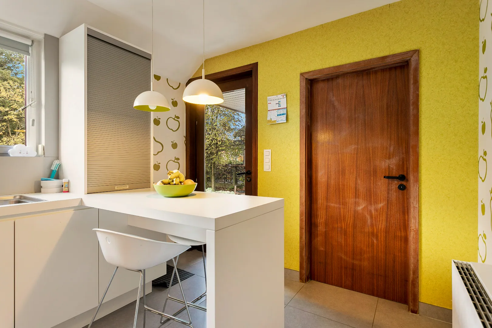 We betreden de woning via de inkomhal, die ons naar de ruime, lichtrijke woonkamer brengt. Door de vele raampartijen heeft u een prachtig zicht op de groene tuin met vergezichten. Aansluitend vindt u de volledig gerenoveerde keuken voorzien van alle nodige toestellen (vaatwas, koelkast, oven) en een aparte berging/wasplaats. Verder is er op het gelijkvloers nog een ruime garage.