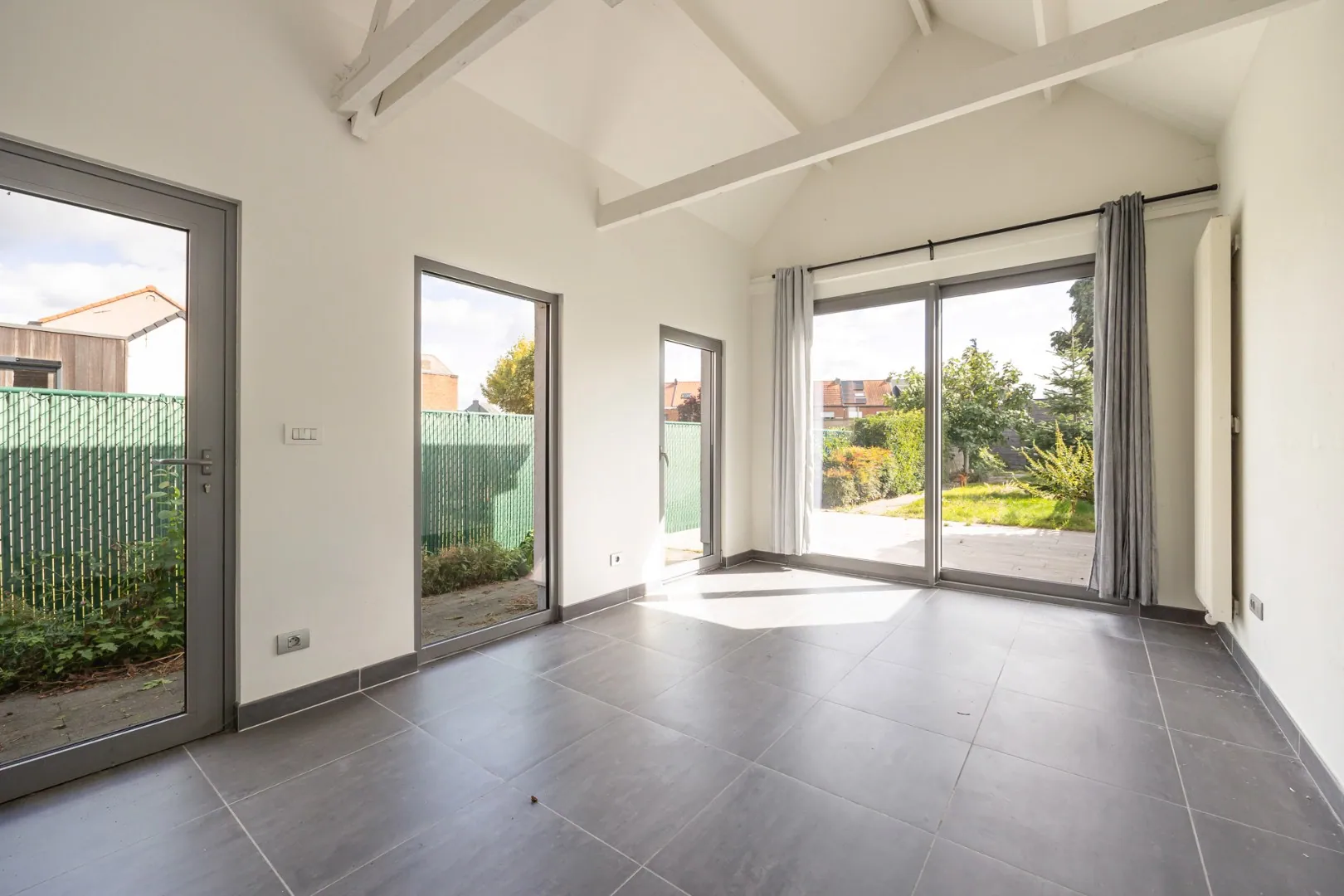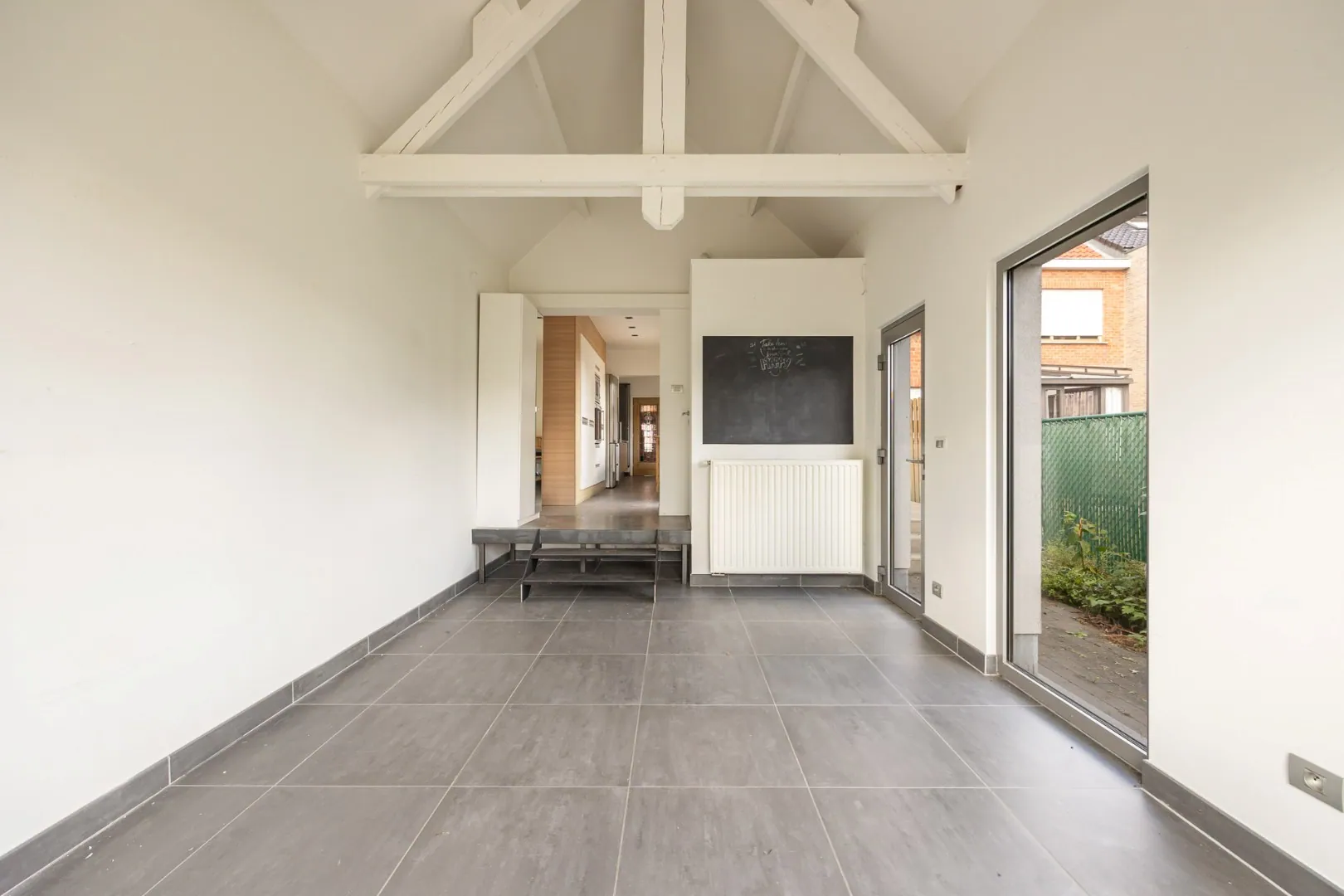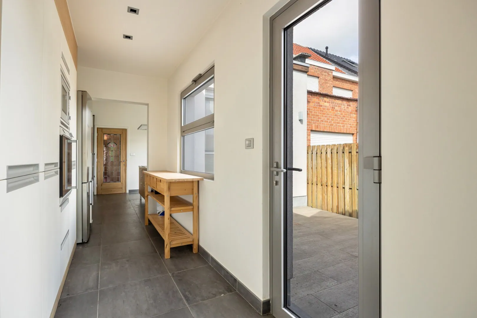 Bij binnenkomst wordt u meteen verrast door de zeer ruime leefruimte met aansluitende keuken en bijkeuken, ideaal voor gezellige familiemomenten. Daarnaast is er een polyvalente ruimte die rechtstreeks uitgeeft op de tuin: perfect als tweede leefruimte, bureau of speelkamer.