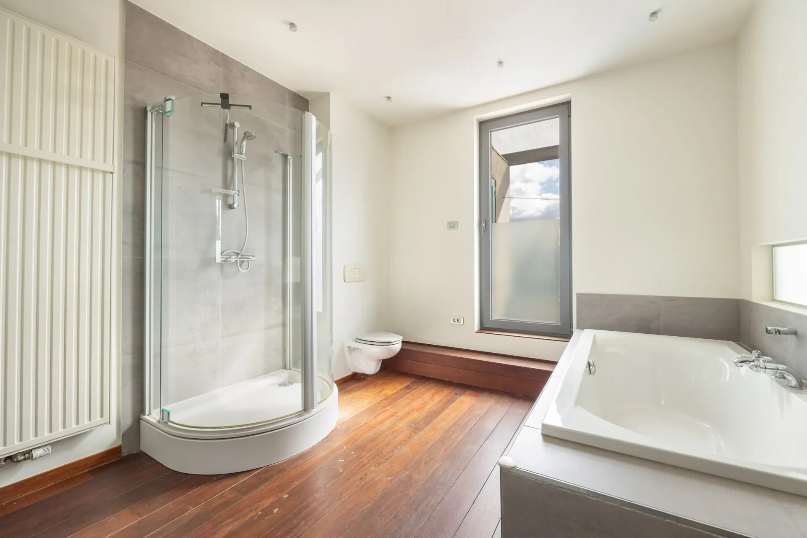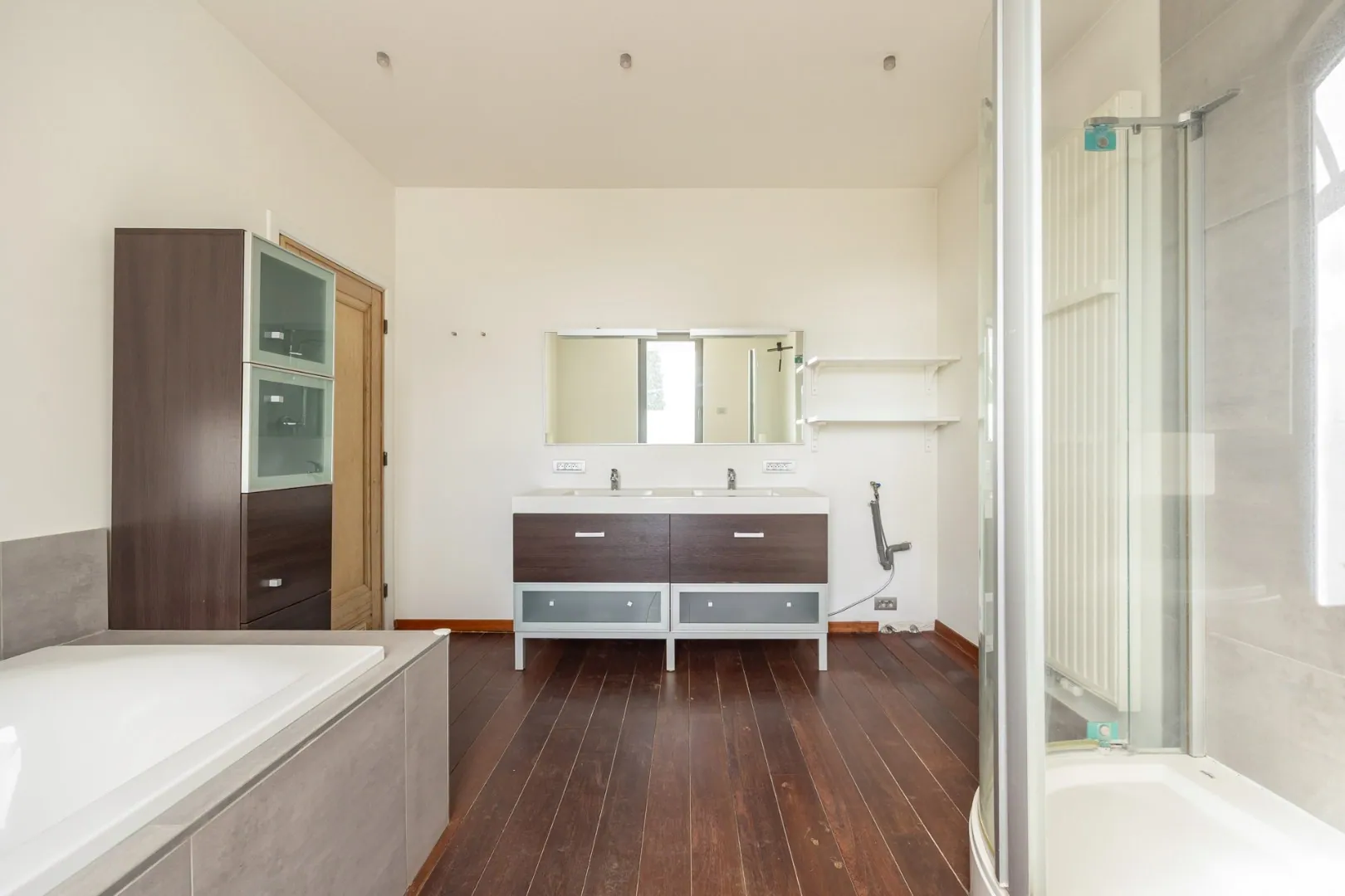 De woning telt drie volwaardige slaapkamers en een badkamer uitgerust met bad, douche en dubbele lavabo.