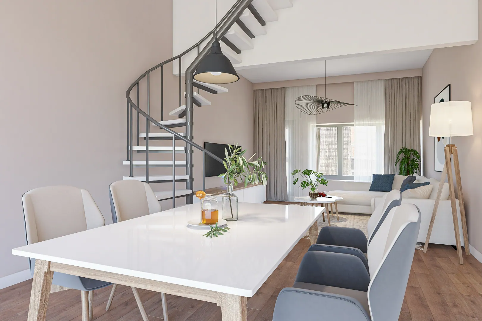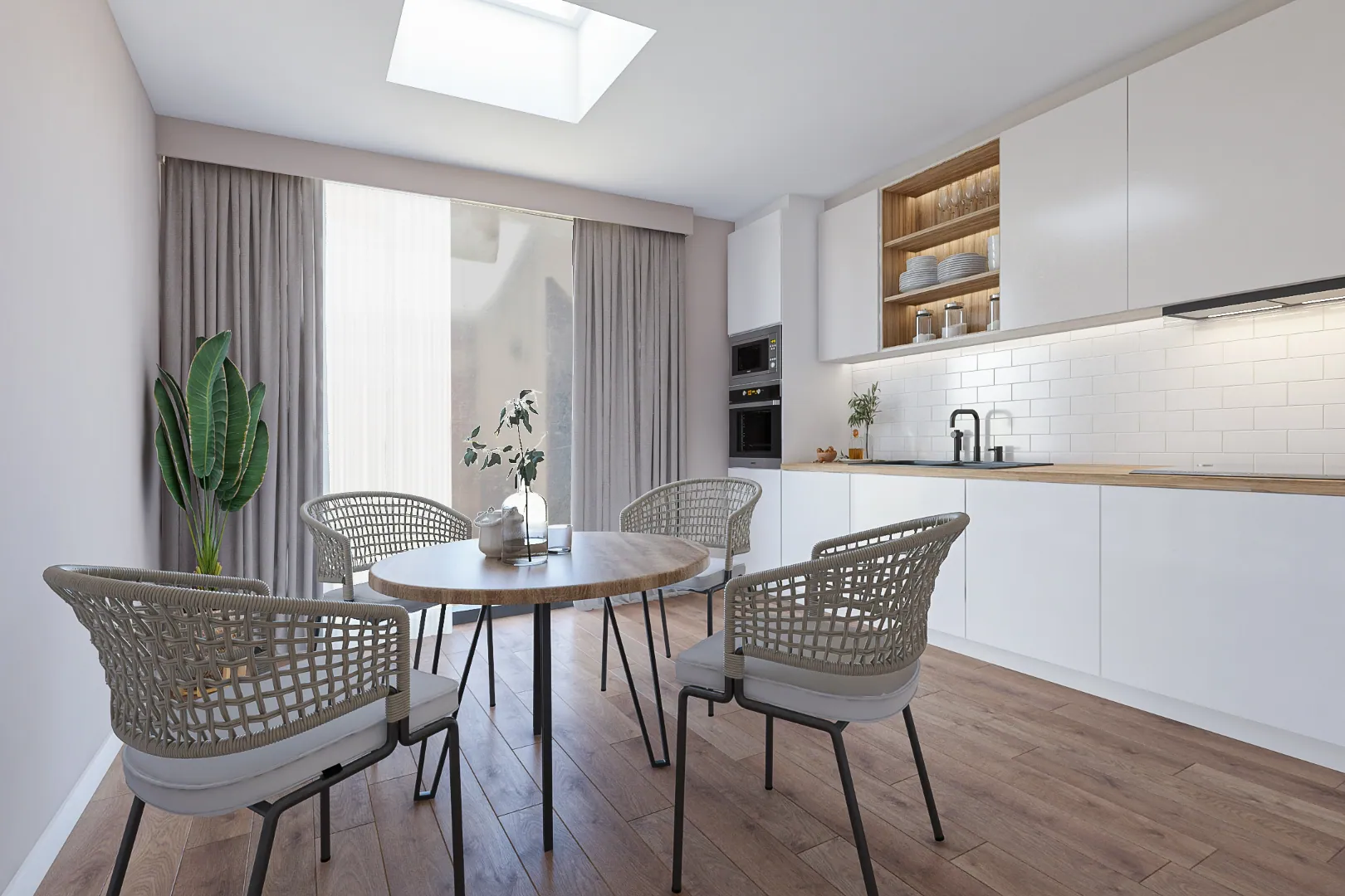 We betreden de woning en komen meteen in de woonkamer met aansluitend een ruimte voor het creëren van een halfopen keuken.