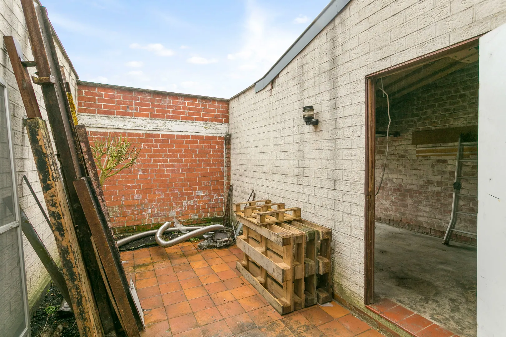 Achteraan de woning vinden we een inpandig terras die ons via de achteringang naar de privatieve garagebox brengt.