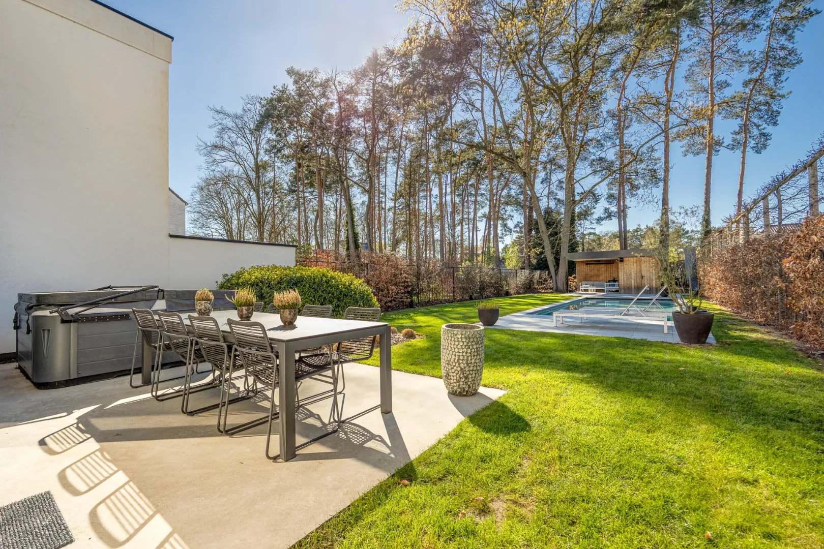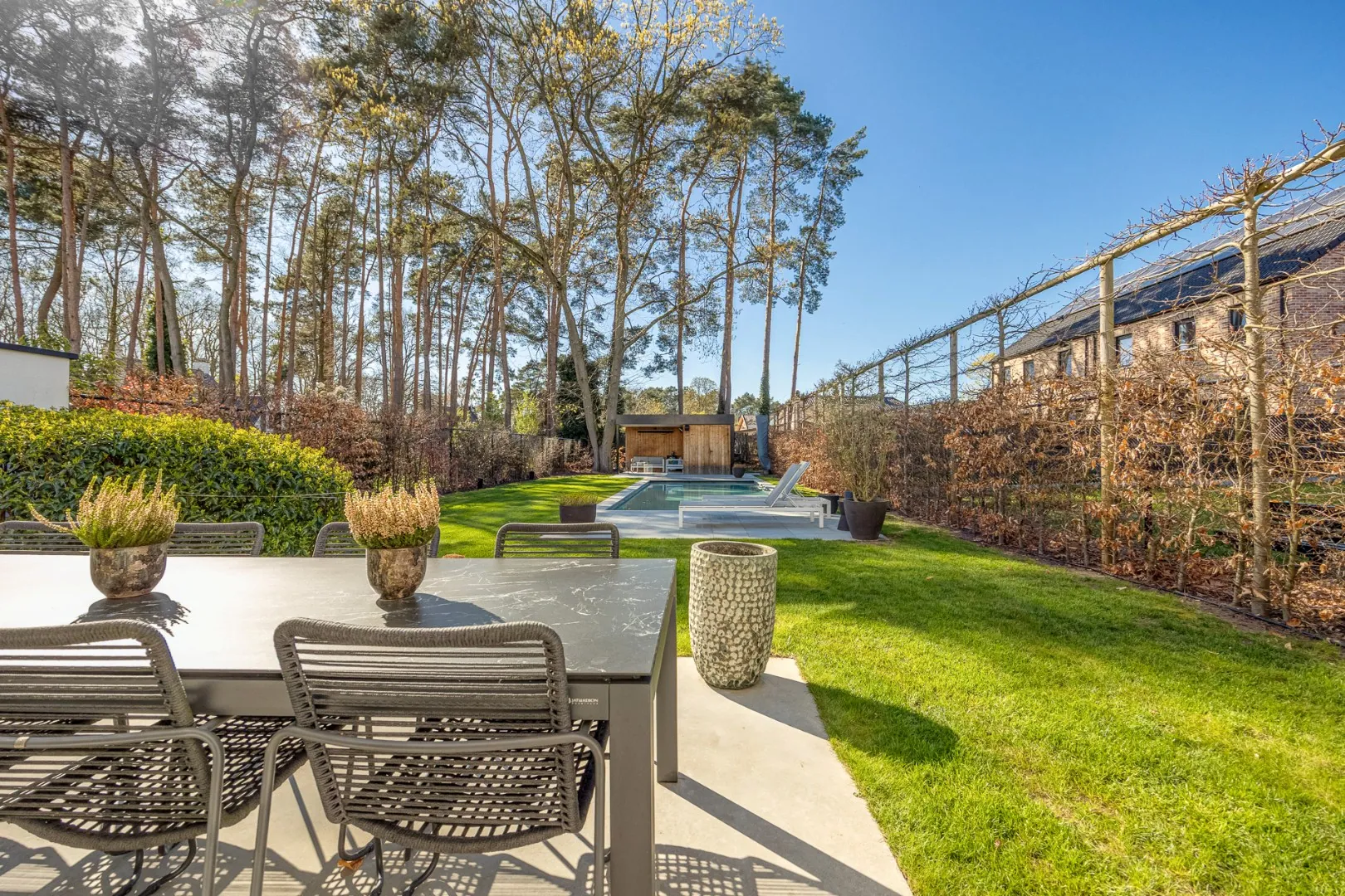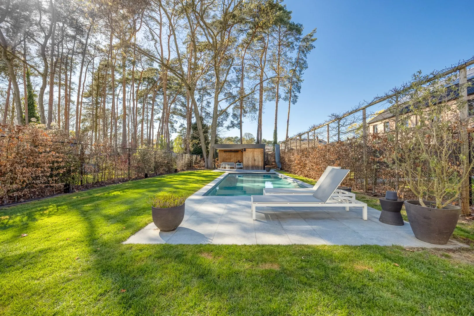 Buiten wordt u verrast door een prachtige tuin met een luxueus zwembad en een sfeervol poolhouse – de perfecte plek om te ontspannen of gasten te ontvangen tijdens zonnige dagen.